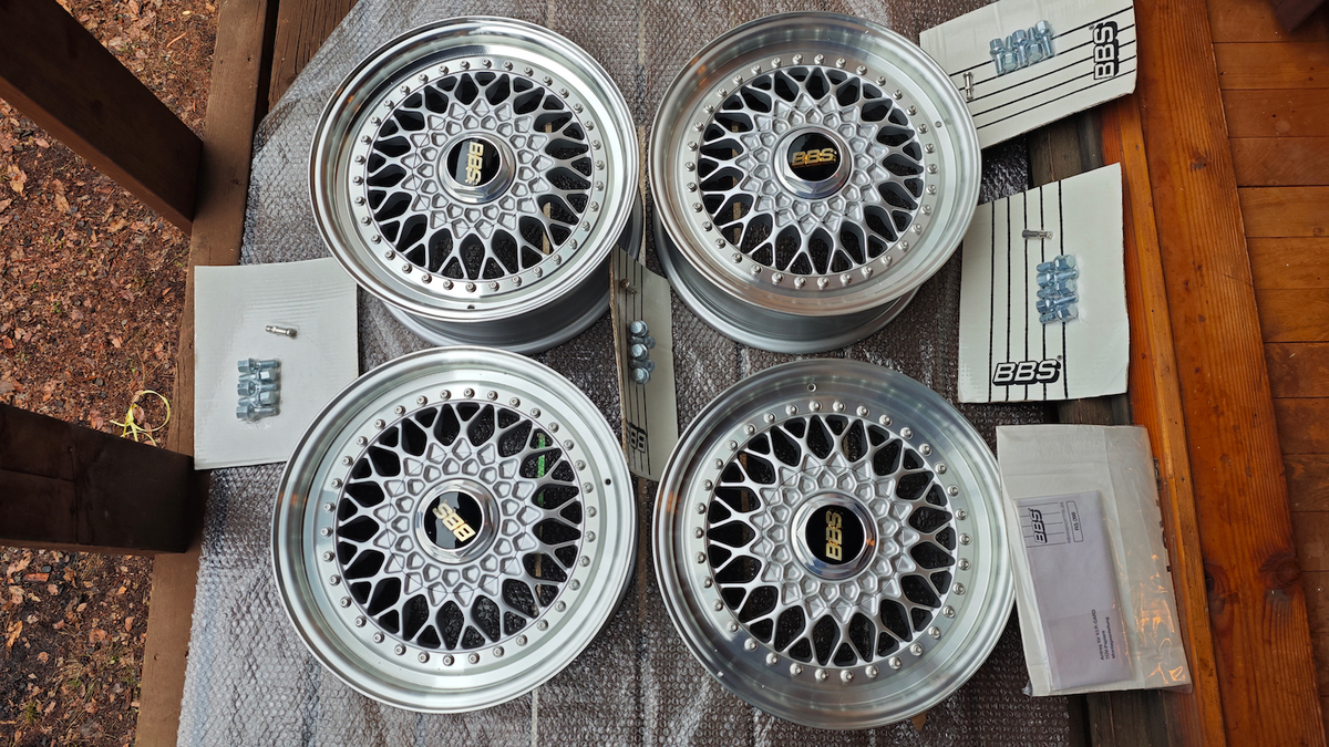These 3-piece 16" BBS RS 098 wheels are new old stock in their original BBS boxes. They measure 7″ wide all around and were manufactured by BBS in Germany for use on Mercedes-Benz vehicles. The faces are finished in silver and accented with polished lips and BBS hardware. Dimensions, offsets, and other manufacturer casting marks are present on each wheel and four BBS center caps, 20 BBS lug bolts, and 4 steel valve stems are included. All four wheels have never been mounted or used and the original TUV inspection documents are included. These authentic BBS RS wheels are now offered by the seller in Mishima, Japan with worldwide shipping options available.