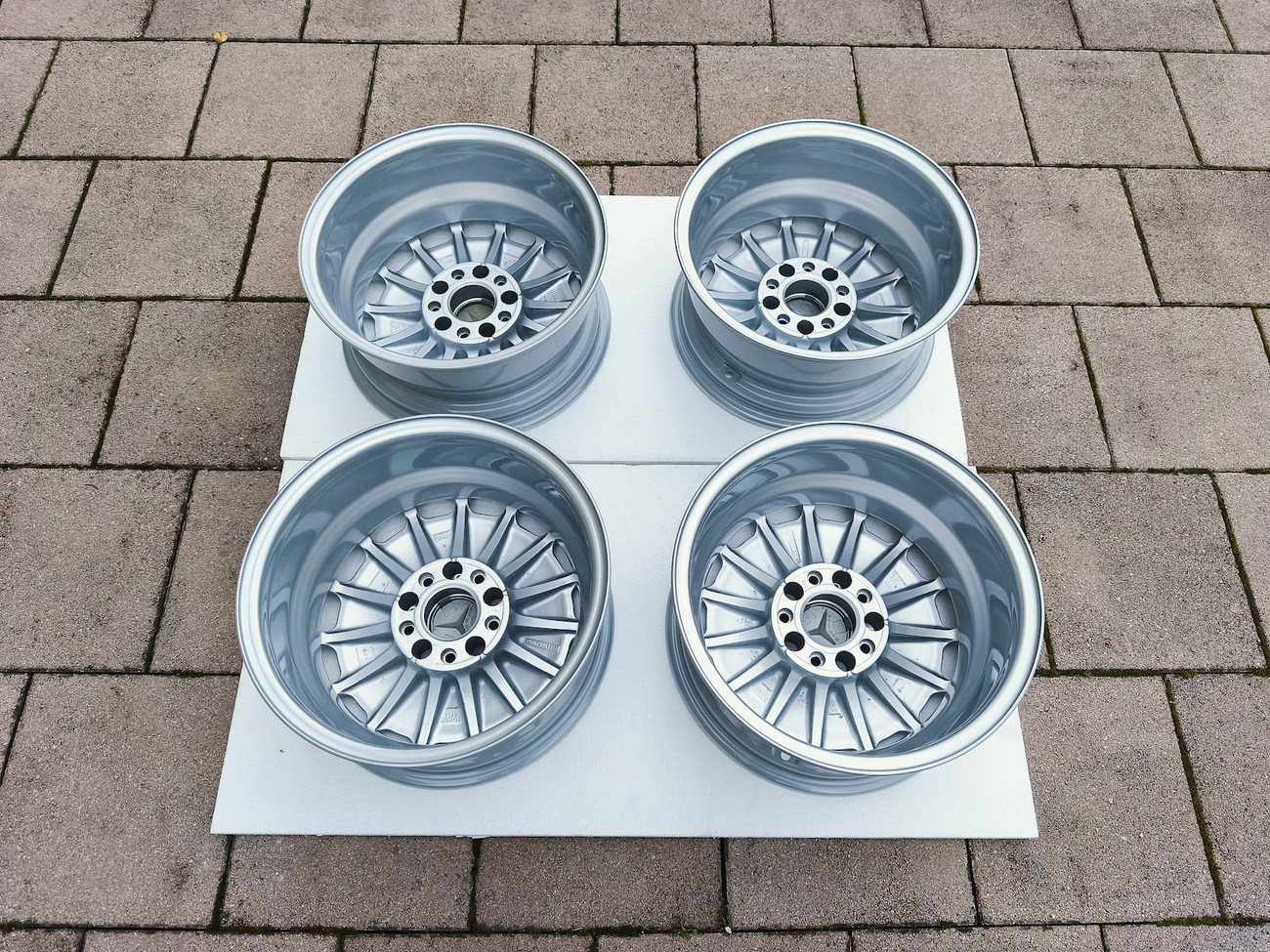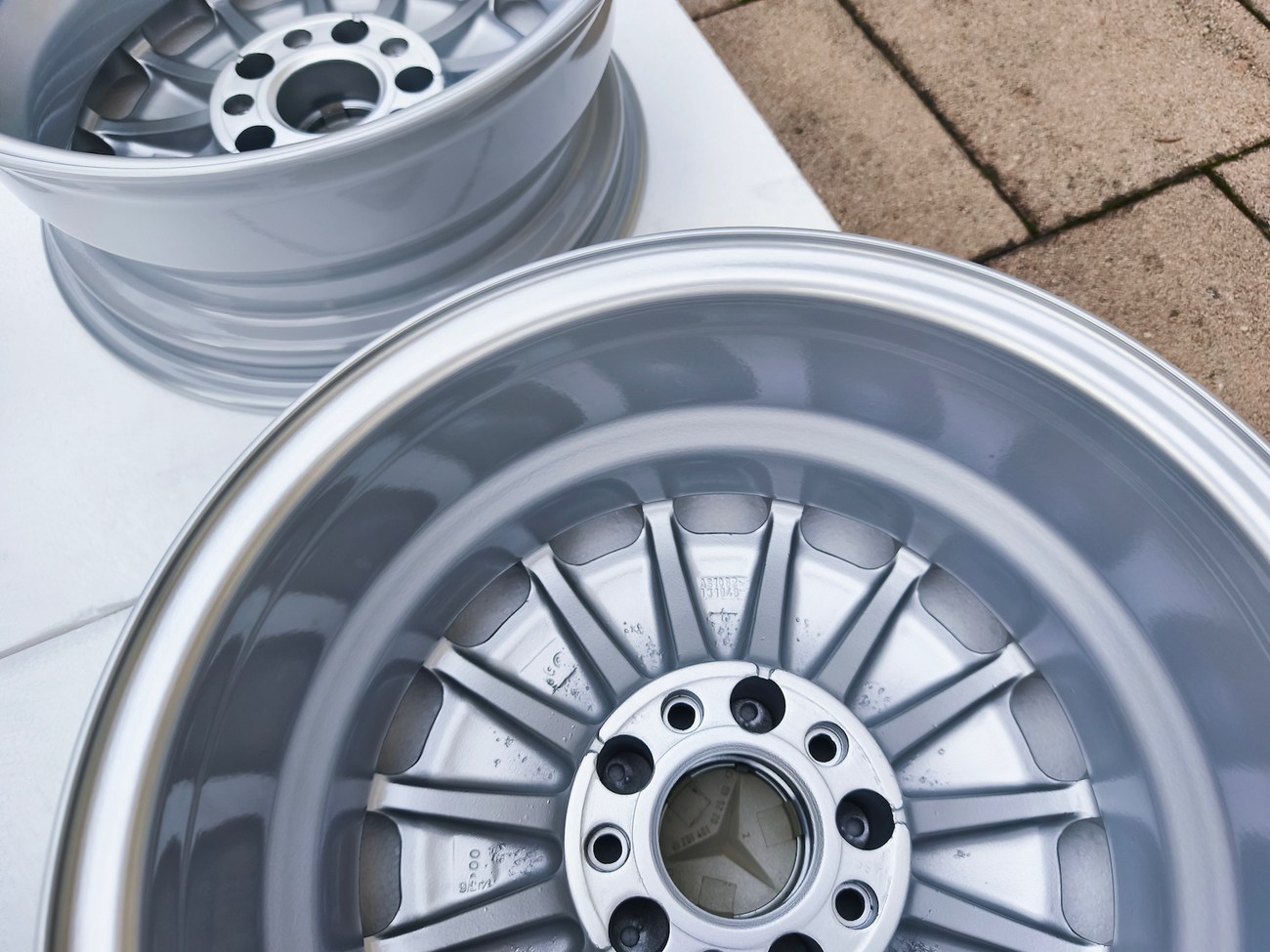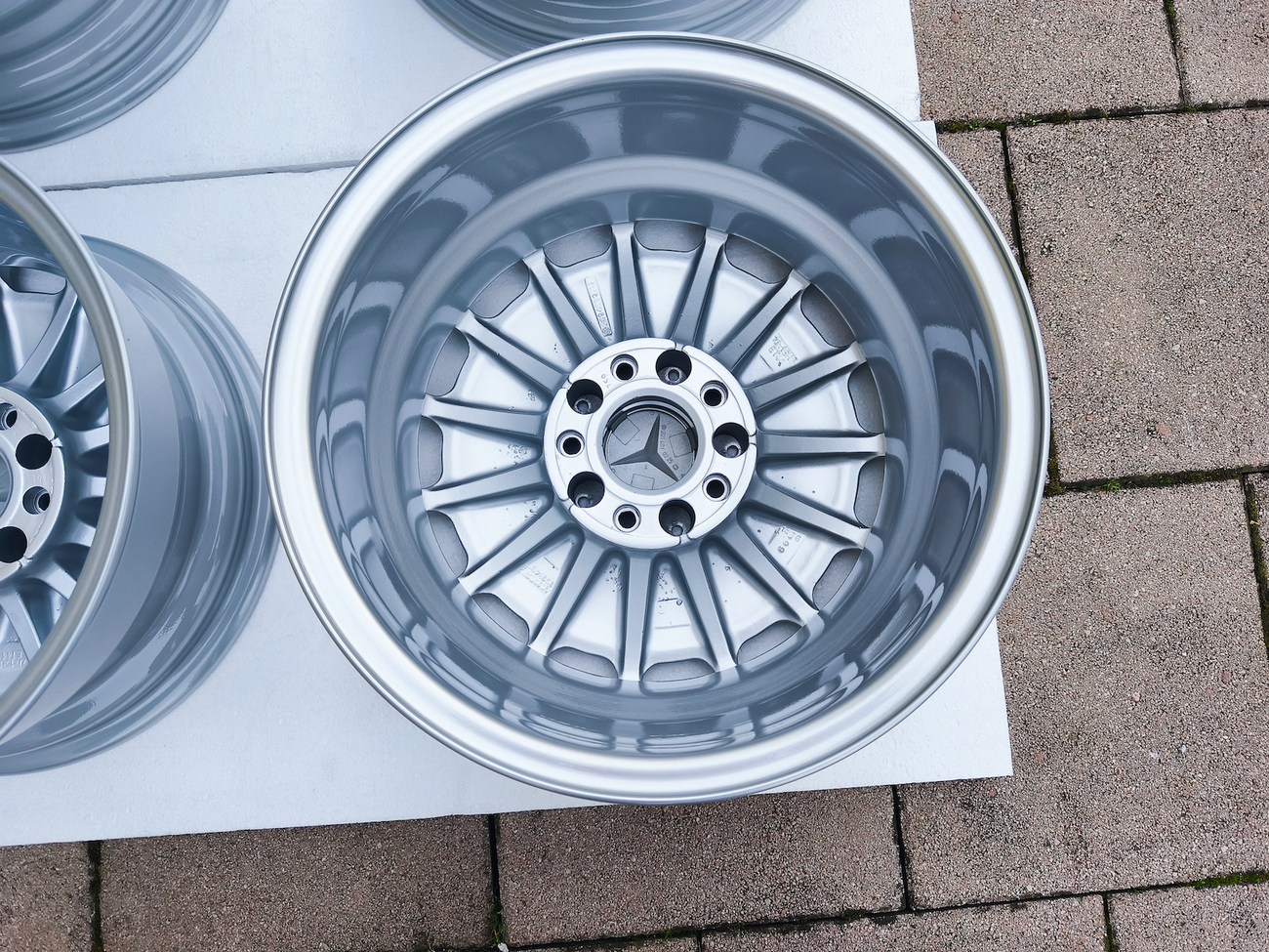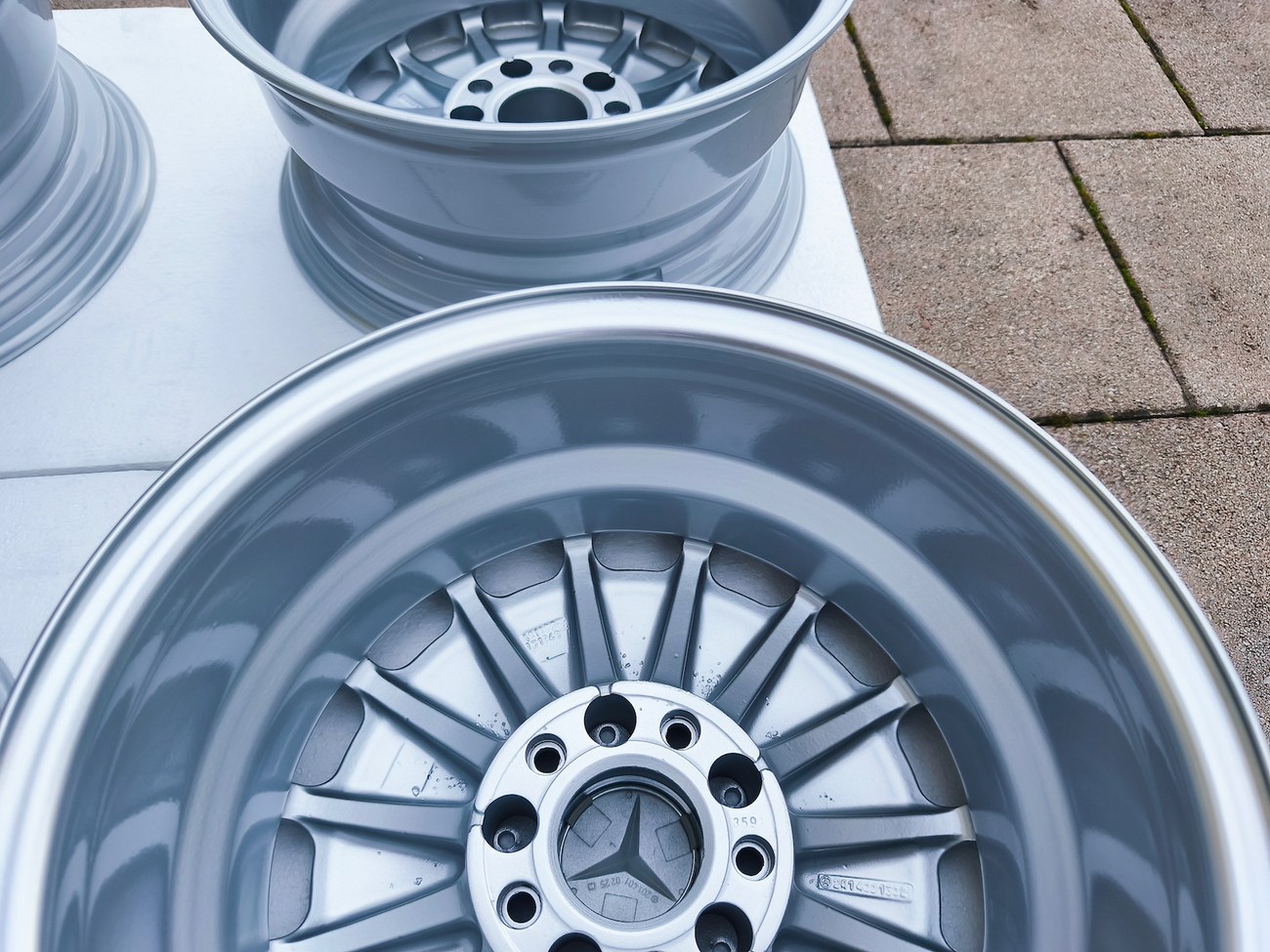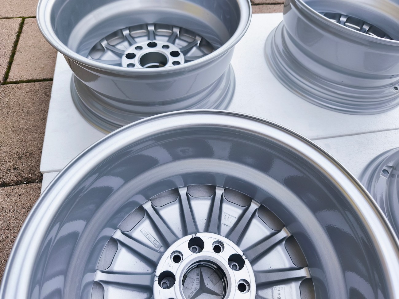 These OEM Mercedes-Benz 15" Gullideckel wheels measure 7″ in width for all four wheels and include factory center caps. Manufactured by Mercedes-Benz in Germany for use on W201 2.3-16v Cosworth and Sportline equipped vehicles, the wheels have been professionally refinished and feature a silver powder coated finish. Dimensions, offsets, and other manufacturer casting marks are present on each wheel and detailed pictures of the front and rear are provided. These factory Gullideckel wheels are now offered by the seller in Samobor, Croatia with worldwide shipping available.