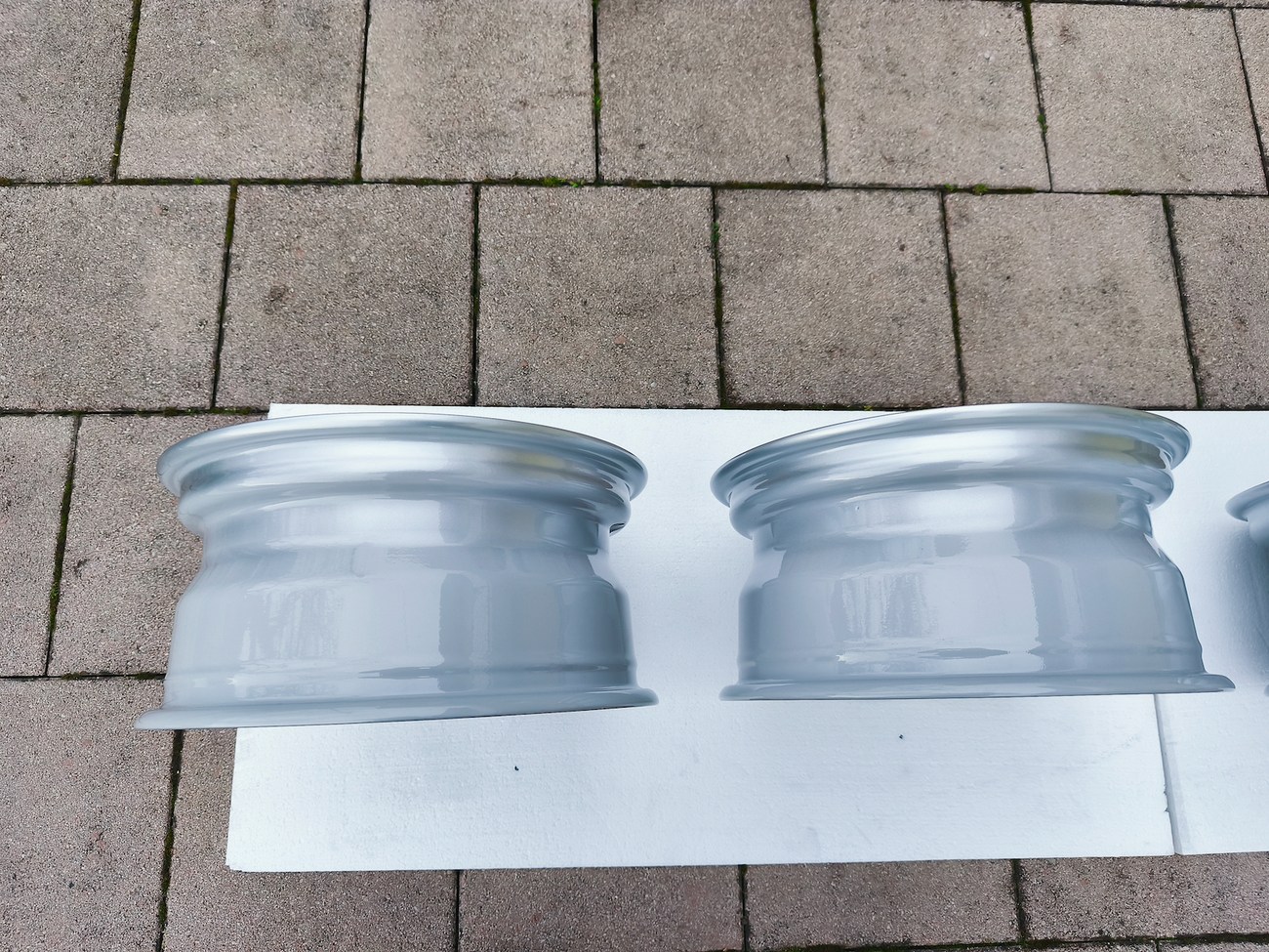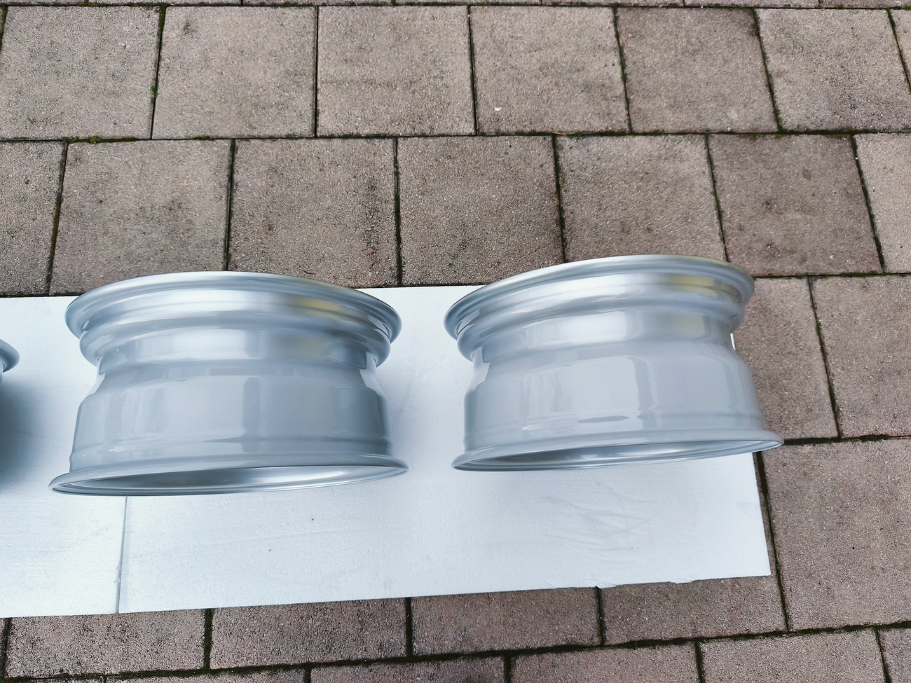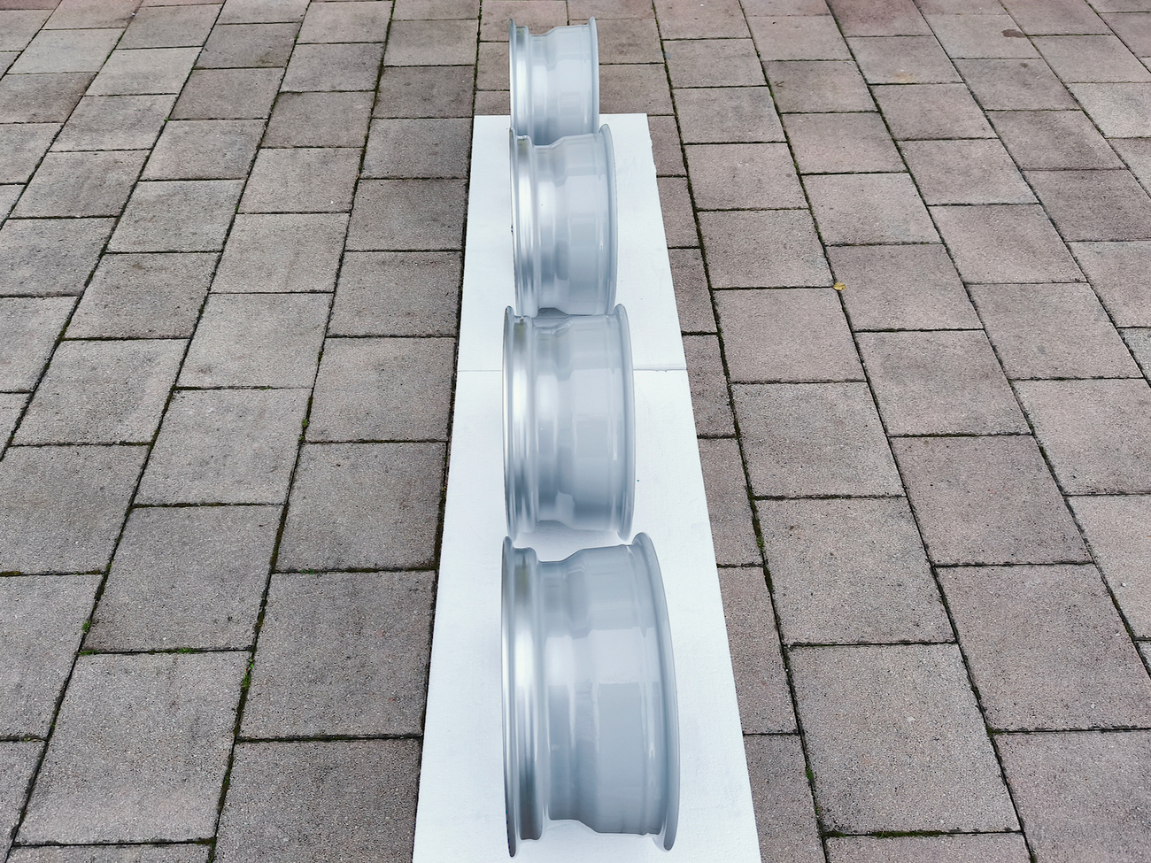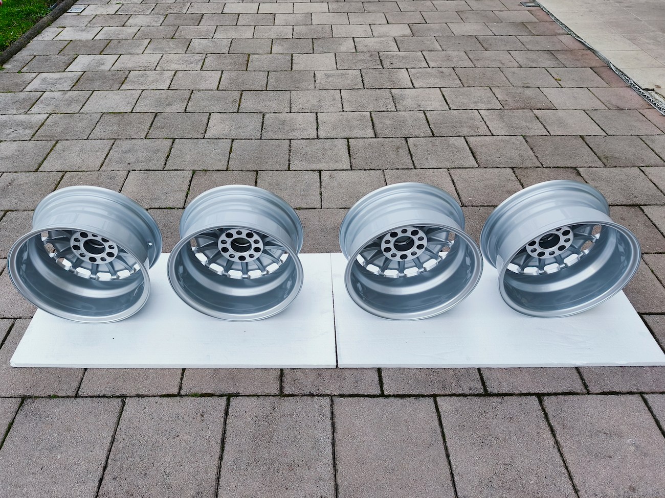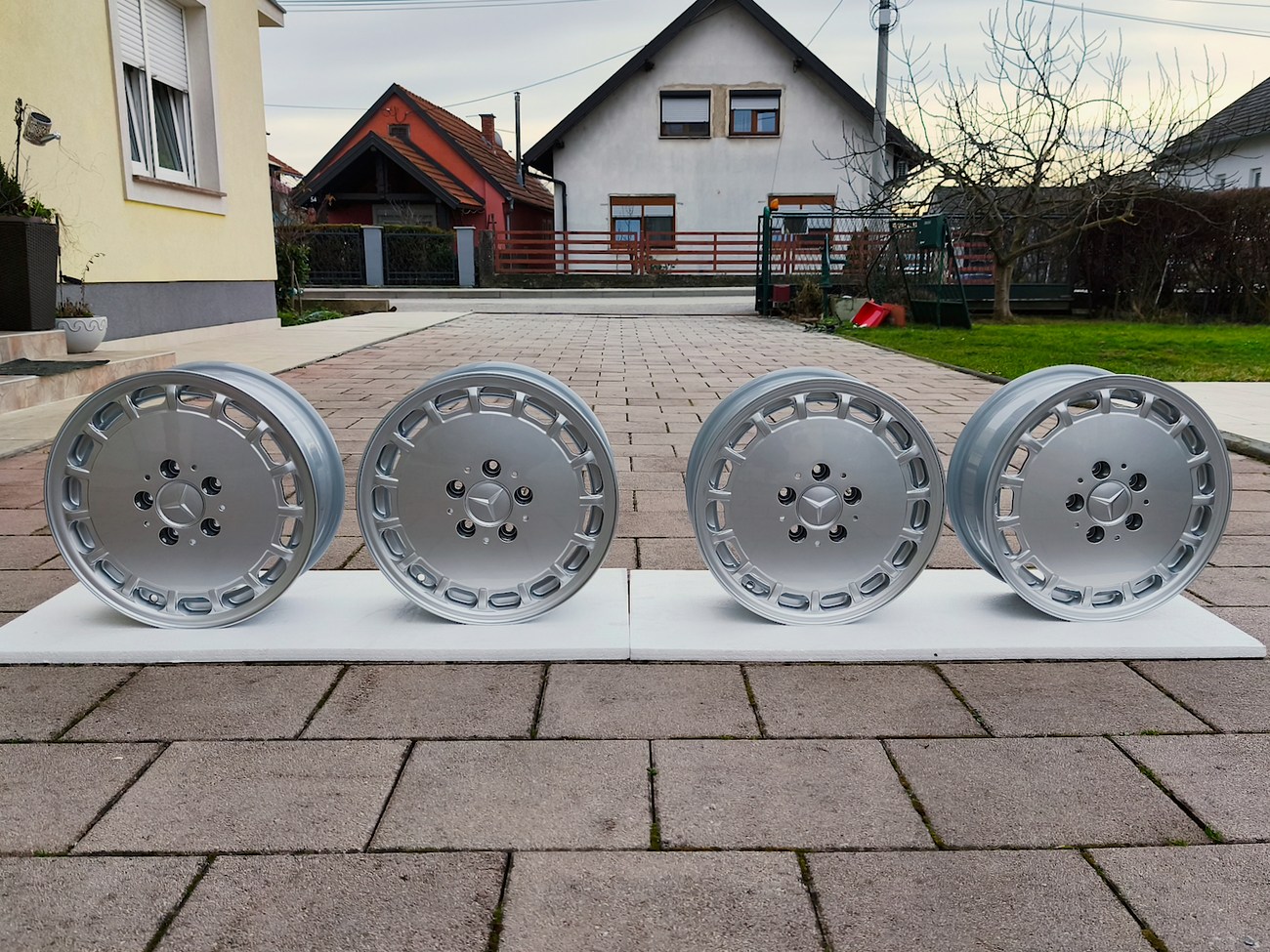 These OEM Mercedes-Benz 15" Gullideckel wheels measure 7″ in width for all four wheels and include factory center caps. Manufactured by Mercedes-Benz in Germany for use on W201 2.3-16v Cosworth and Sportline equipped vehicles, the wheels have been professionally refinished and feature a silver powder coated finish. Dimensions, offsets, and other manufacturer casting marks are present on each wheel and detailed pictures of the front and rear are provided. These factory Gullideckel wheels are now offered by the seller in Samobor, Croatia with worldwide shipping available.