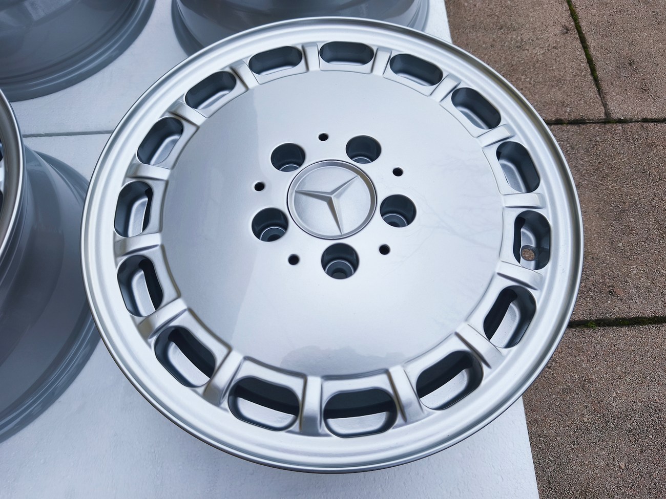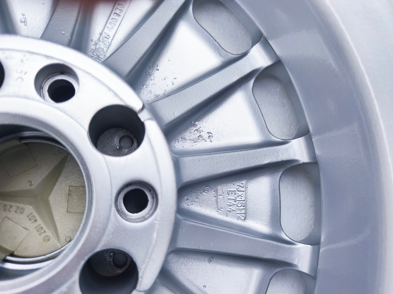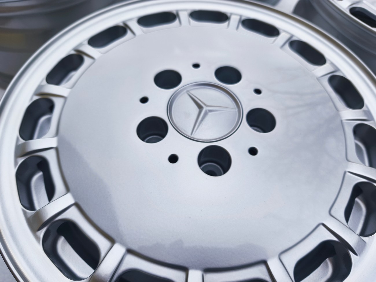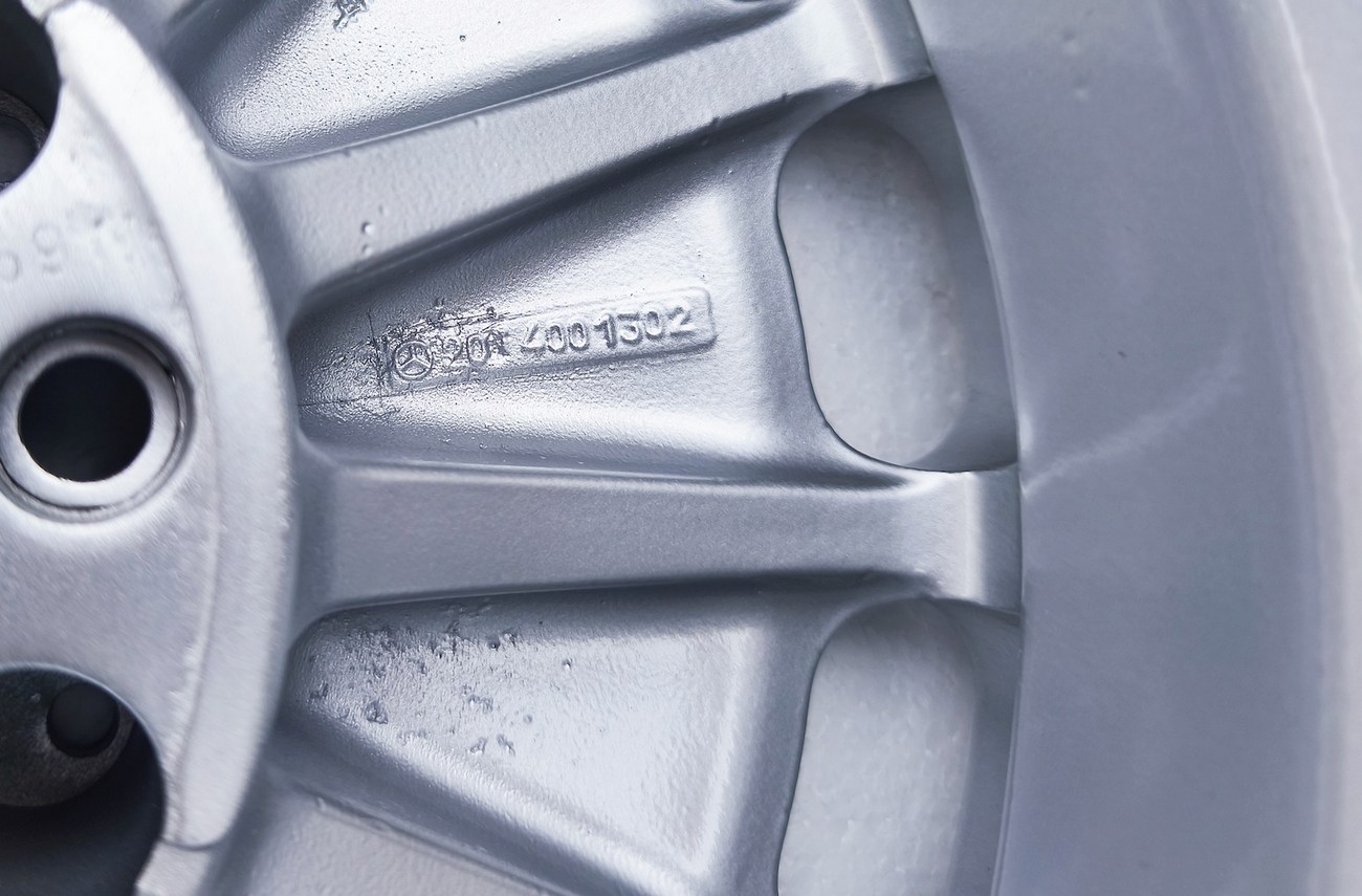 These factory wheels were originally designed for a W201 2.3-16v Cosworth or Sportline equipped model by Mercedes-Benz. Measuring 7" wide, the wheels are 1" wider than standard model W201 gullideckels and .5" wider than the W124 versions. The wheels feature a silver powder coated finish and up close photos of each face are provided in the gallery.