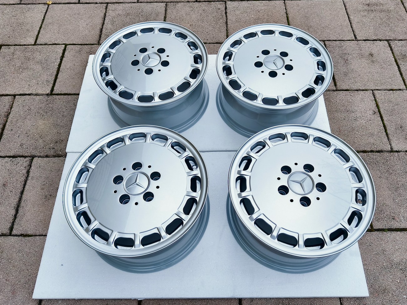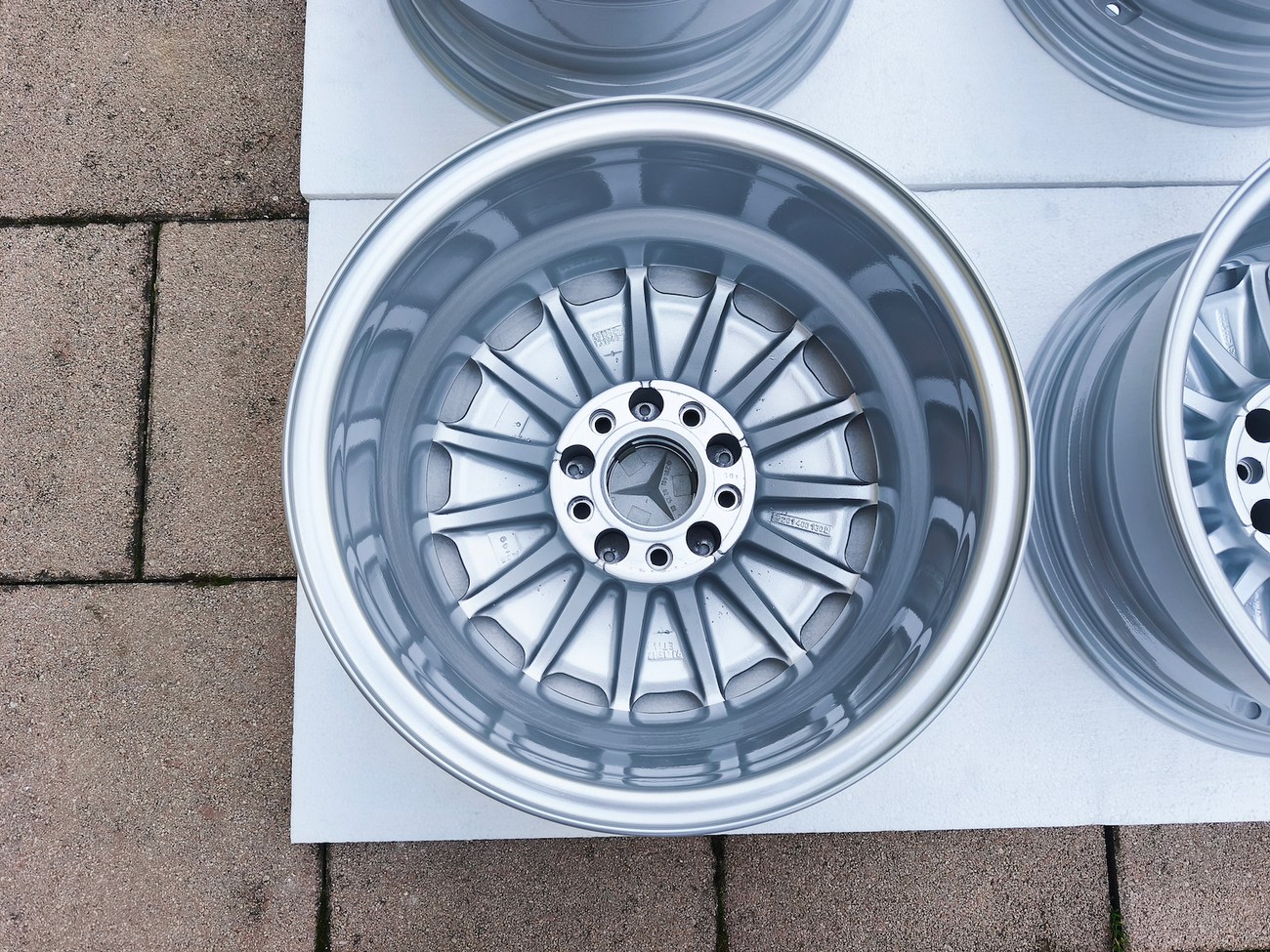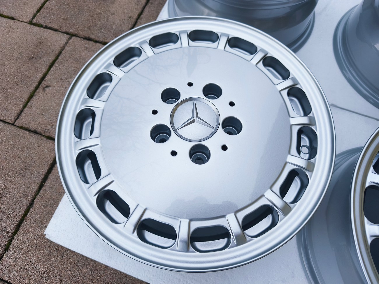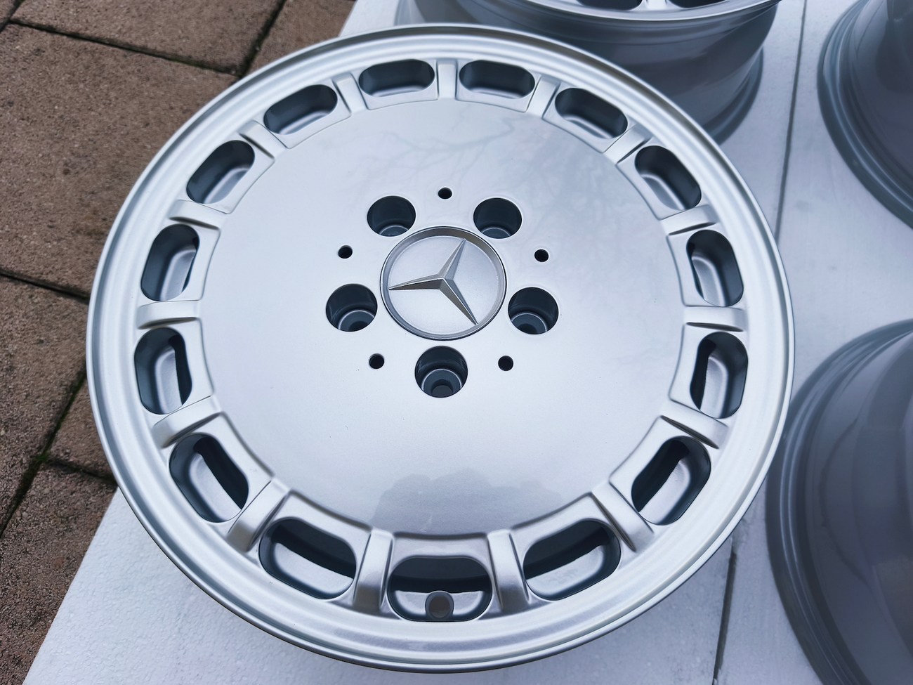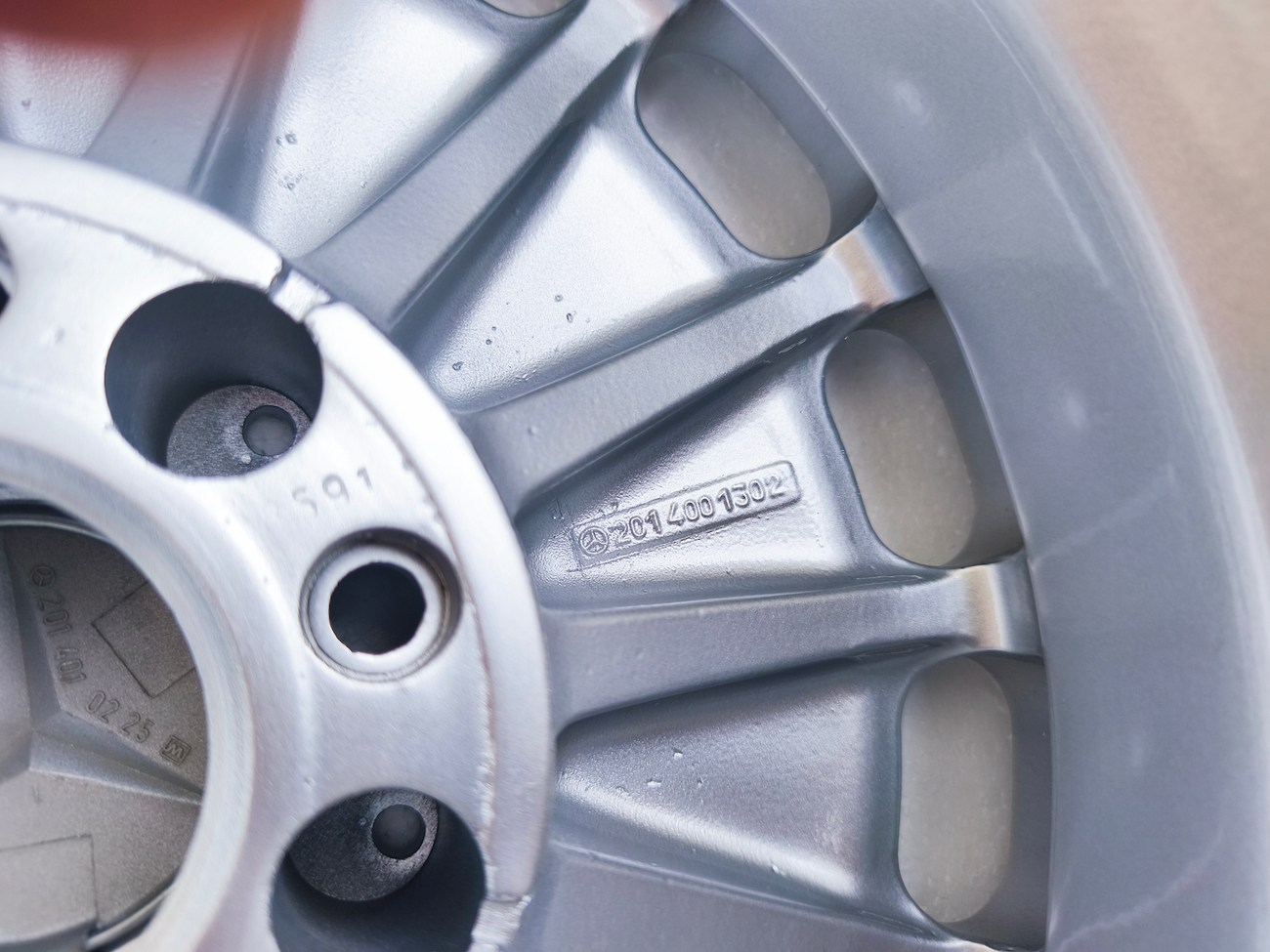 These factory wheels were originally designed for a W201 2.3-16v Cosworth or Sportline equipped model by Mercedes-Benz. Measuring 7" wide, the wheels are 1" wider than standard model W201 gullideckels and .5" wider than the W124 versions. The wheels feature a silver powder coated finish and up close photos of each face are provided in the gallery.