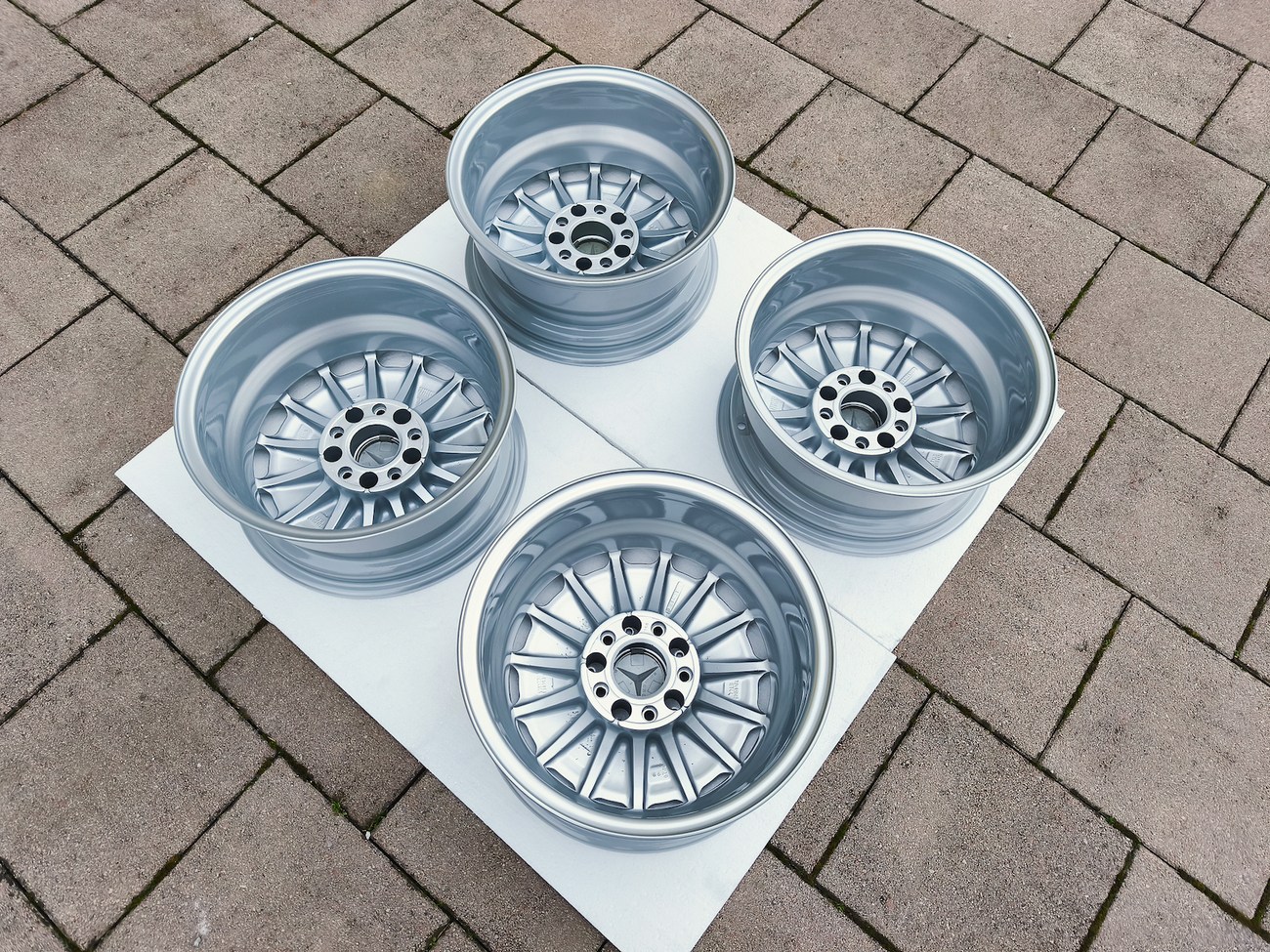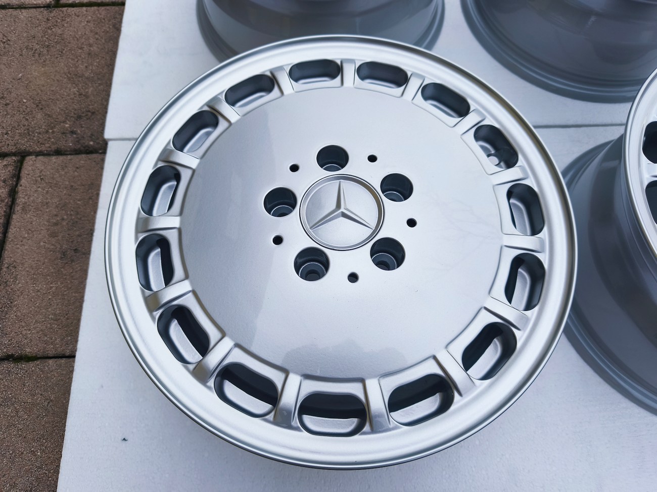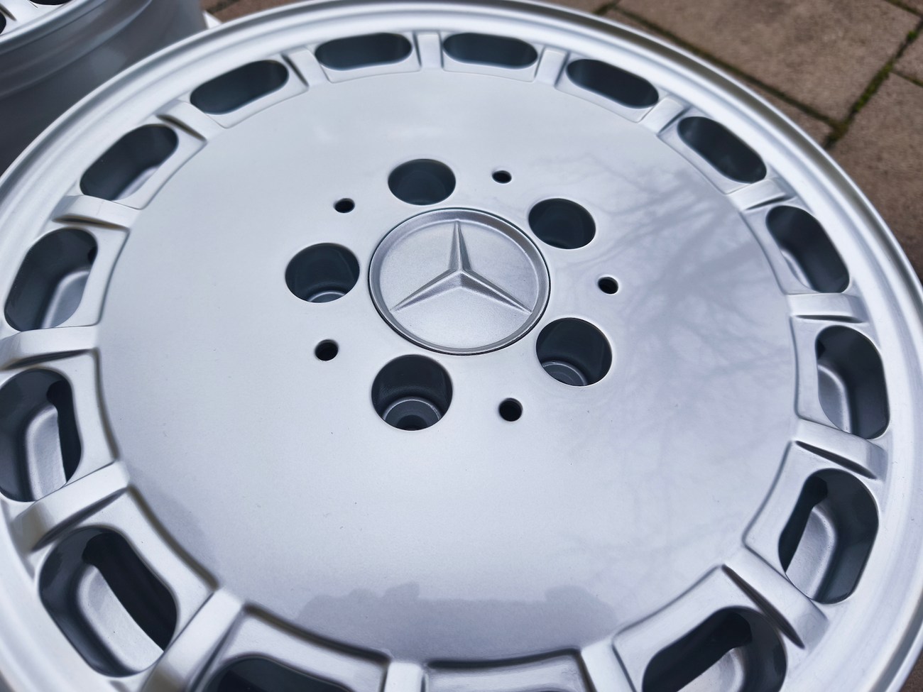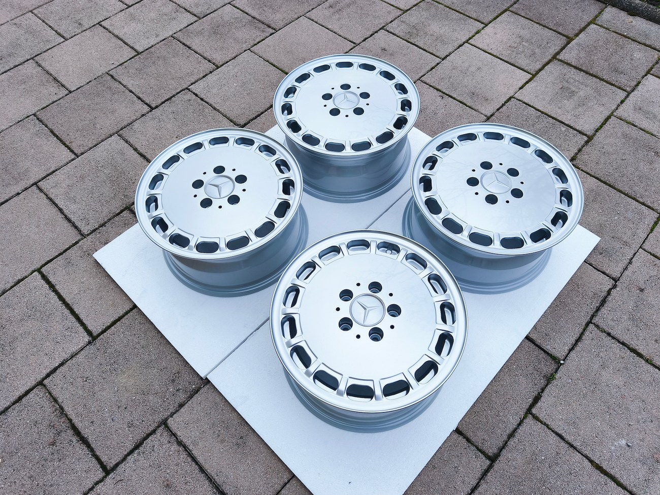 These factory wheels were originally designed for a W201 2.3-16v Cosworth or Sportline equipped model by Mercedes-Benz. Measuring 7" wide, the wheels are 1" wider than standard model W201 gullideckels and .5" wider than the W124 versions. The wheels feature a silver powder coated finish and up close photos of each face are provided in the gallery.