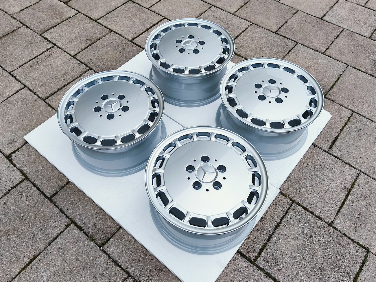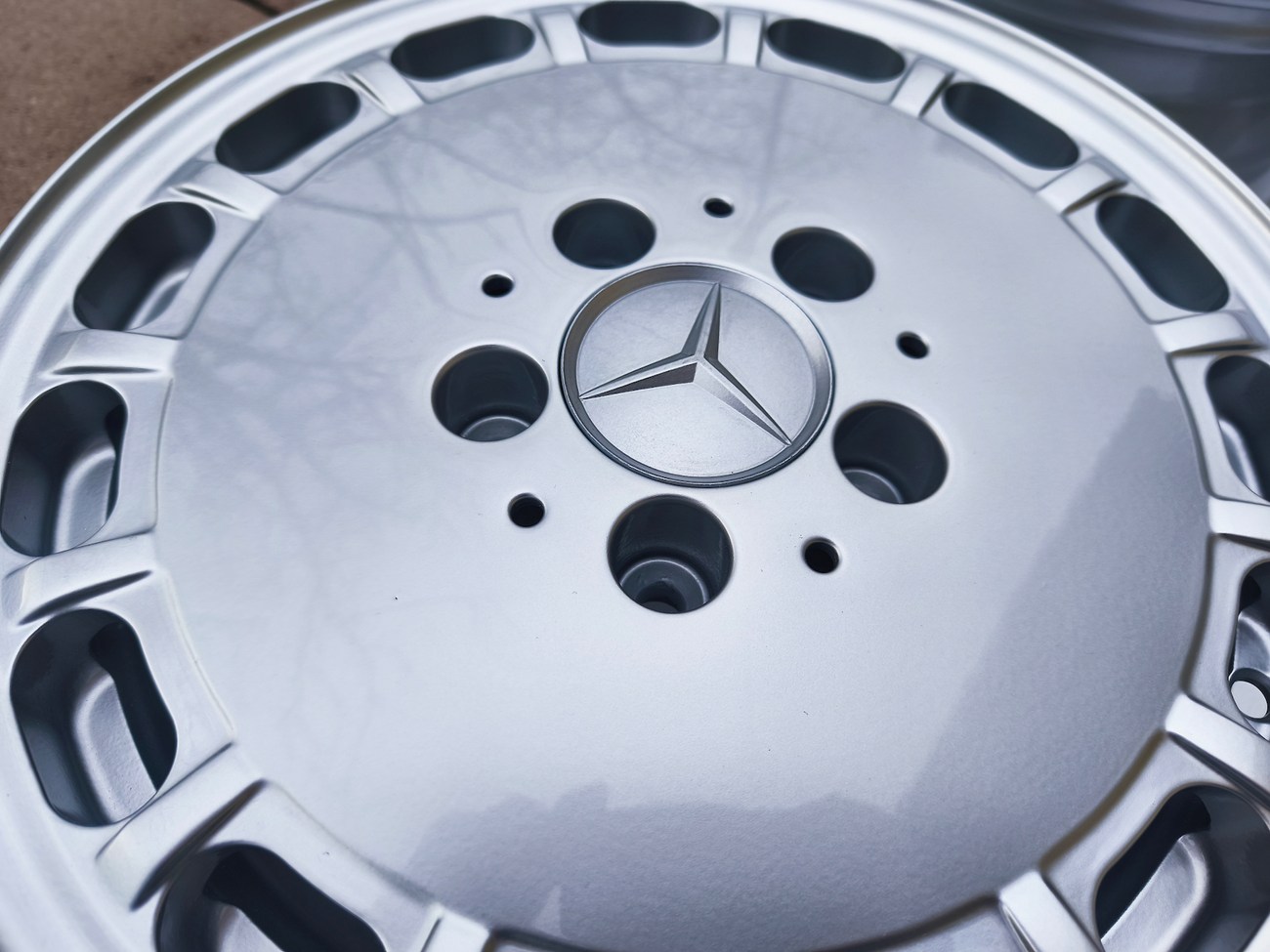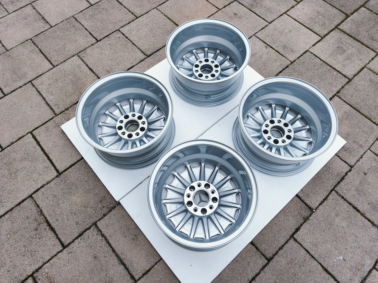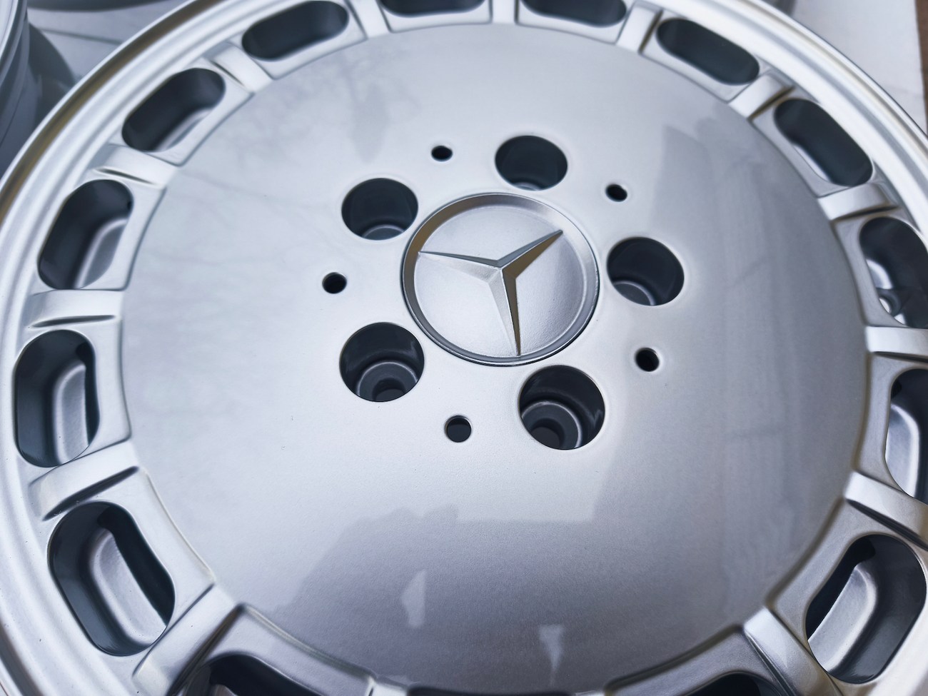 These factory wheels were originally designed for a W201 2.3-16v Cosworth or Sportline equipped model by Mercedes-Benz. Measuring 7" wide, the wheels are 1" wider than standard model W201 gullideckels and .5" wider than the W124 versions. The wheels feature a silver powder coated finish and up close photos of each face are provided in the gallery.