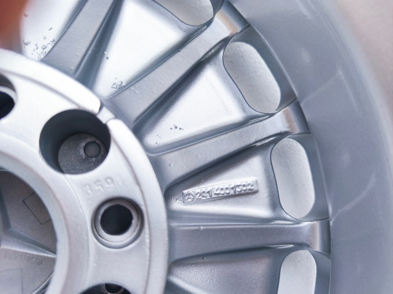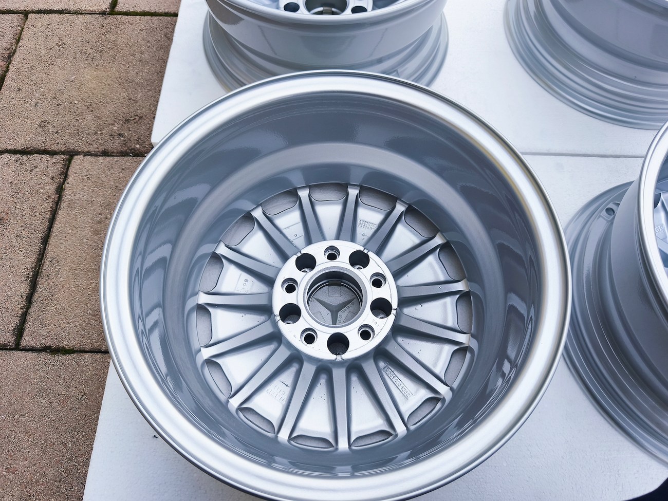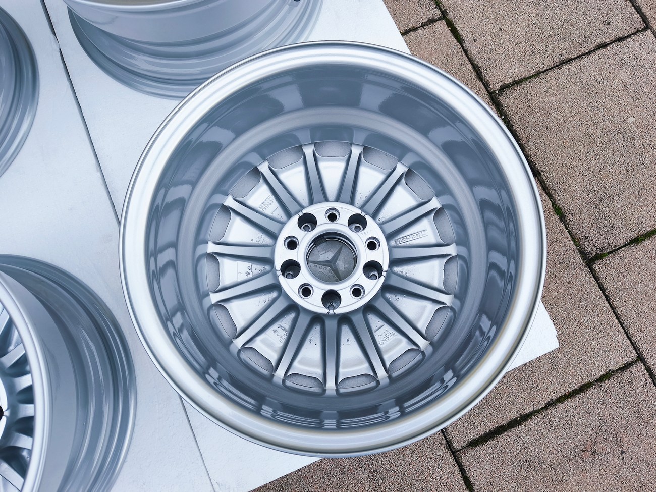 The wheels are manufactured by Mercedes-Benz in Germany by Otto Fuchs. The Mercedes-Benz logo appears on the back of each wheel along with part numbers. These OEM Gullideckel wheels are now offered with Mercedes-Benz center caps and worldwide shipping is available. The seller notes shipping to all U.S. states is $890.