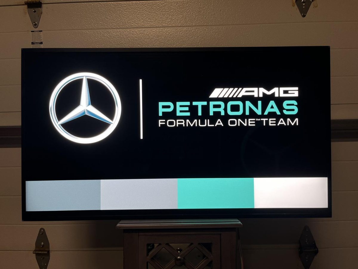 This authentic Mercedes-AMG illuminated Petronas Formula One sign was used as a promotional piece during the Rolex 24 at Daytona race back in 2018. The sign measures 36 inches in length by 20 inches in width by 3 inches in depth. Features include LED illumination enclosed by a metal housing, raised illuminated Mercedes-Benz star, 110-volt power supply, and pre-drilled mounting holes on the backside for wall mount. Promotional markings are present on the sign indicating the original use-case. The sign has been fully tested and is in excellent condition