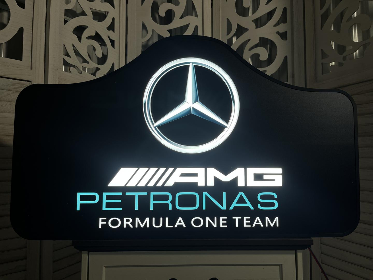 This authentic Mercedes-Benz AMG Petronas illuminated sign originated from the 2018 Grand Prix held in Austin, Texas as a promotional piece. The sign measures 32” in length by 19” in width by 3” in thickness and weighs 19 lbs. Features include LED illumination enclosed by a metal housing, 110-volt power supply, and mounting holes on the backside for wall mount. The sign is equipped with a standard 110 volt power adapter for US outlets. Promotional markings are present on the sign indicating the original use-case. The sign is in full working order and in excellent cosmetic condition.