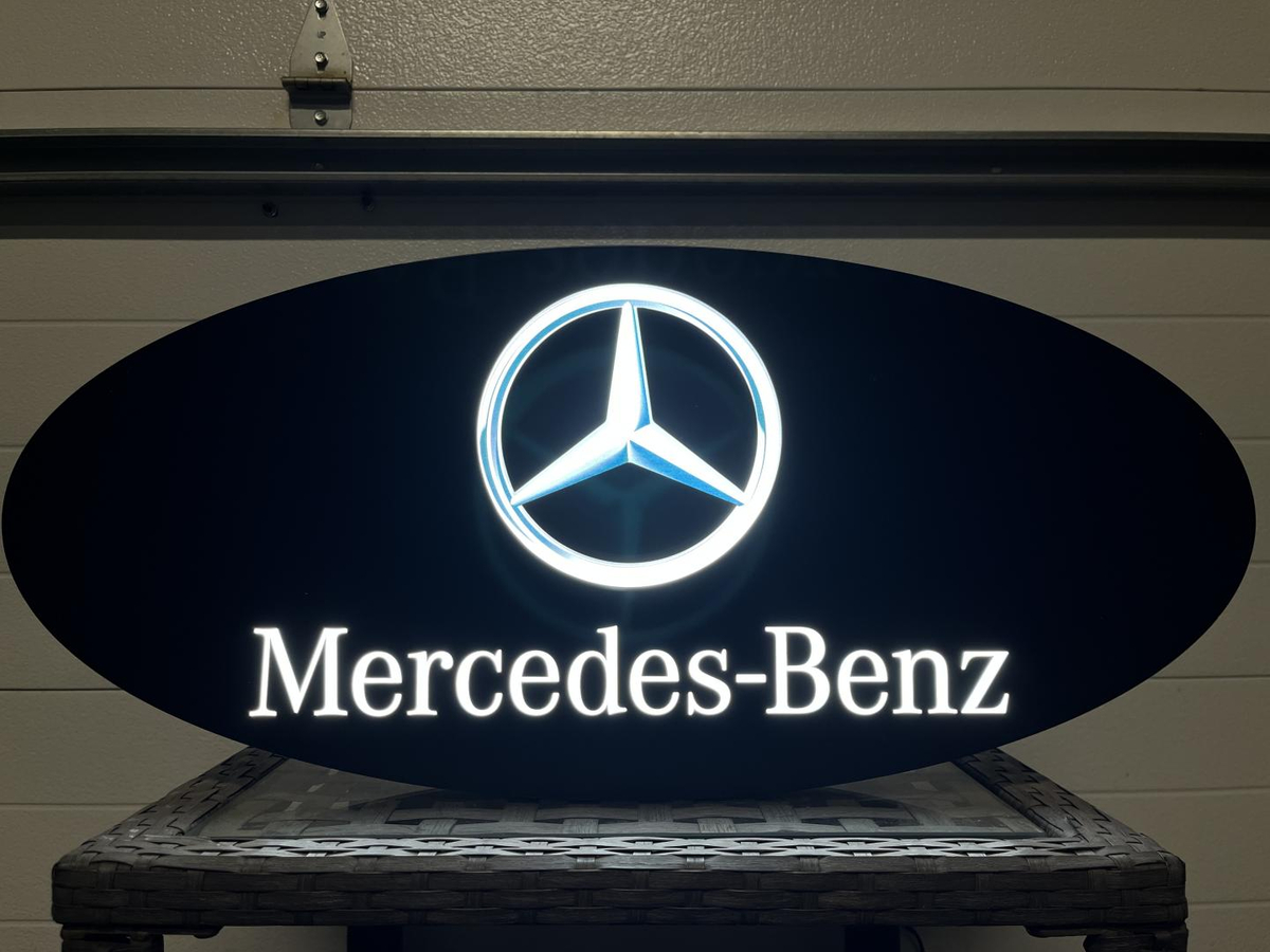 The seller has tested all lighting and photos are shown with all bulbs in working order. Dealerships and other partners are instructed to destroy any genuine signage that is removed from their buildings, displays, or show booths so a sign like this isn’t common. The sign measures 27” in length x 12” in height x 2.5” in thickness. and features the illuminated Mercedes-Benz logo raised above the surface of the sign. The sign lettering and logo illuminate and detailed photos with the lights on are shown in the gallery. The sign is backed by a metal frame and a power chord is located on the bottom of the sign that works with 110v American voltage.