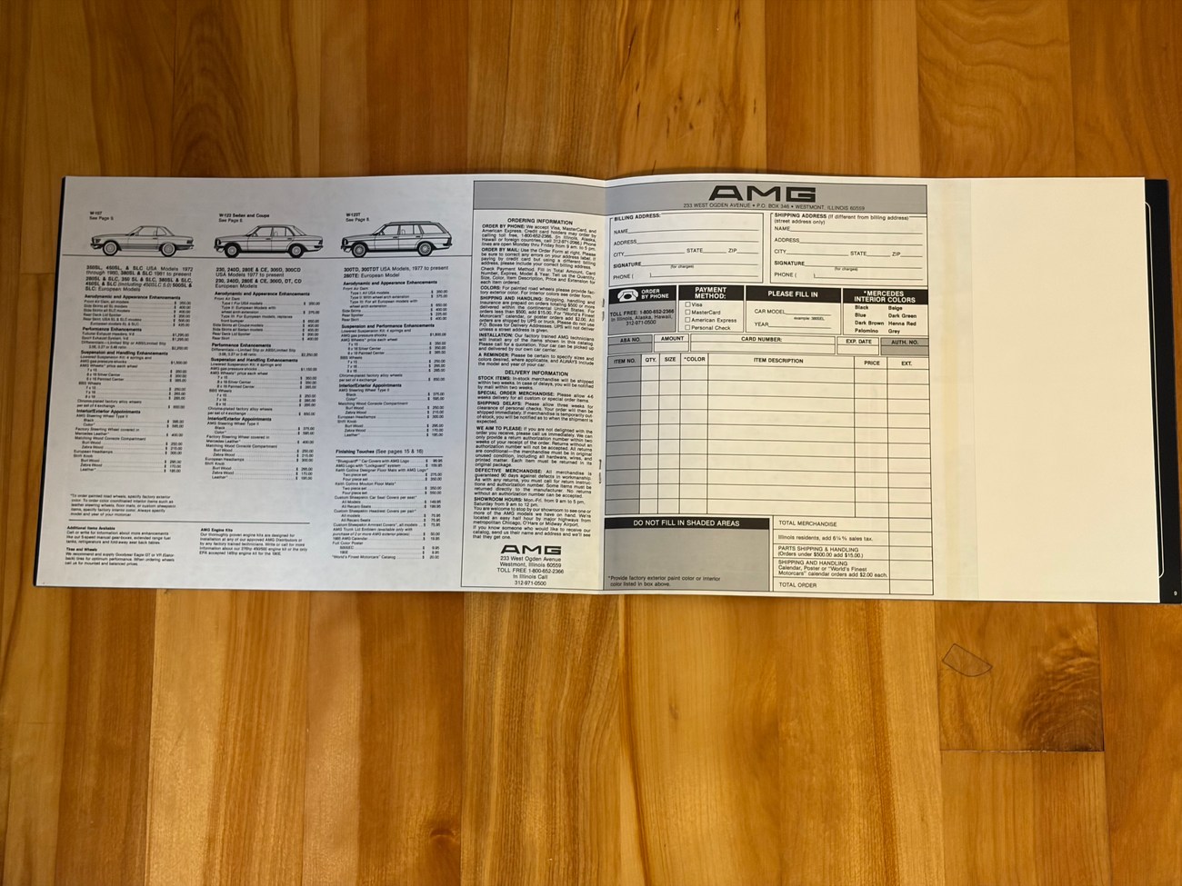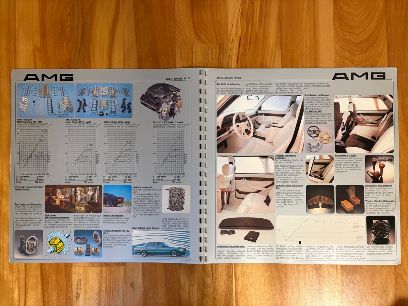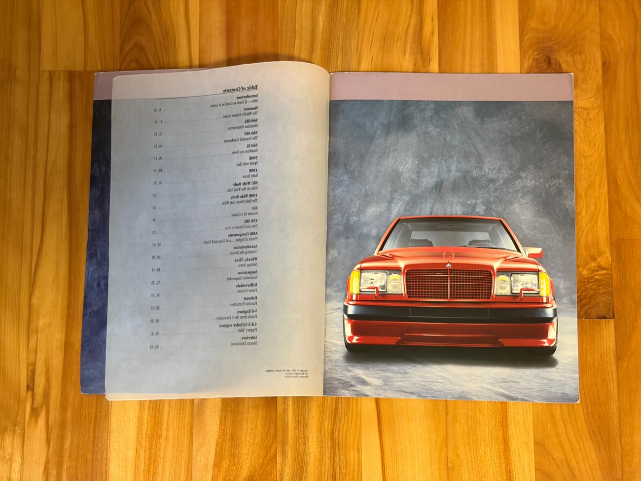 These brochures include parts offerings for both the exterior and interior of various models along with some part numbers. Interior materials and factory nomenclature including different wood veneers are shown on one of the leaflets in the gallery. A quad-cam M117 engine is shown on the Technik brochure. This was the engine installed in the W/C/S124 Hammers and W/C126 6.0 cars. Also shown is the red 6.0 Hammer sedan that was a press car back in the day and featured in Road & Track’s August of 1987 issue.