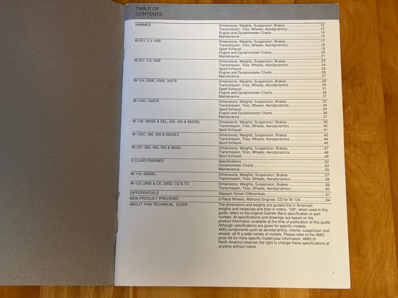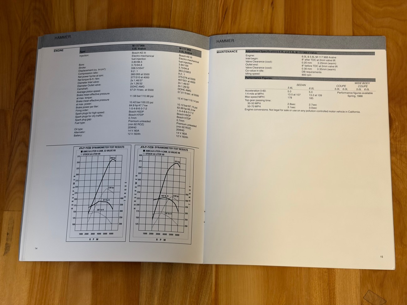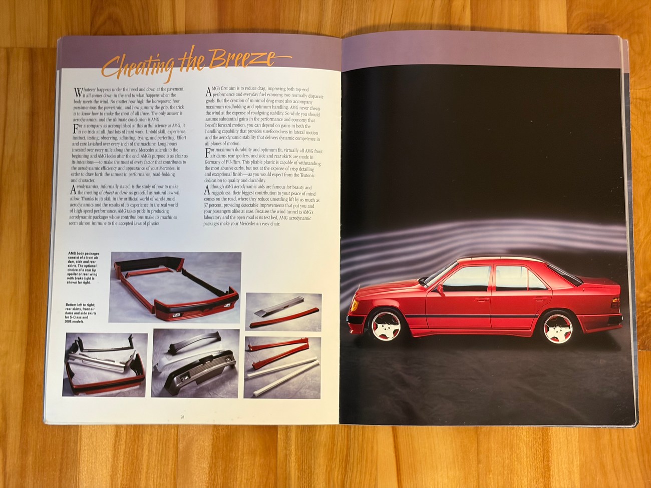 These brochures include parts offerings for both the exterior and interior of various models along with some part numbers. Interior materials and factory nomenclature including different wood veneers are shown on one of the leaflets in the gallery. A quad-cam M117 engine is shown on the Technik brochure. This was the engine installed in the W/C/S124 Hammers and W/C126 6.0 cars. Also shown is the red 6.0 Hammer sedan that was a press car back in the day and featured in Road & Track’s August of 1987 issue.