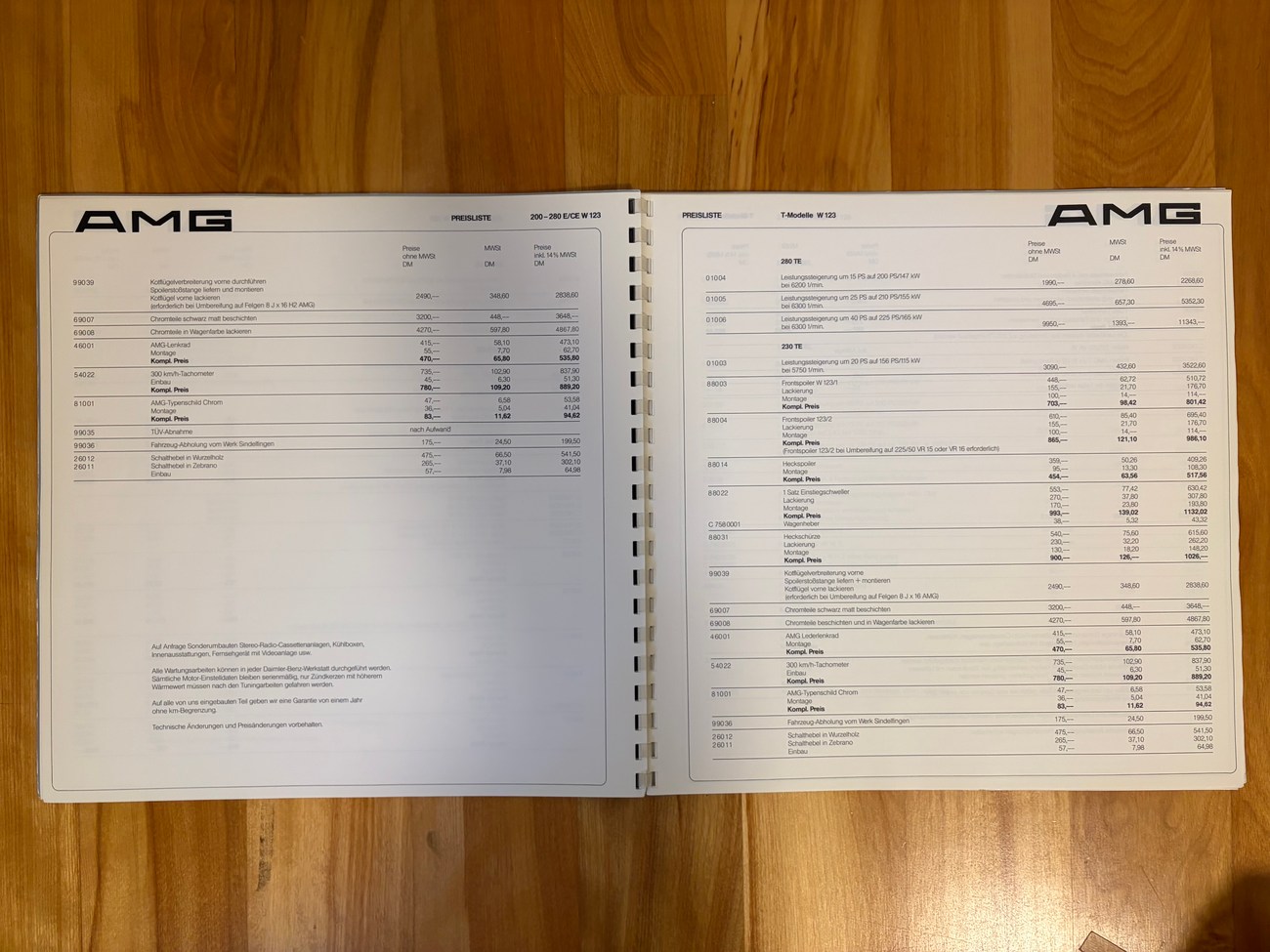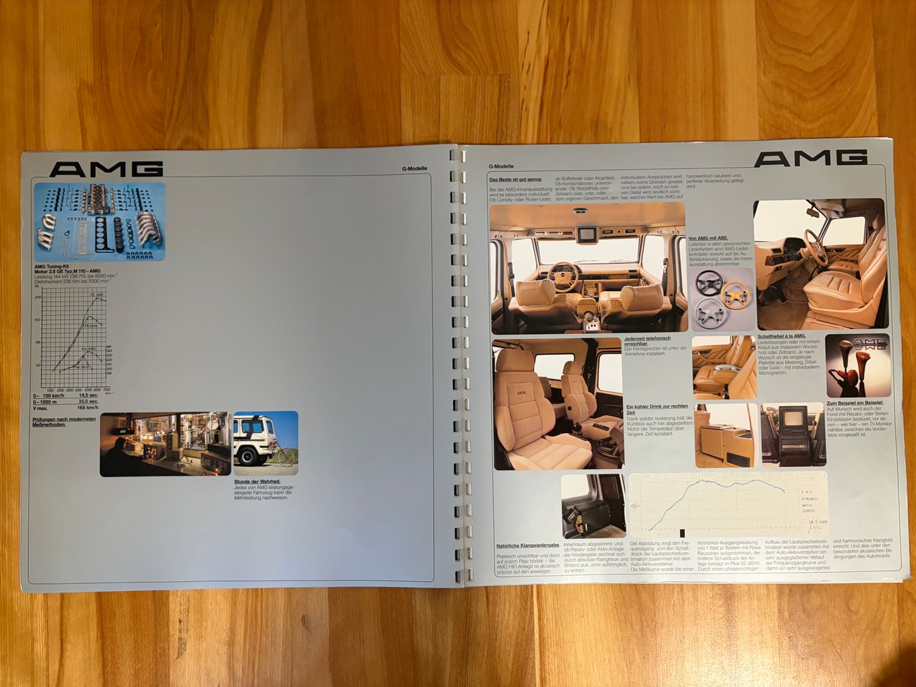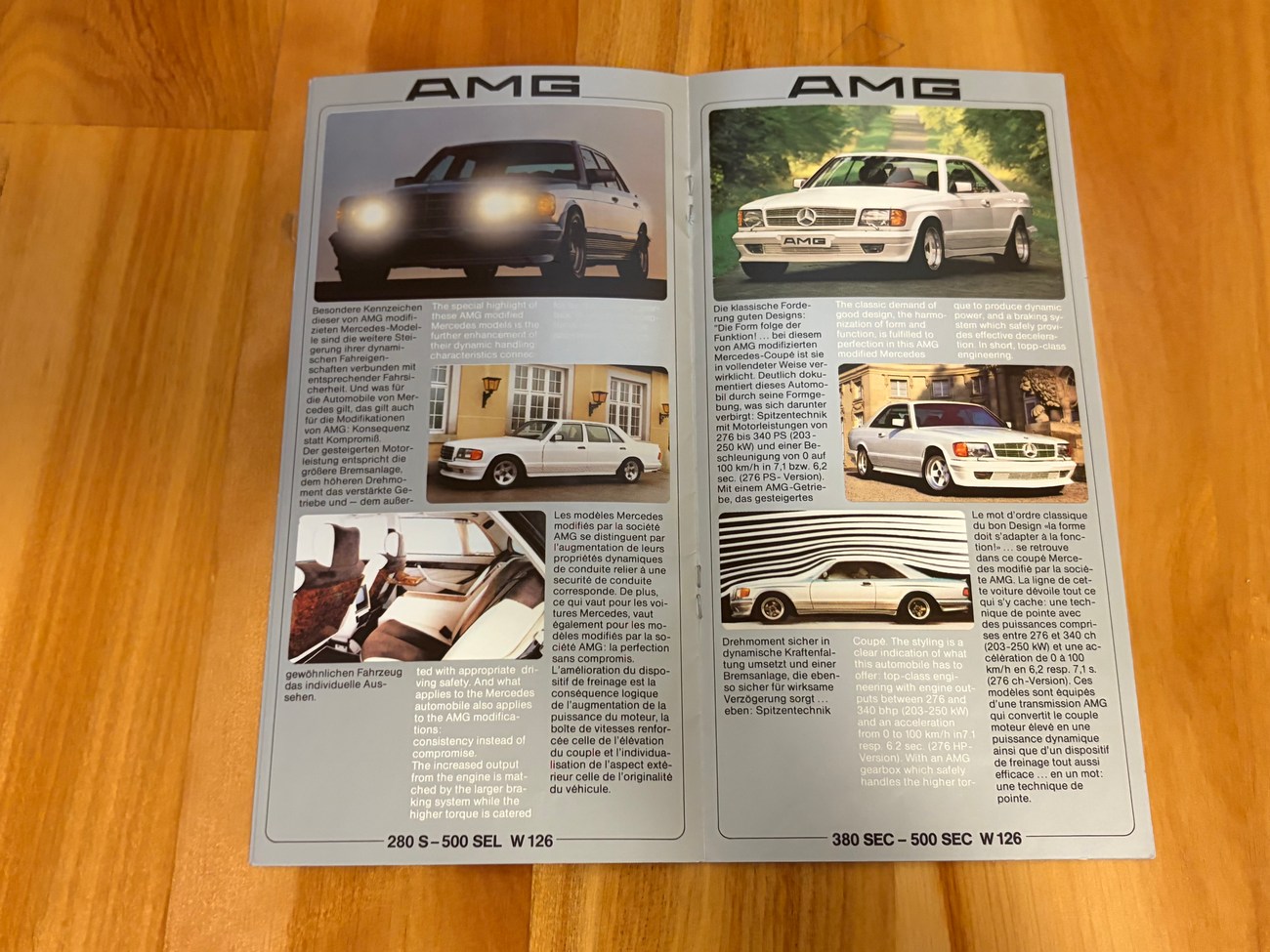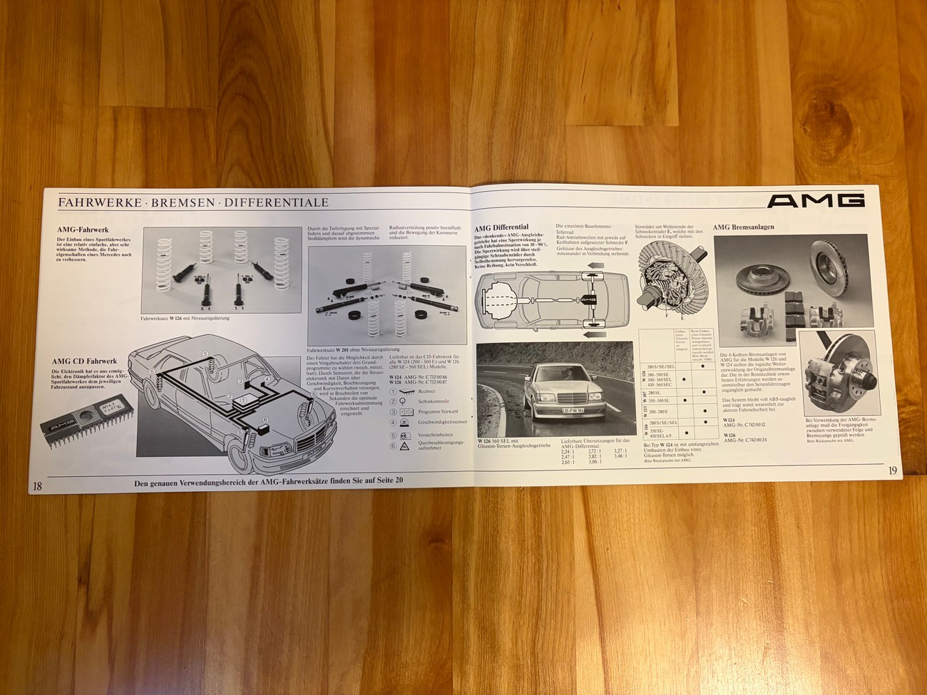There are five books and one packet included in the overall lot. In the packet there are fifteen different sheets that the seller shows in detail. Included are the postcard style leaflets picturing the AMG models and variants from widebody W201s to W460 G-wagons that could be modified by the tuning outfit in the day. Customers could choose to modify their W460, W201, W124, C124, S124, W126, and C126.