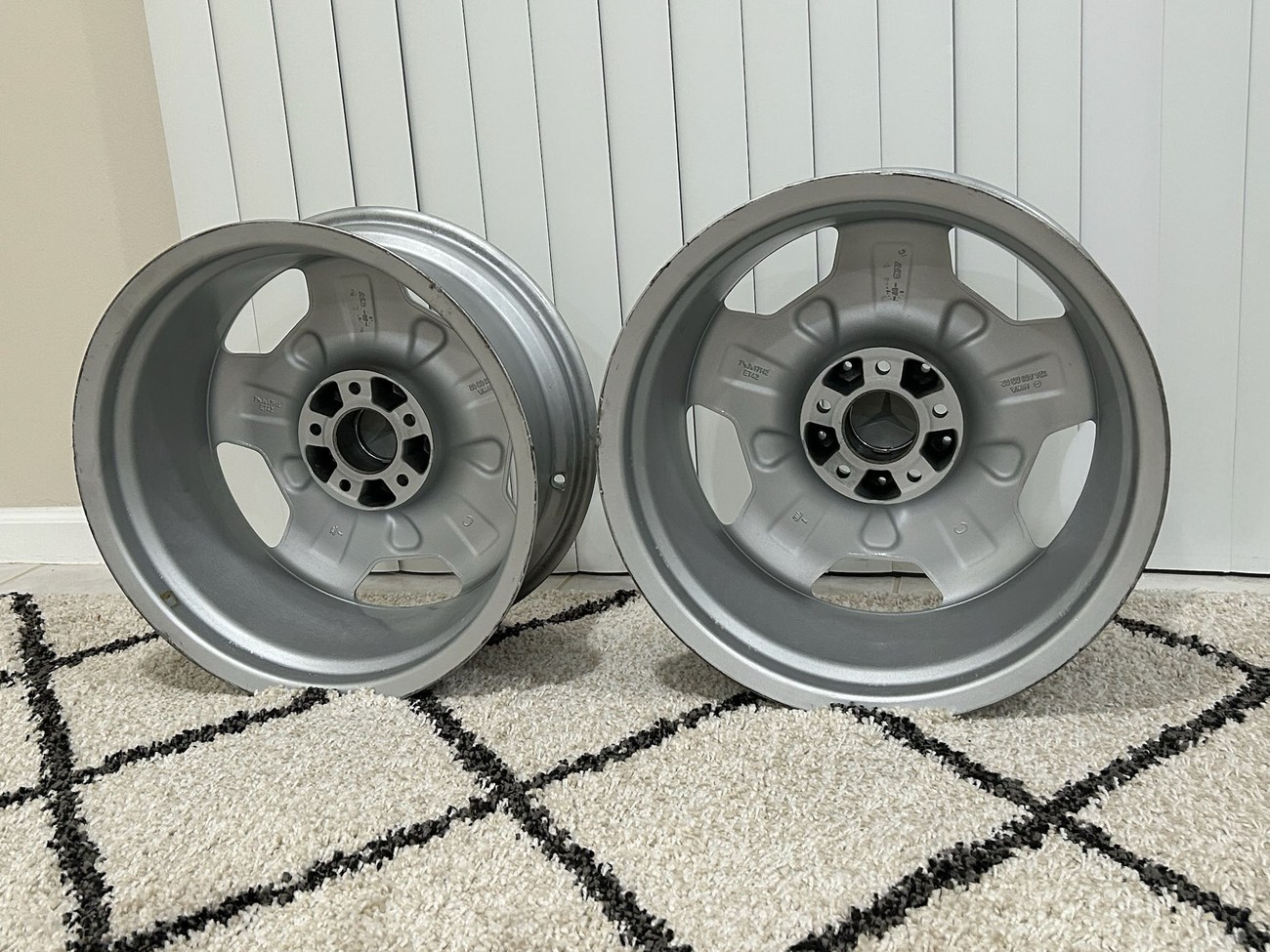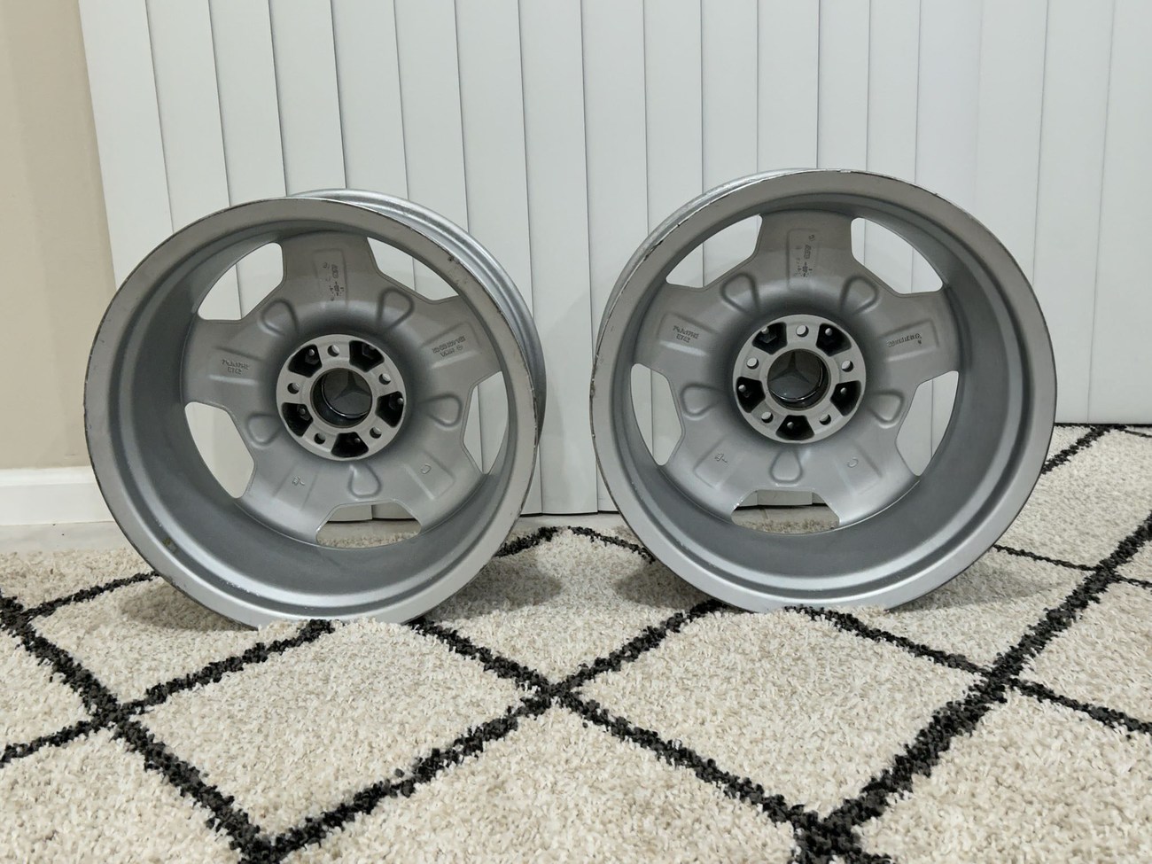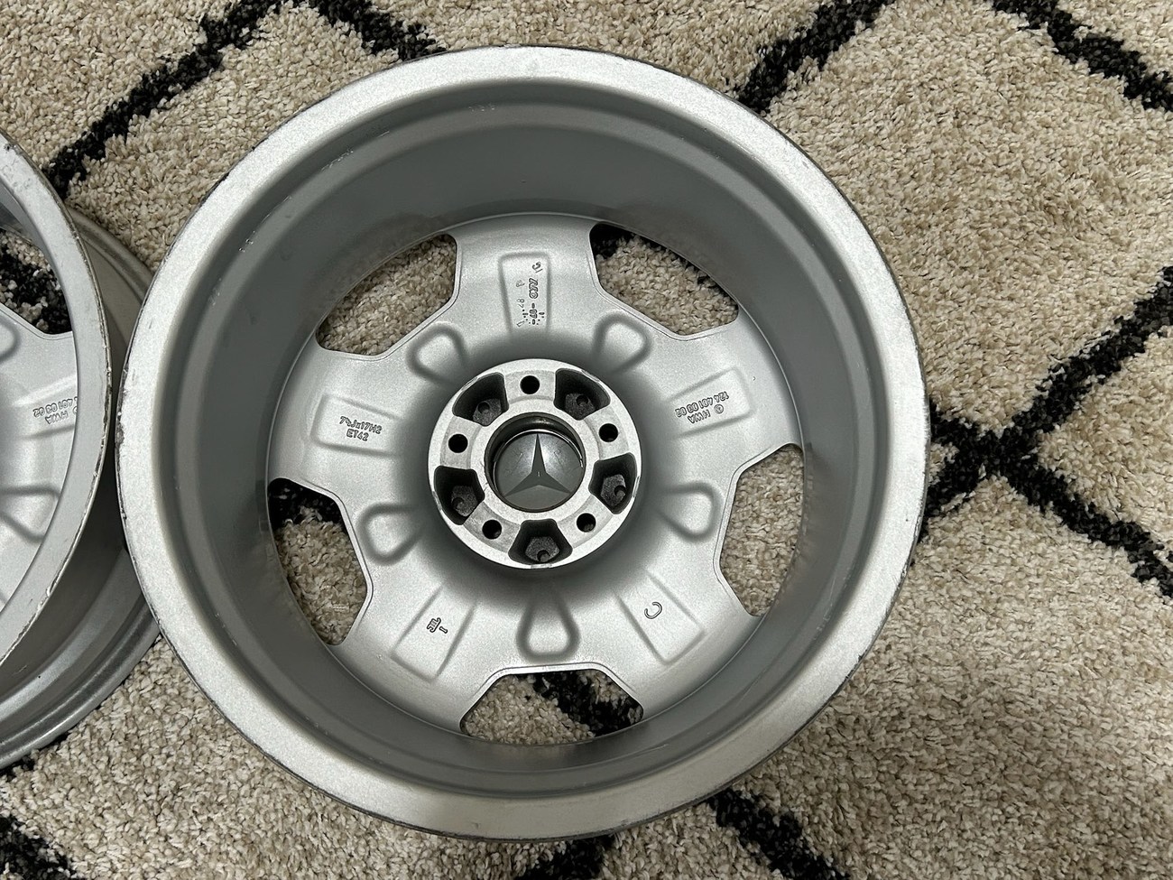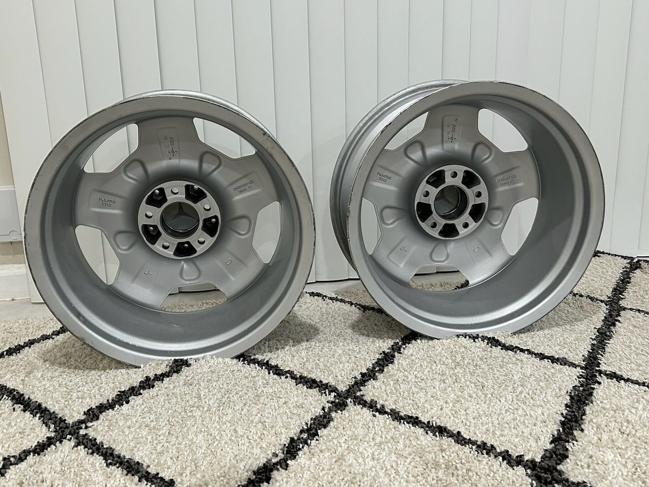 These factory Mercedes-Benz wheels are one of the rarest versions to find with HWA124 part numbers. The wheels will fit any W124 chassis vehicle including sedans, wagons, coupes, and cabriolets. The seller is willing to assist buyers with shipping options as needed at the buyer's expense.