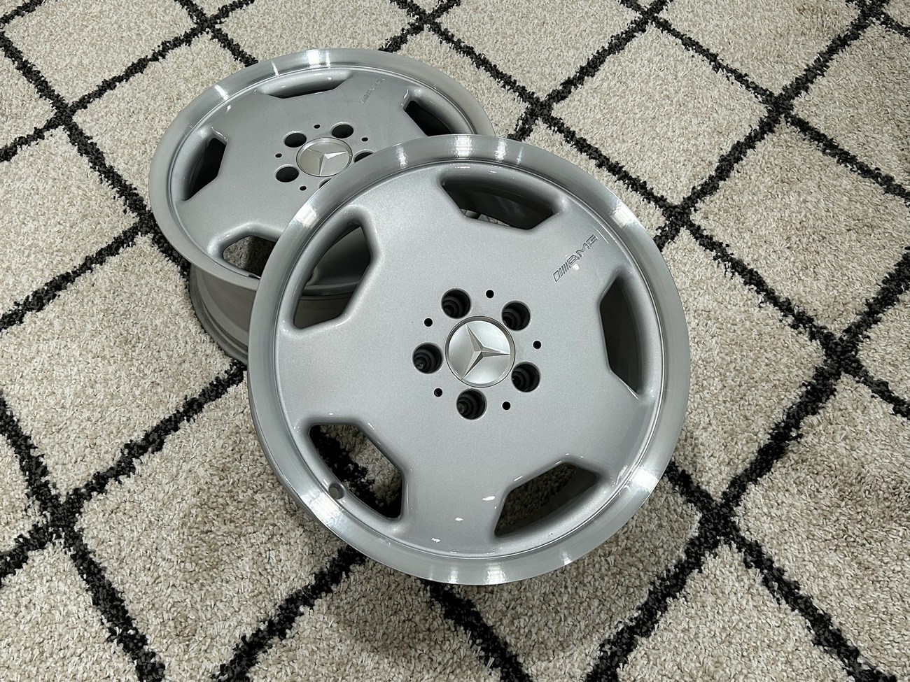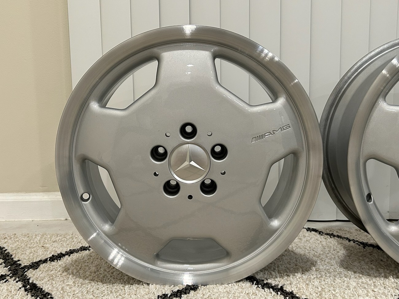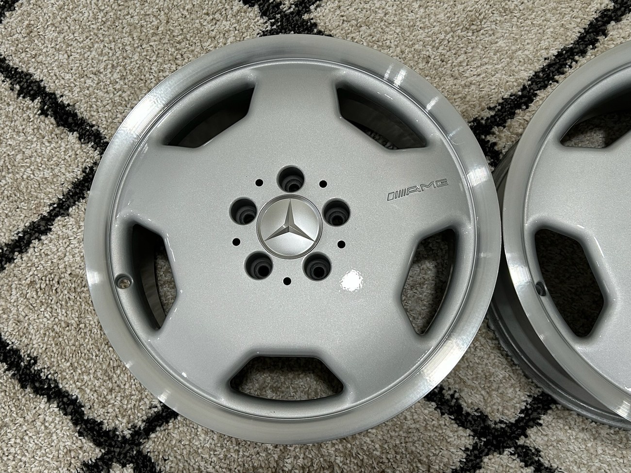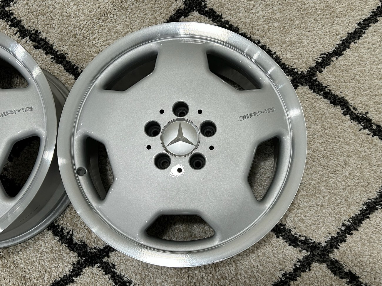 These 5-hole monoblock Aero II wheels were originally designed for a W124 AMG by the factory and feature silver painted faces with machined lips. In preparation for the sale, both wheels were professionally refinished. The AMG logo is seen engraved on each face and detailed photos are provided in the gallery.