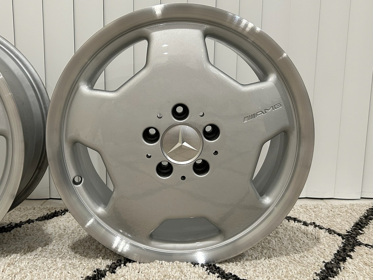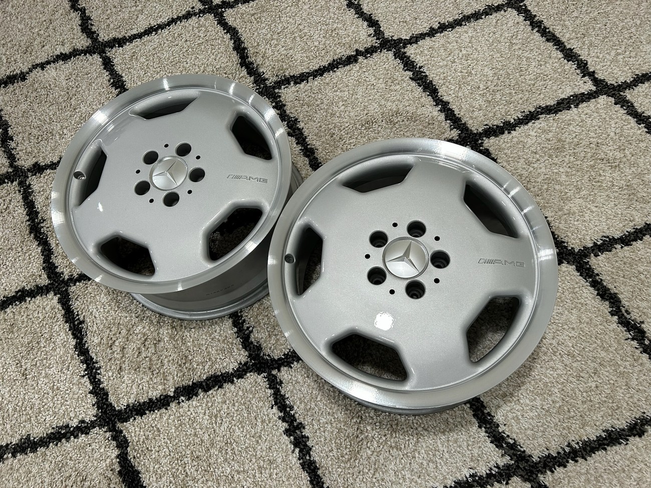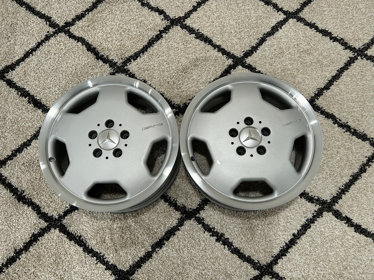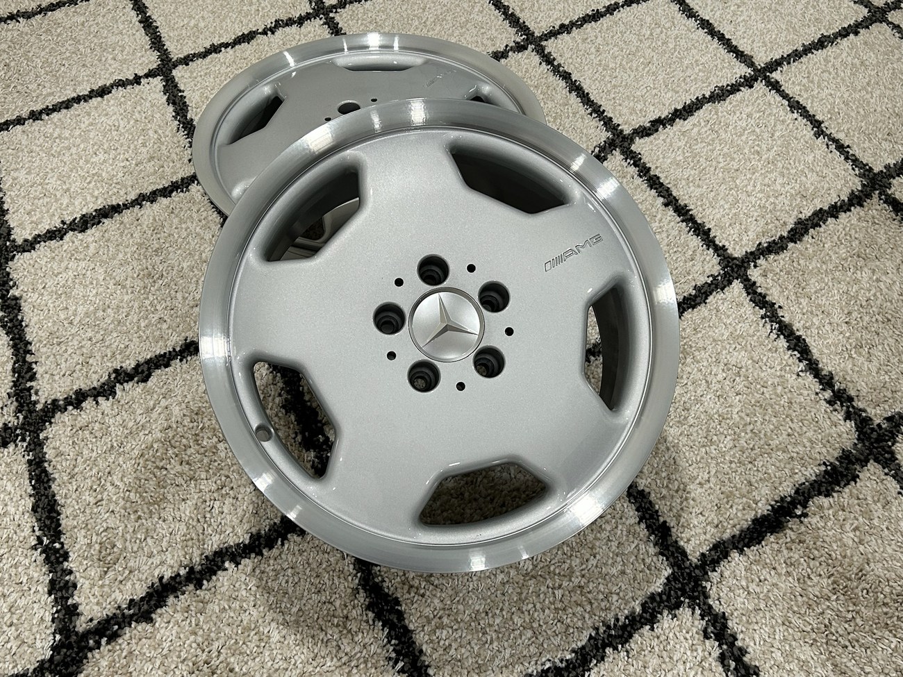 These 5-hole monoblock Aero II wheels were originally designed for a W124 AMG by the factory and feature silver painted faces with machined lips. In preparation for the sale, both wheels were professionally refinished. The AMG logo is seen engraved on each face and detailed photos are provided in the gallery.