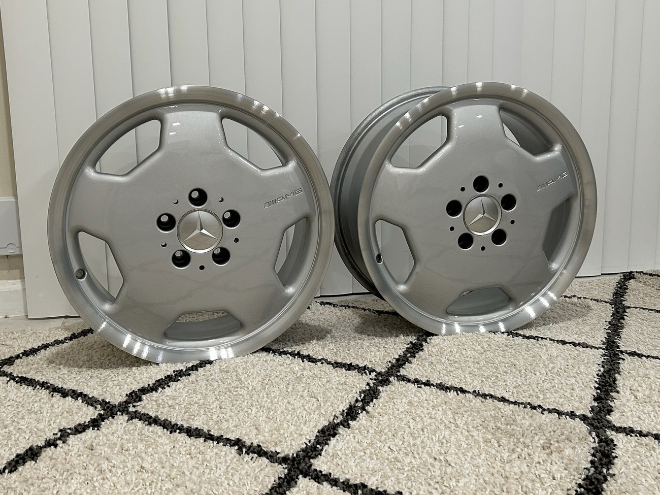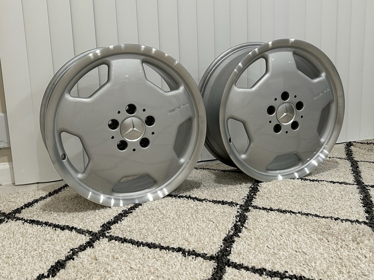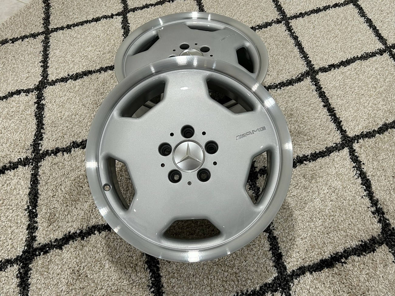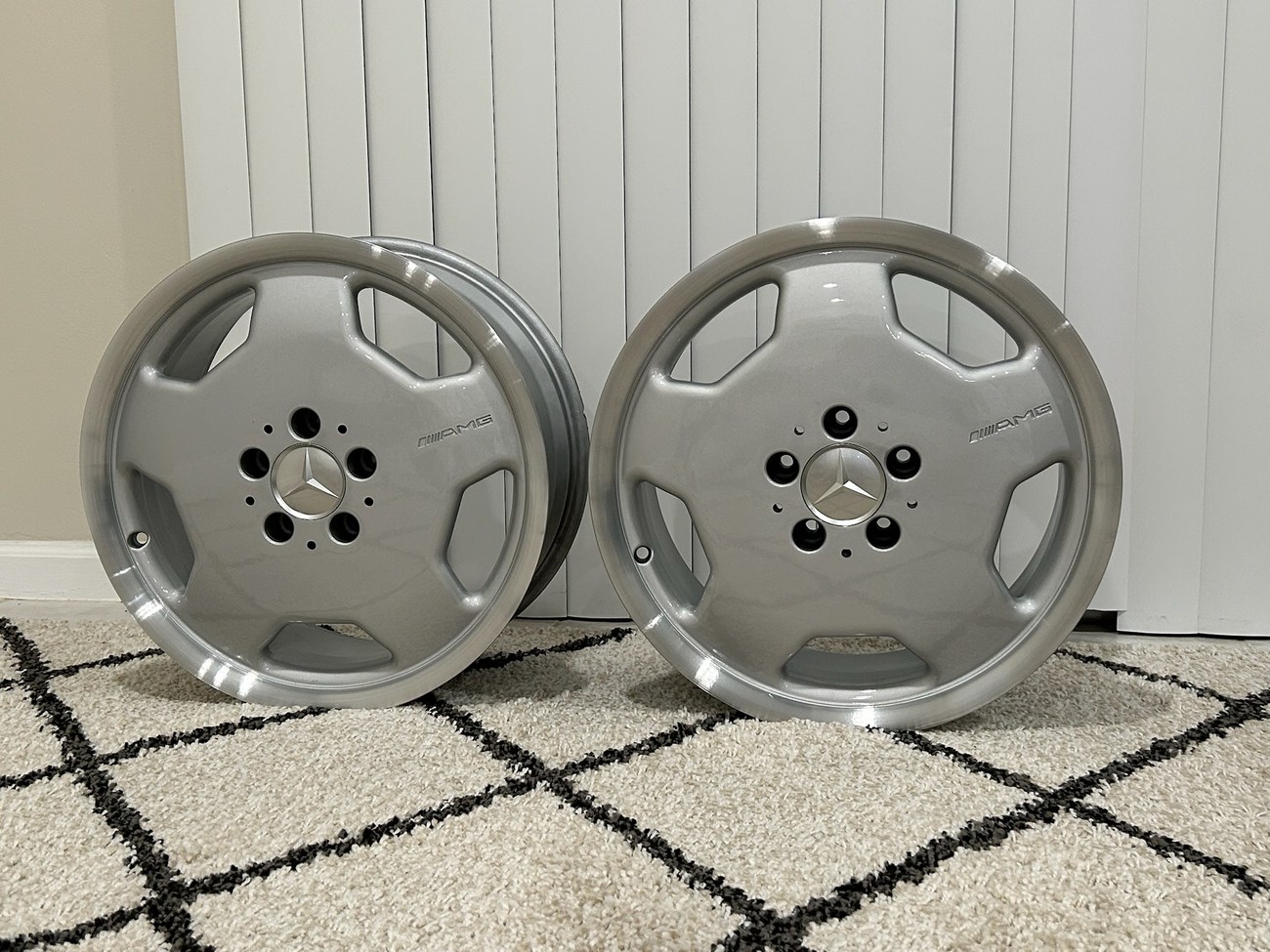 These 5-hole monoblock Aero II wheels were originally designed for a W124 AMG by the factory and feature silver painted faces with machined lips. In preparation for the sale, both wheels were professionally refinished. The AMG logo is seen engraved on each face and detailed photos are provided in the gallery.