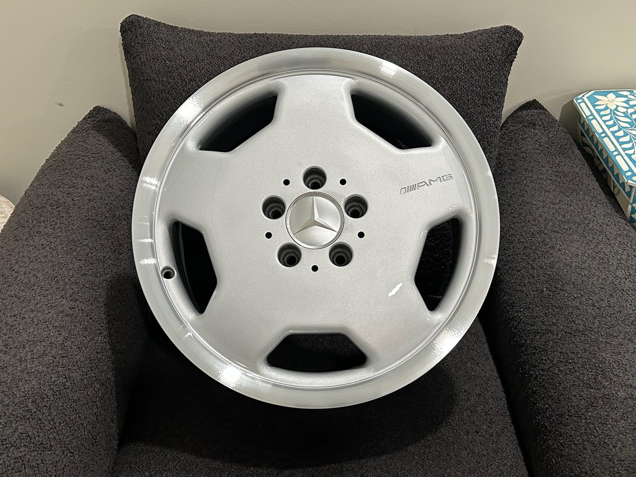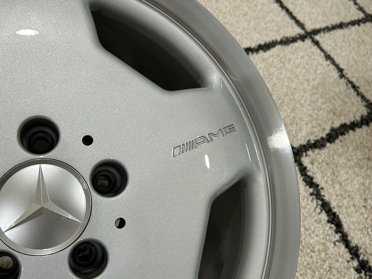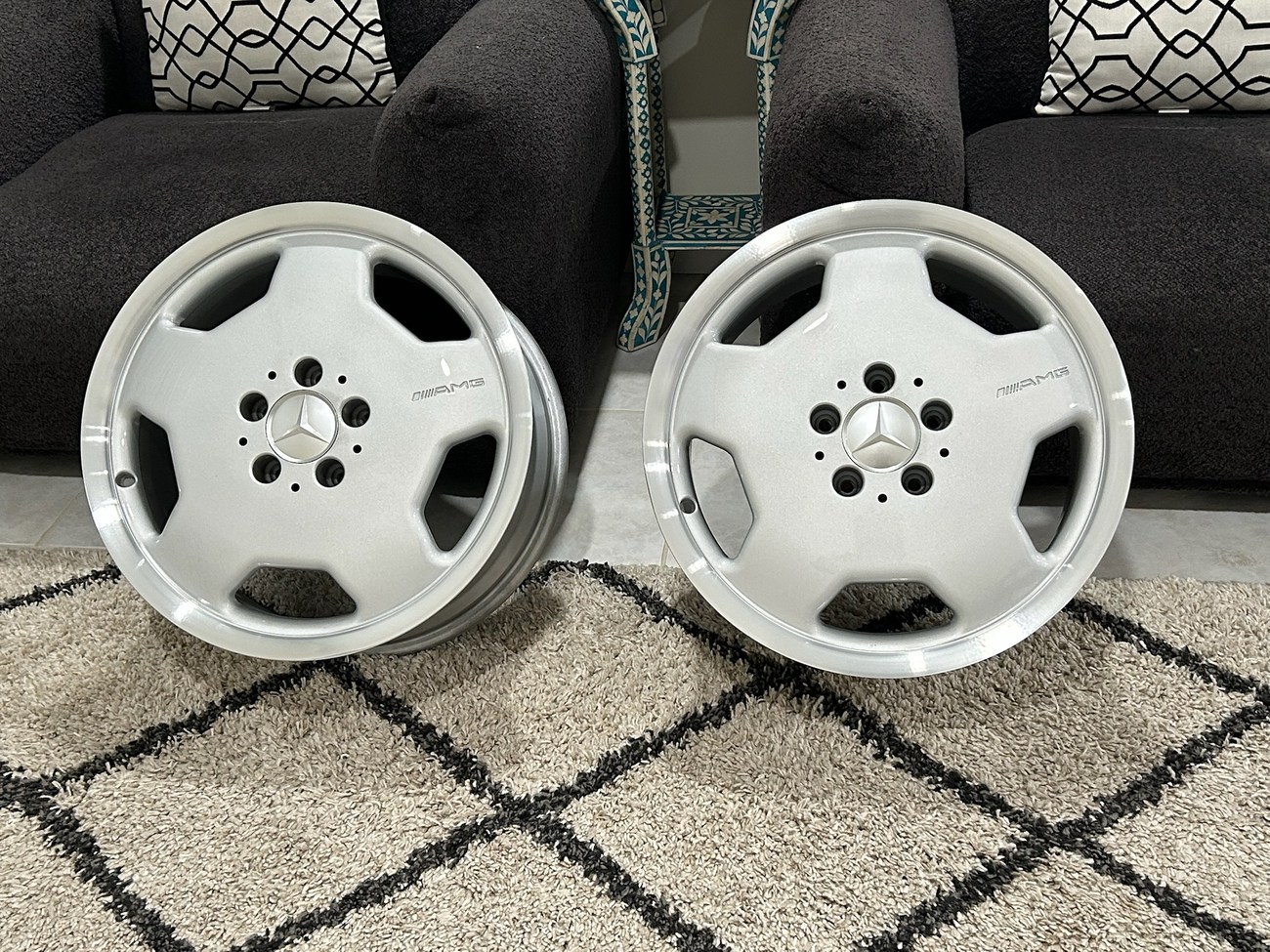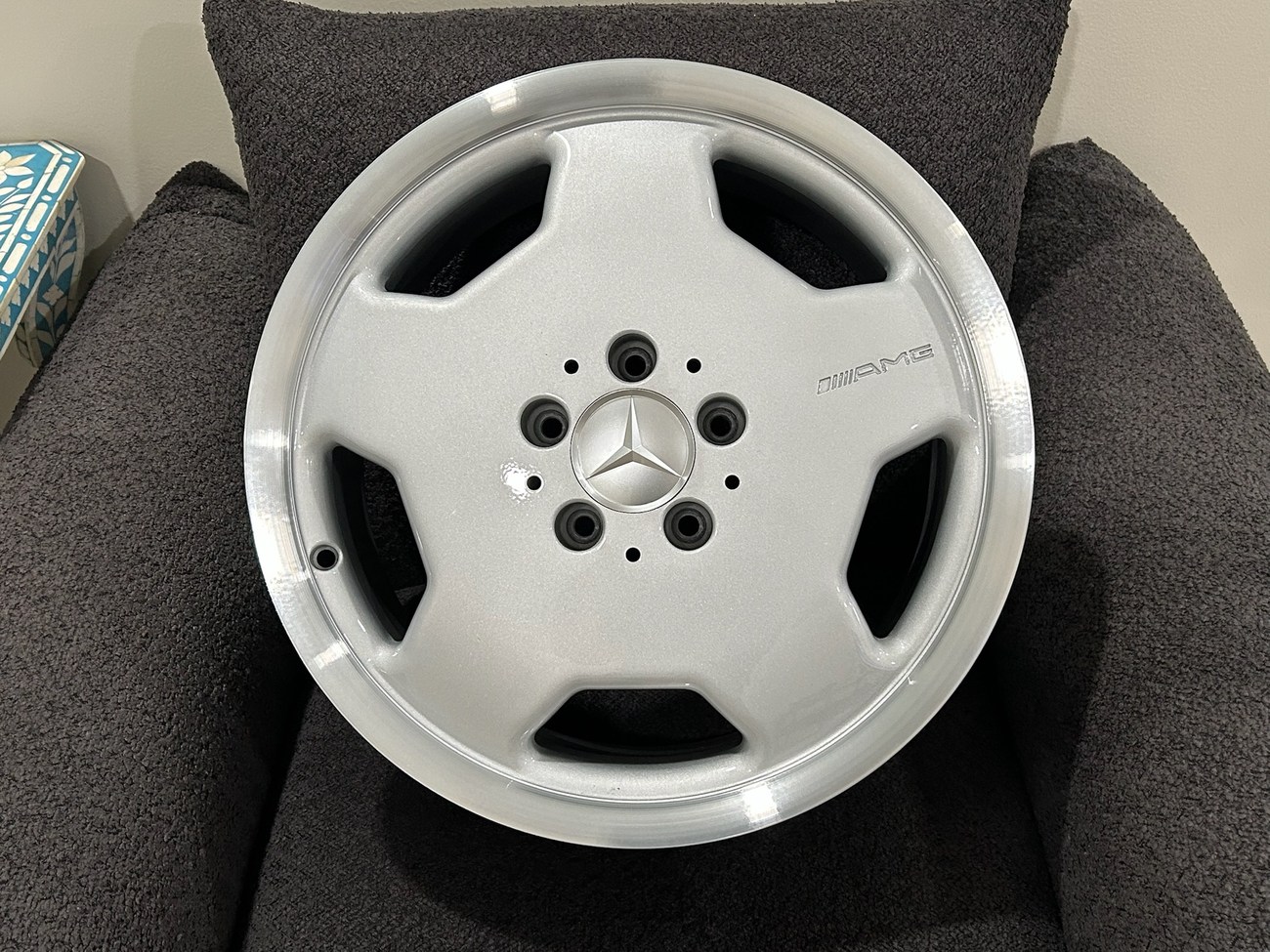 These 5-hole monoblock Aero II wheels were originally designed for a W124 AMG by the factory and feature silver painted faces with machined lips. In preparation for the sale, both wheels were professionally refinished. The AMG logo is seen engraved on each face and detailed photos are provided in the gallery.