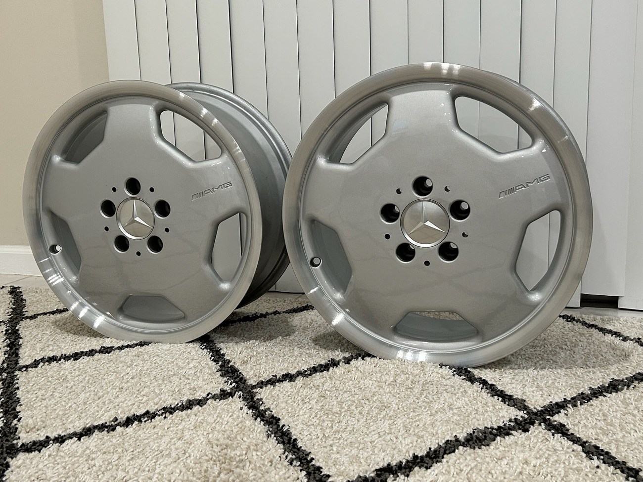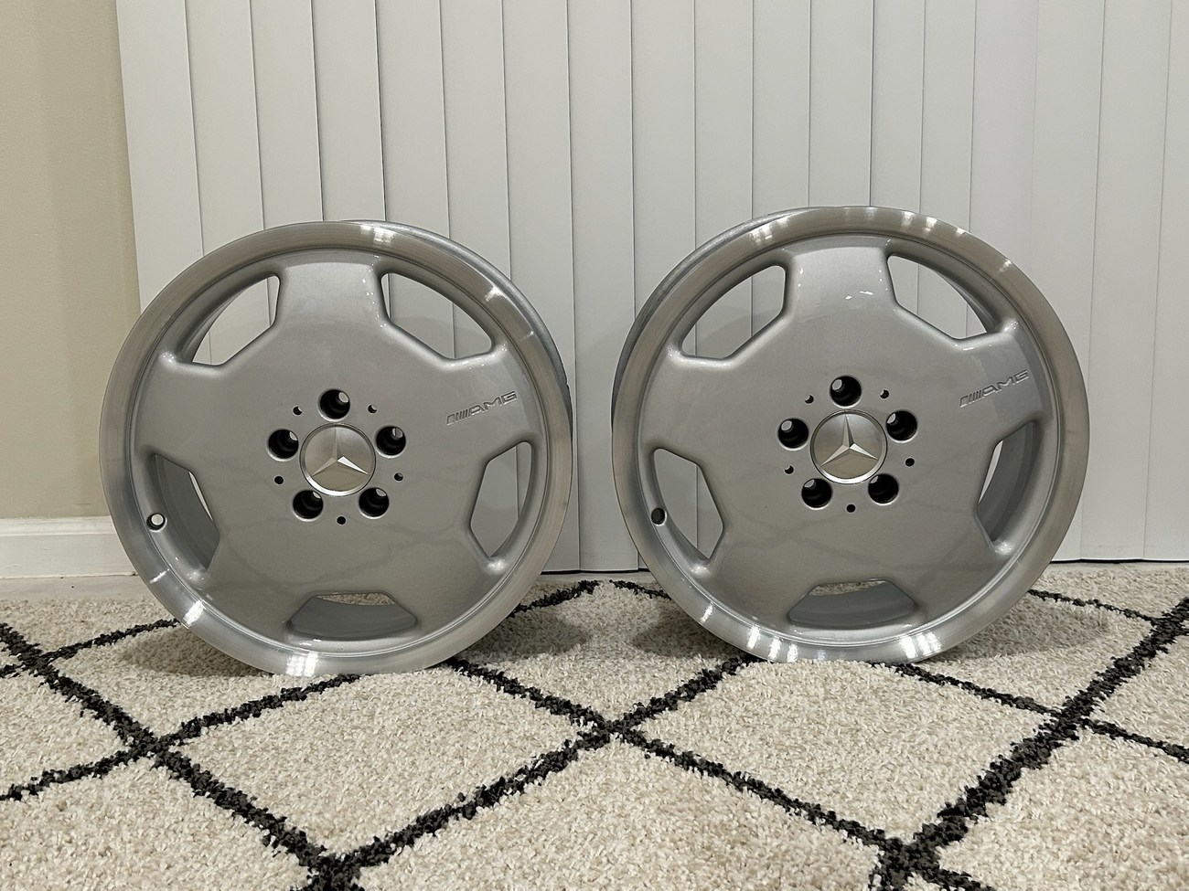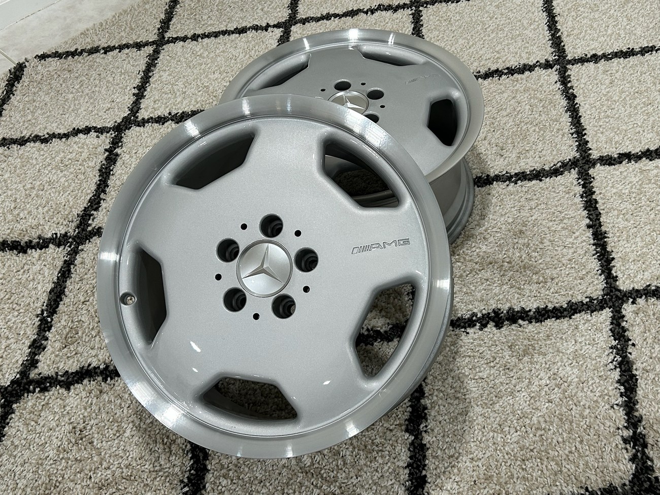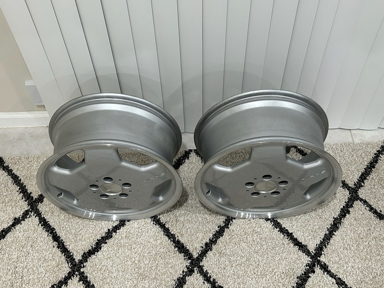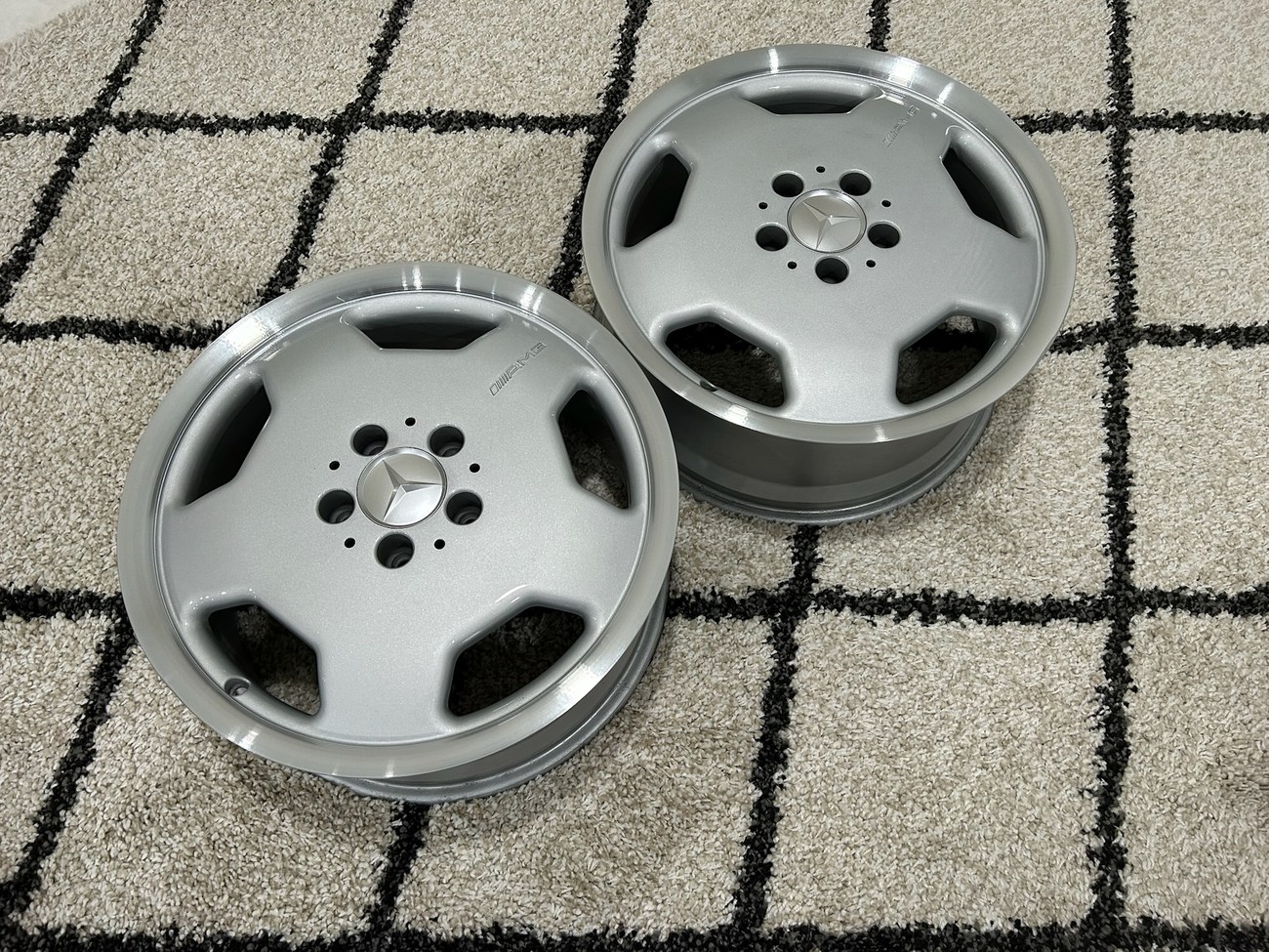 This pair of 17″ Aero II AMG Monoblock wheels measure 7.5″ in width and were manufactured by Mercedes-Benz for use on W124 vehicles including the sedan, wagon, coupe and cabriolet. The faces are finished in silver with machined lips and show AMG HWA124 stamped part numbers on the back. Dimensions, offsets, and other manufacturer casting marks are present on each wheel. Both wheels have been professionally refinished in preparation for the sale and Mercedes-Benz center caps are included. These rare W124 AMG monoblock wheels are now offered in Boca Raton, Florida with shipping options available from the seller.