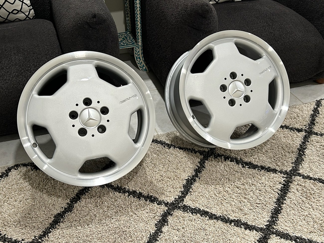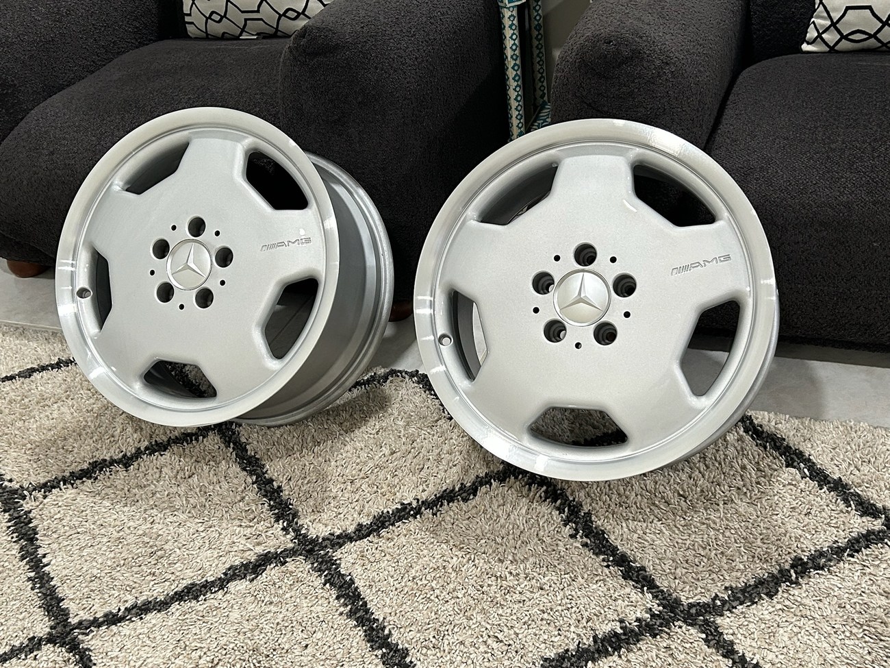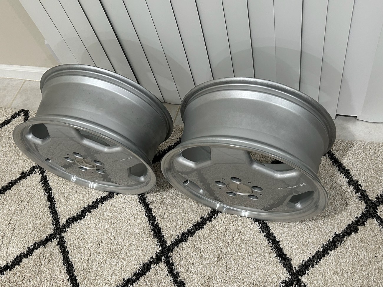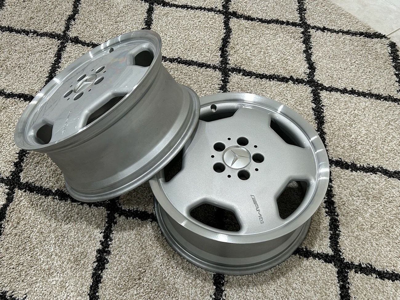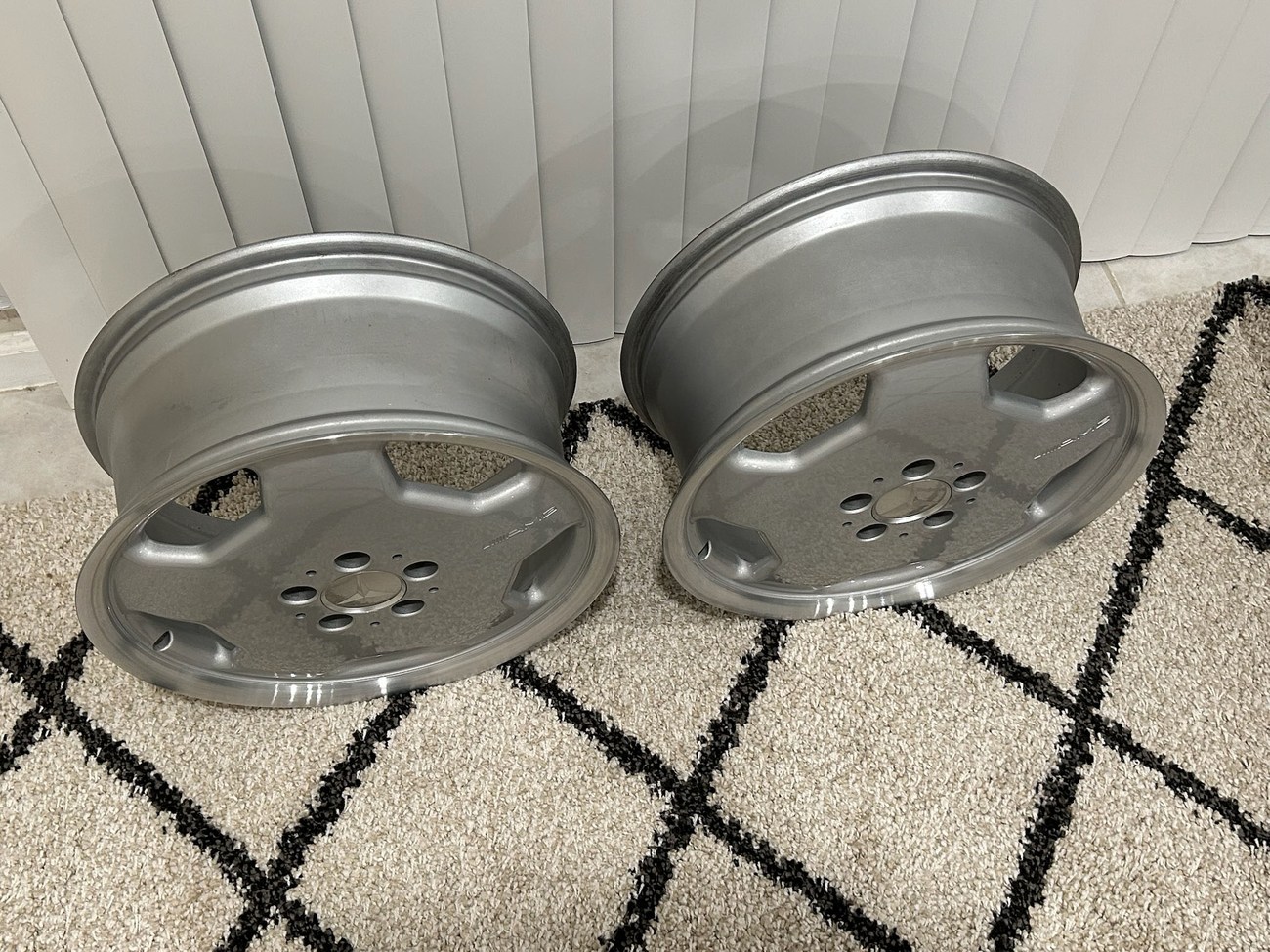 This pair of 17″ Aero II AMG Monoblock wheels measure 7.5″ in width and were manufactured by Mercedes-Benz for use on W124 vehicles including the sedan, wagon, coupe and cabriolet. The faces are finished in silver with machined lips and show AMG HWA124 stamped part numbers on the back. Dimensions, offsets, and other manufacturer casting marks are present on each wheel. Both wheels have been professionally refinished in preparation for the sale and Mercedes-Benz center caps are included. These rare W124 AMG monoblock wheels are now offered in Boca Raton, Florida with shipping options available from the seller.
