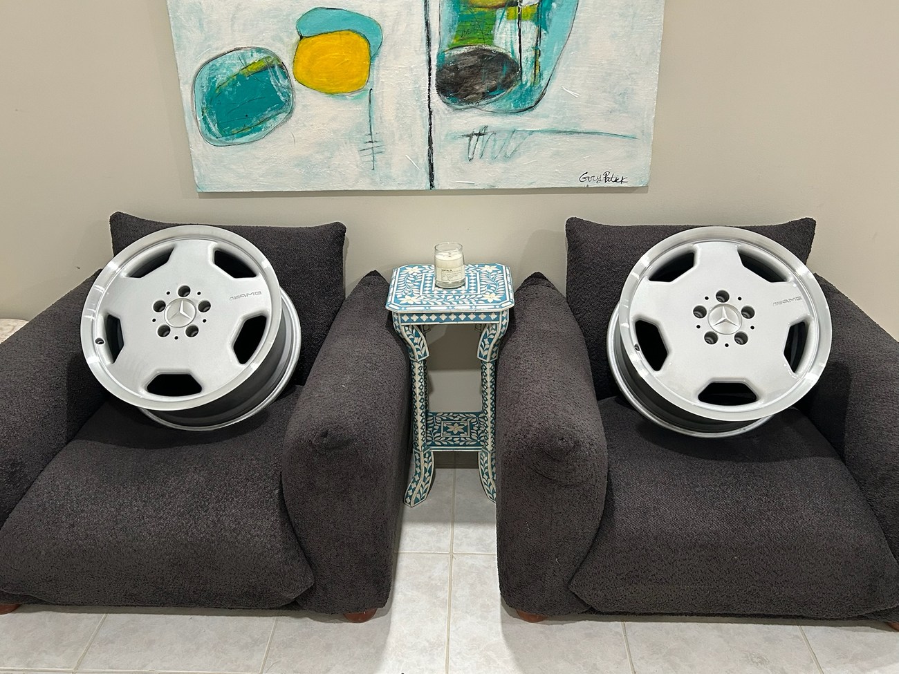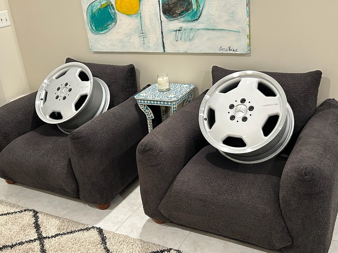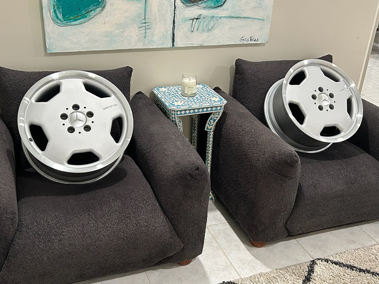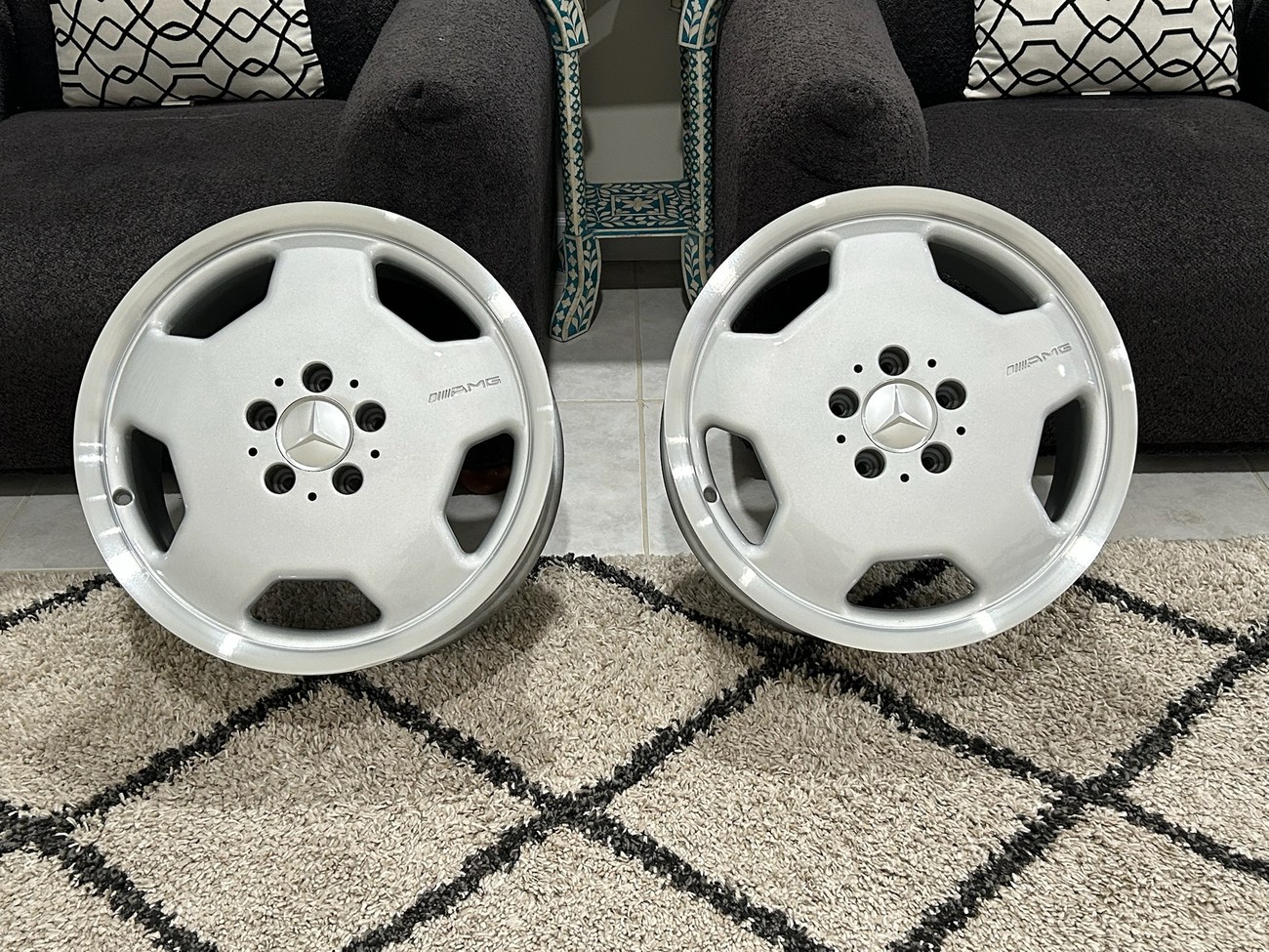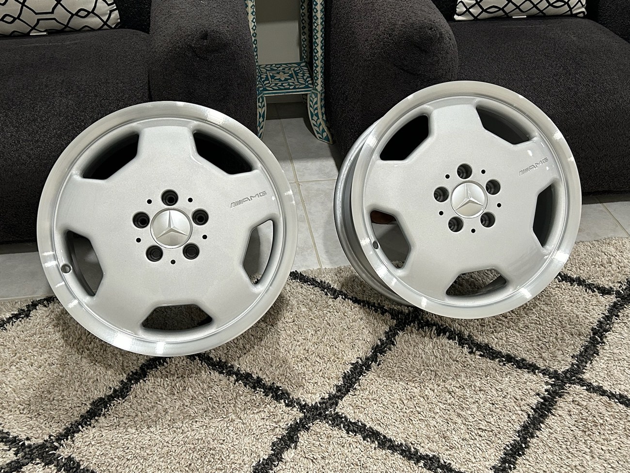 This pair of 17″ Aero II AMG Monoblock wheels measure 7.5″ in width and were manufactured by Mercedes-Benz for use on W124 vehicles including the sedan, wagon, coupe and cabriolet. The faces are finished in silver with machined lips and show AMG HWA124 stamped part numbers on the back. Dimensions, offsets, and other manufacturer casting marks are present on each wheel. Both wheels have been professionally refinished in preparation for the sale and Mercedes-Benz center caps are included. These rare W124 AMG monoblock wheels are now offered in Boca Raton, Florida with shipping options available from the seller.