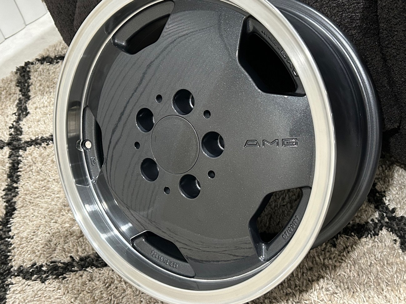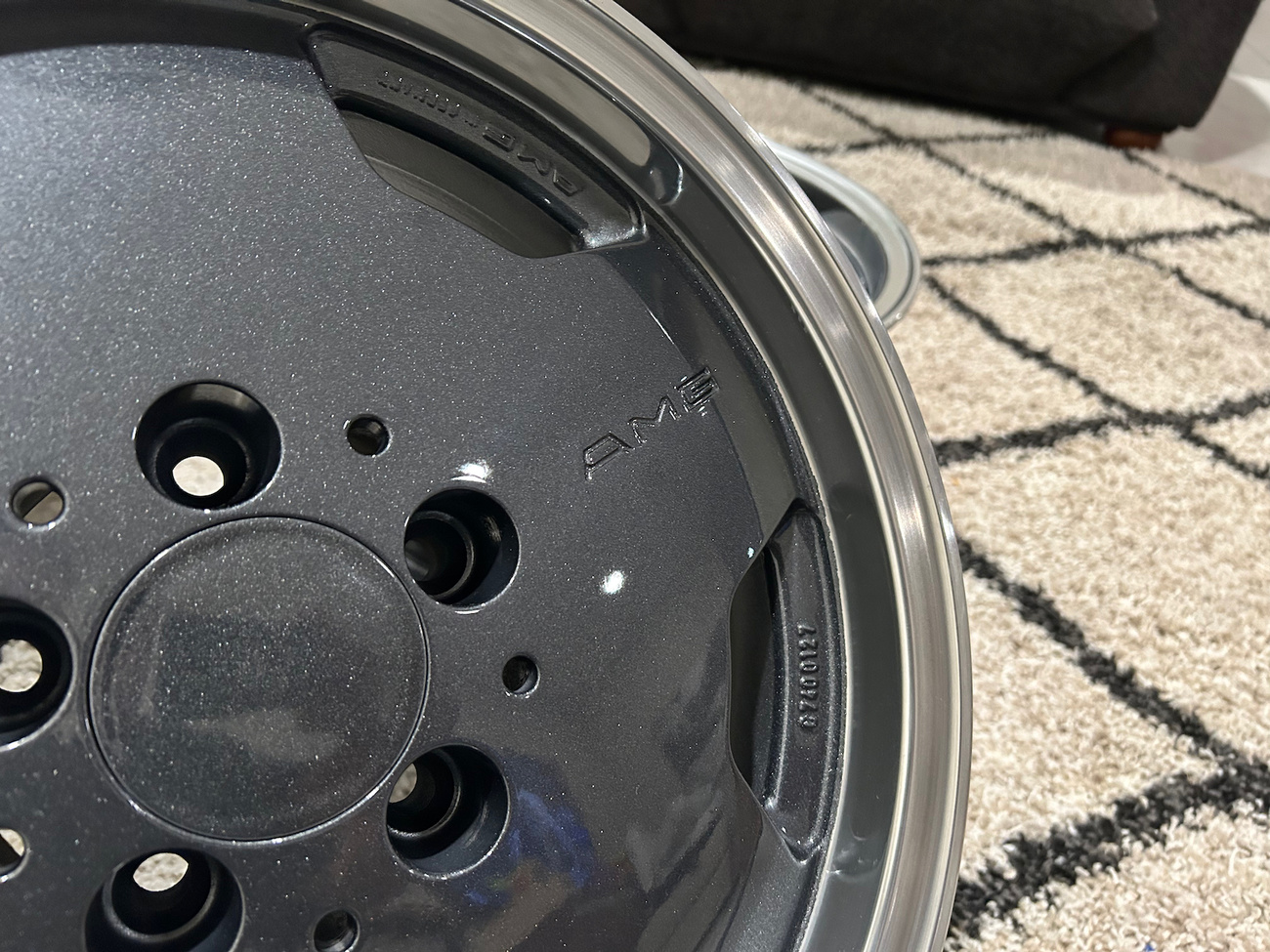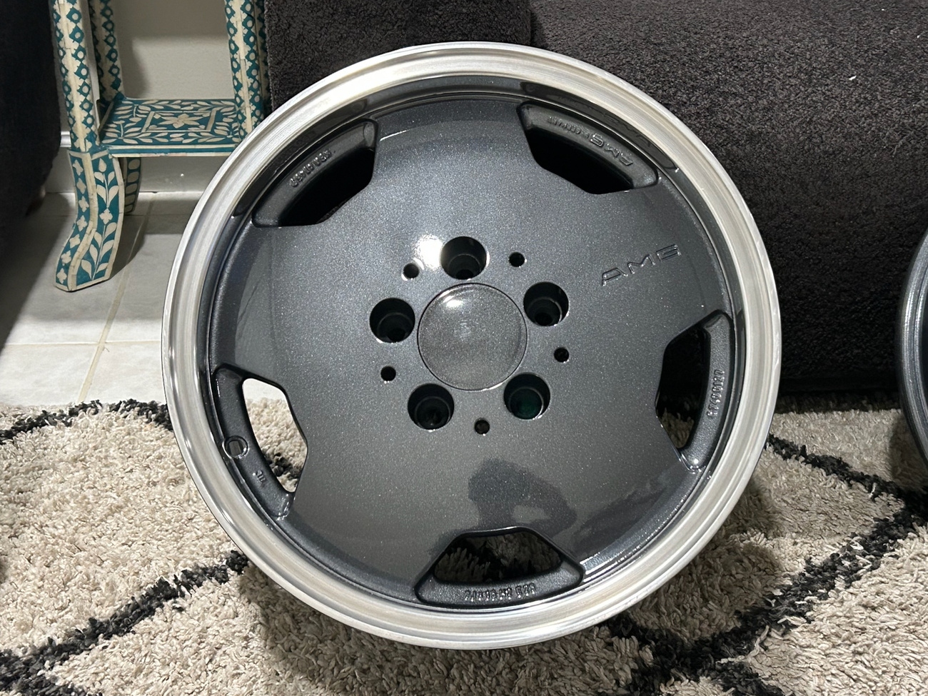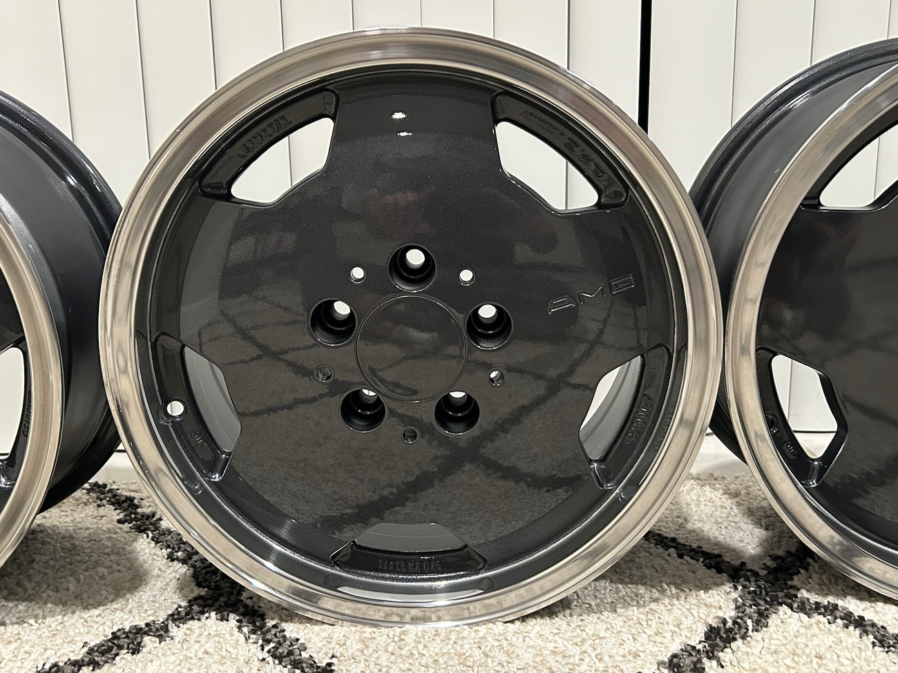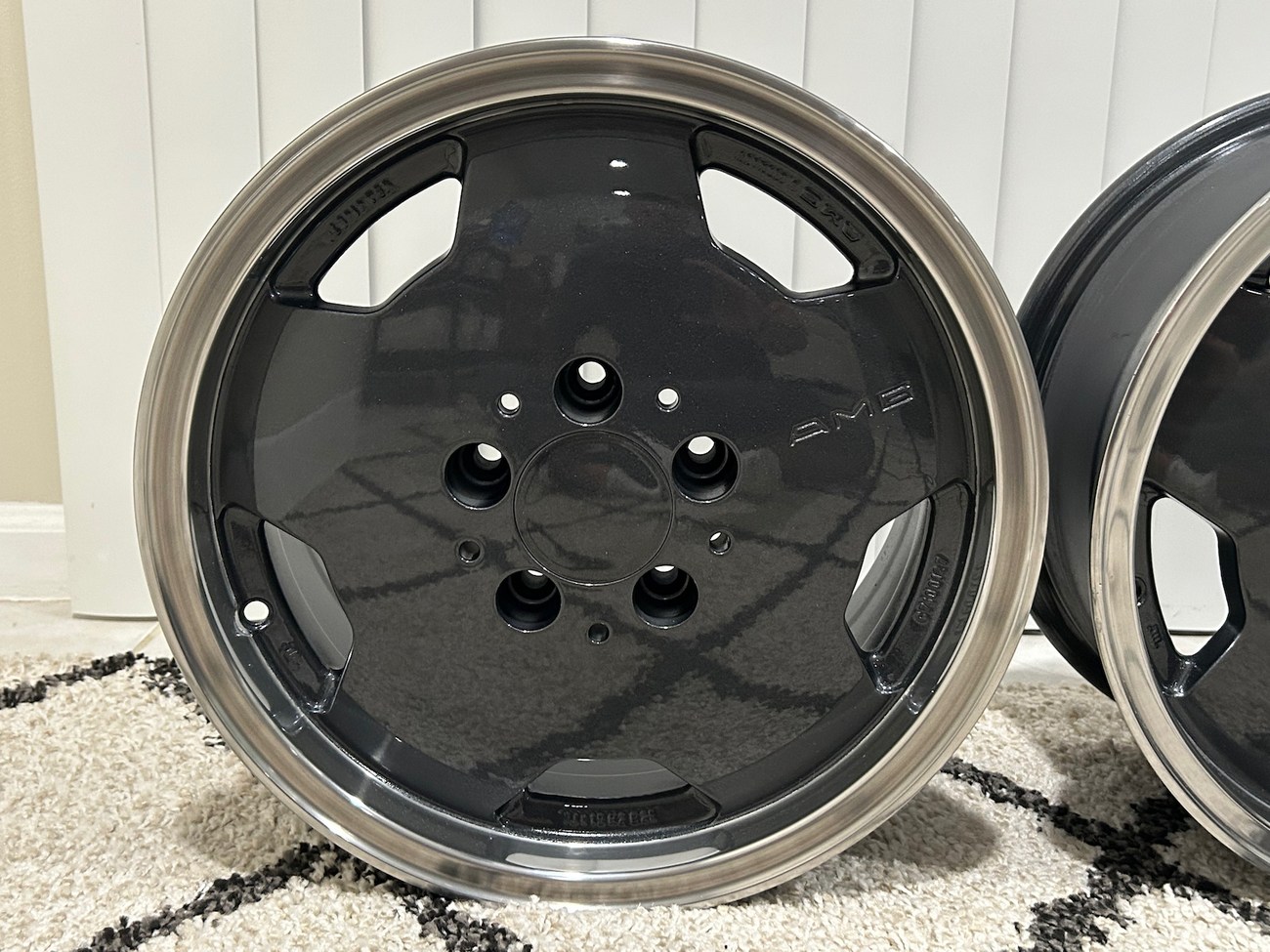 These 5-hole monoblock Aero I wheels were originally fitted to a W201 by AMG but can be fitted to other models as well. The faces are freshly painted in Black Pearl Metallic (199), aka Blue Black Metallic, with polished lips. Up close photos of each face are provided in the gallery and the premerger AMG script can be seen on each with part numbers C7400127.