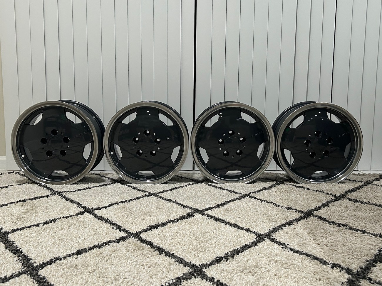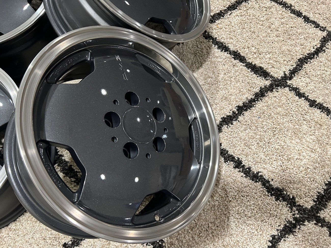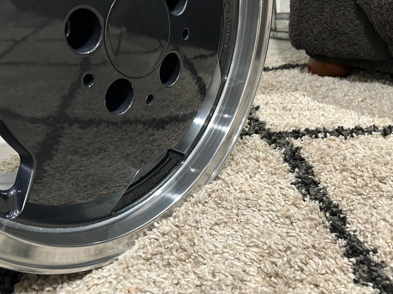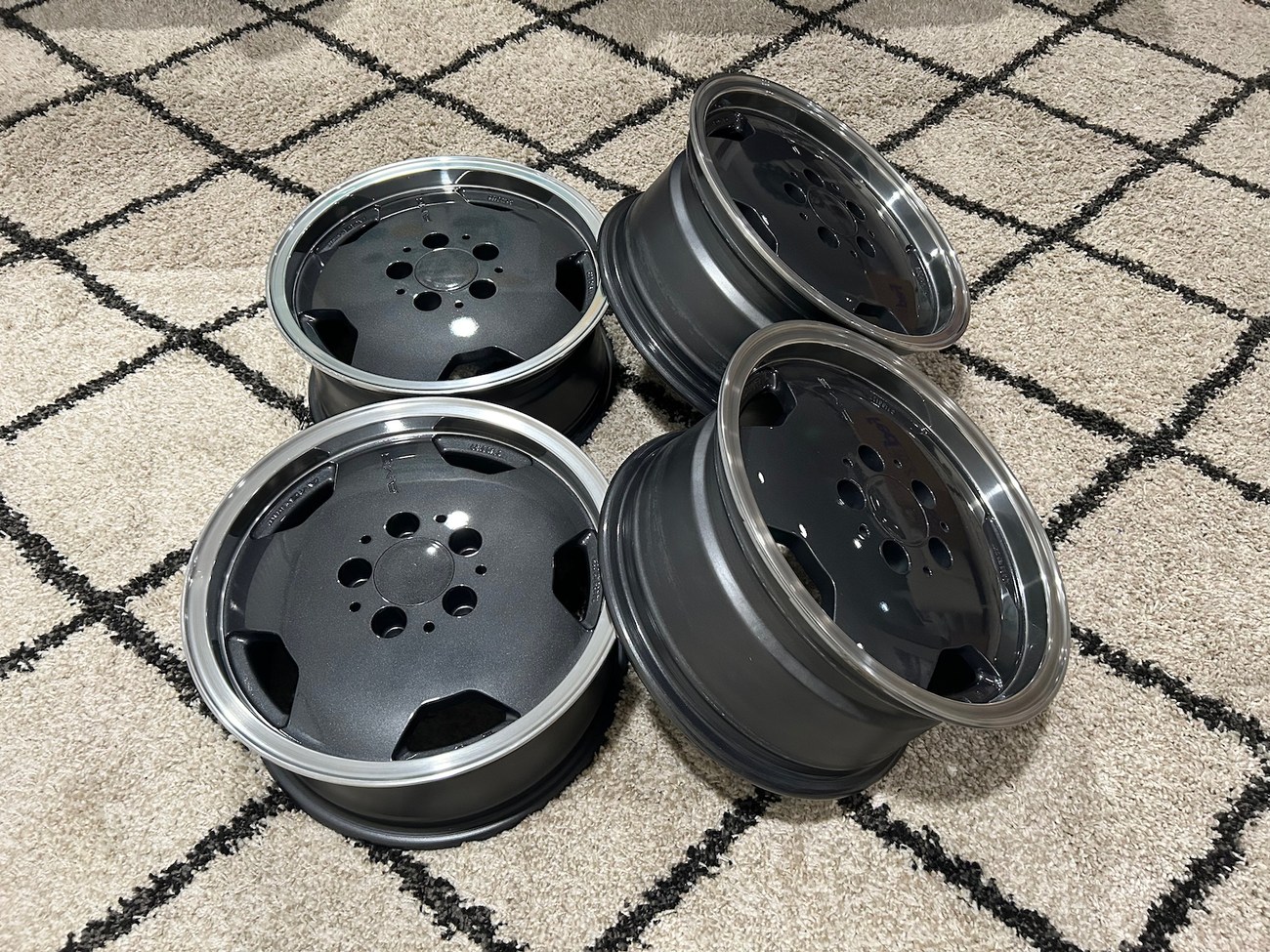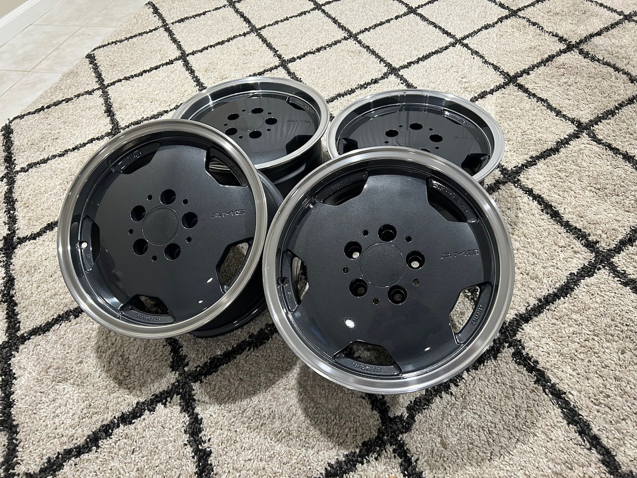 These 5-hole monoblock Aero I wheels were originally fitted to a W201 by AMG but can be fitted to other models as well. The faces are freshly painted in Black Pearl Metallic (199), aka Blue Black Metallic, with polished lips. Up close photos of each face are provided in the gallery and the premerger AMG script can be seen on each with part numbers C7400127.