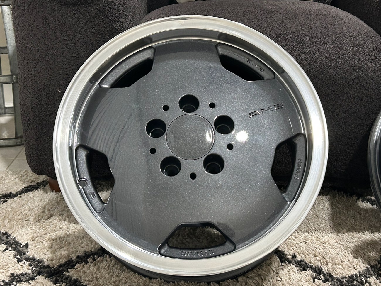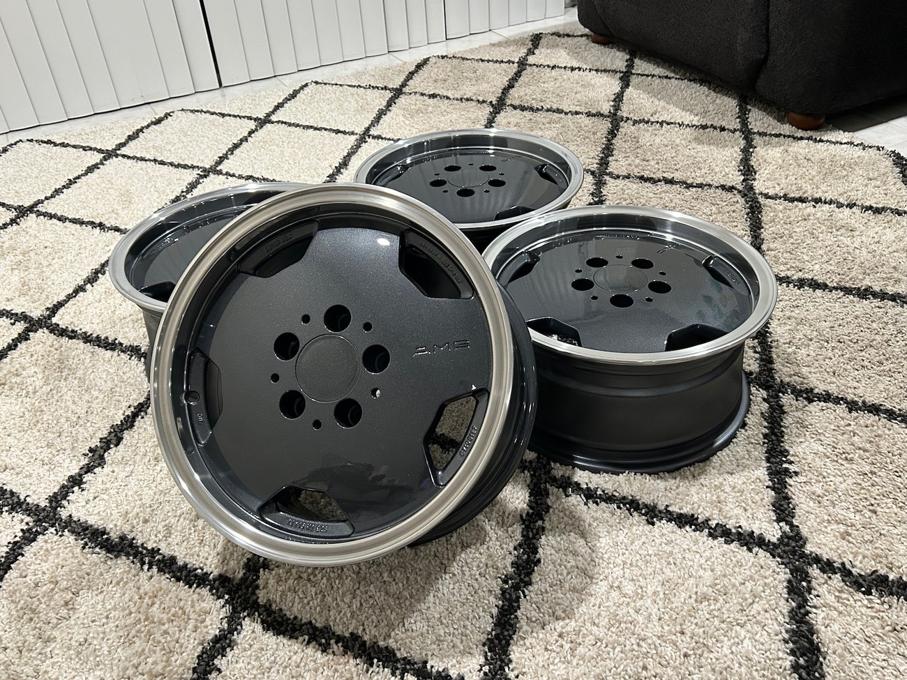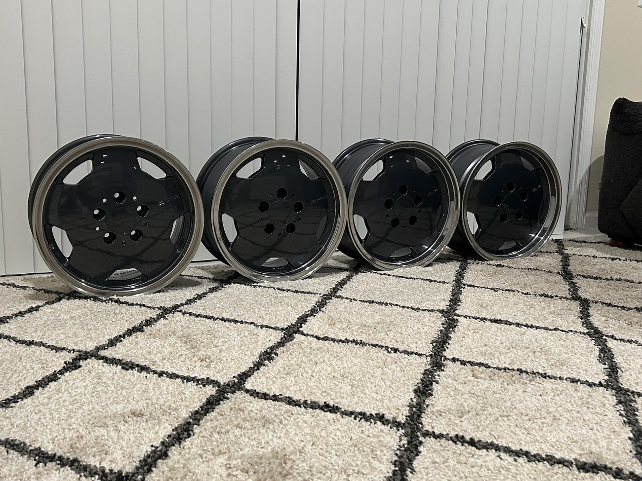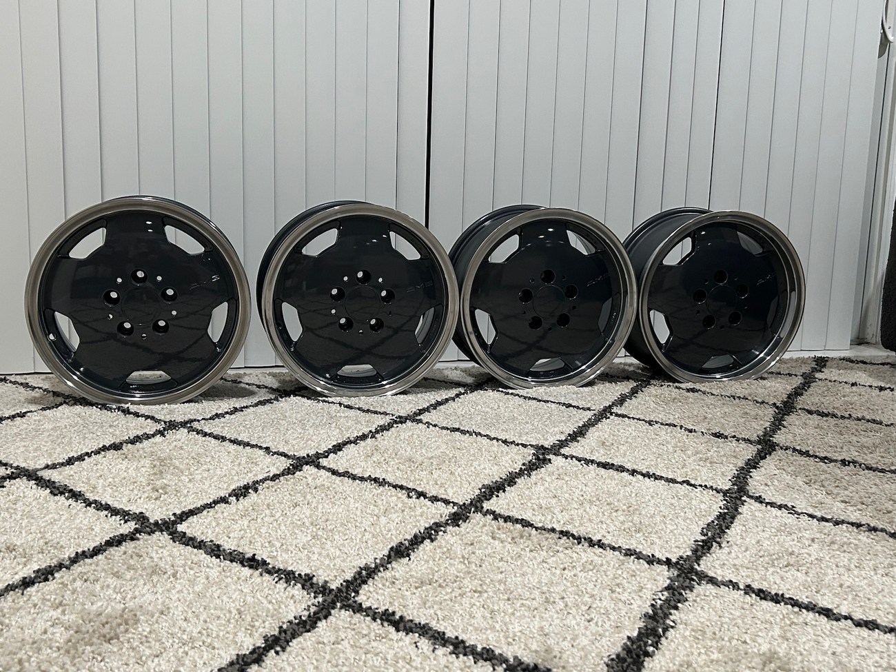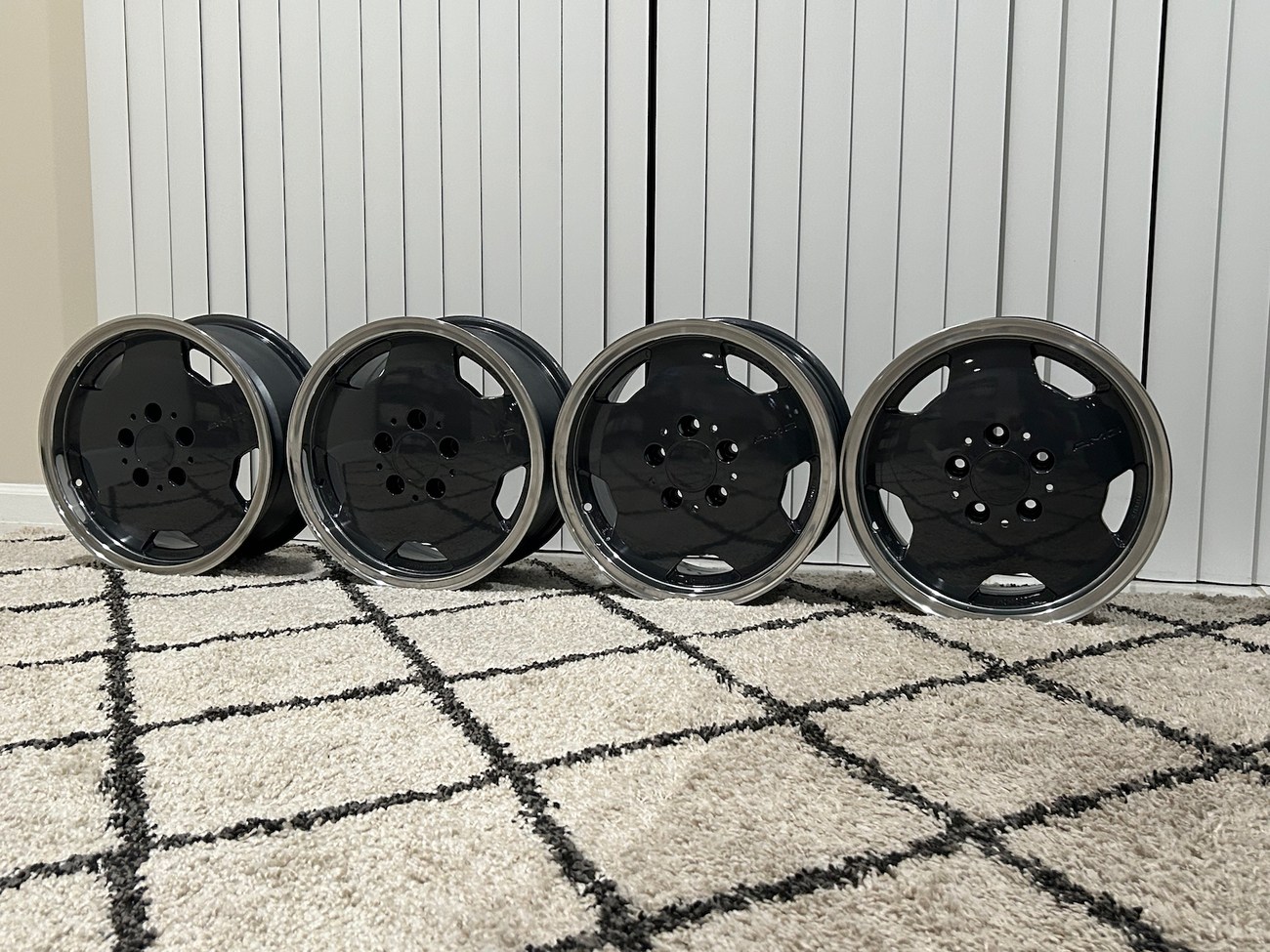 These 5-hole monoblock Aero I wheels were originally fitted to a W201 by AMG but can be fitted to other models as well. The faces are freshly painted in Black Pearl Metallic (199), aka Blue Black Metallic, with polished lips. Up close photos of each face are provided in the gallery and the premerger AMG script can be seen on each with part numbers C7400127.