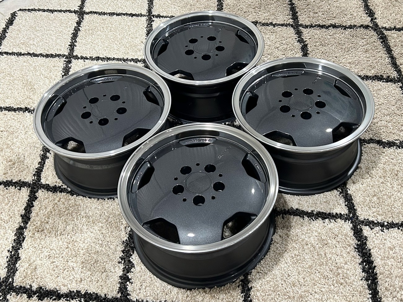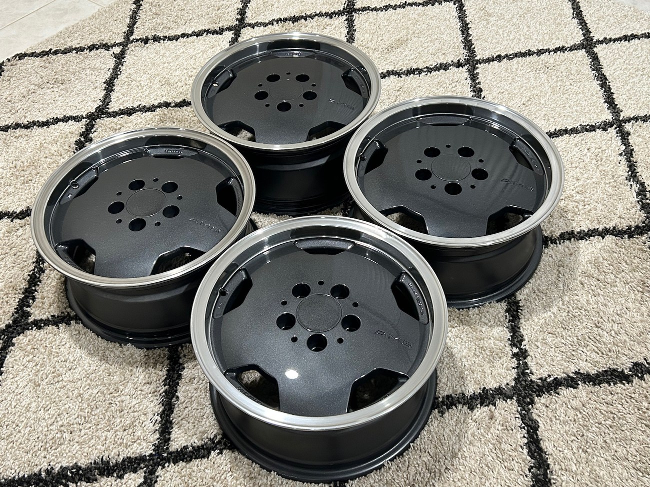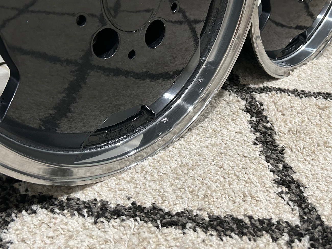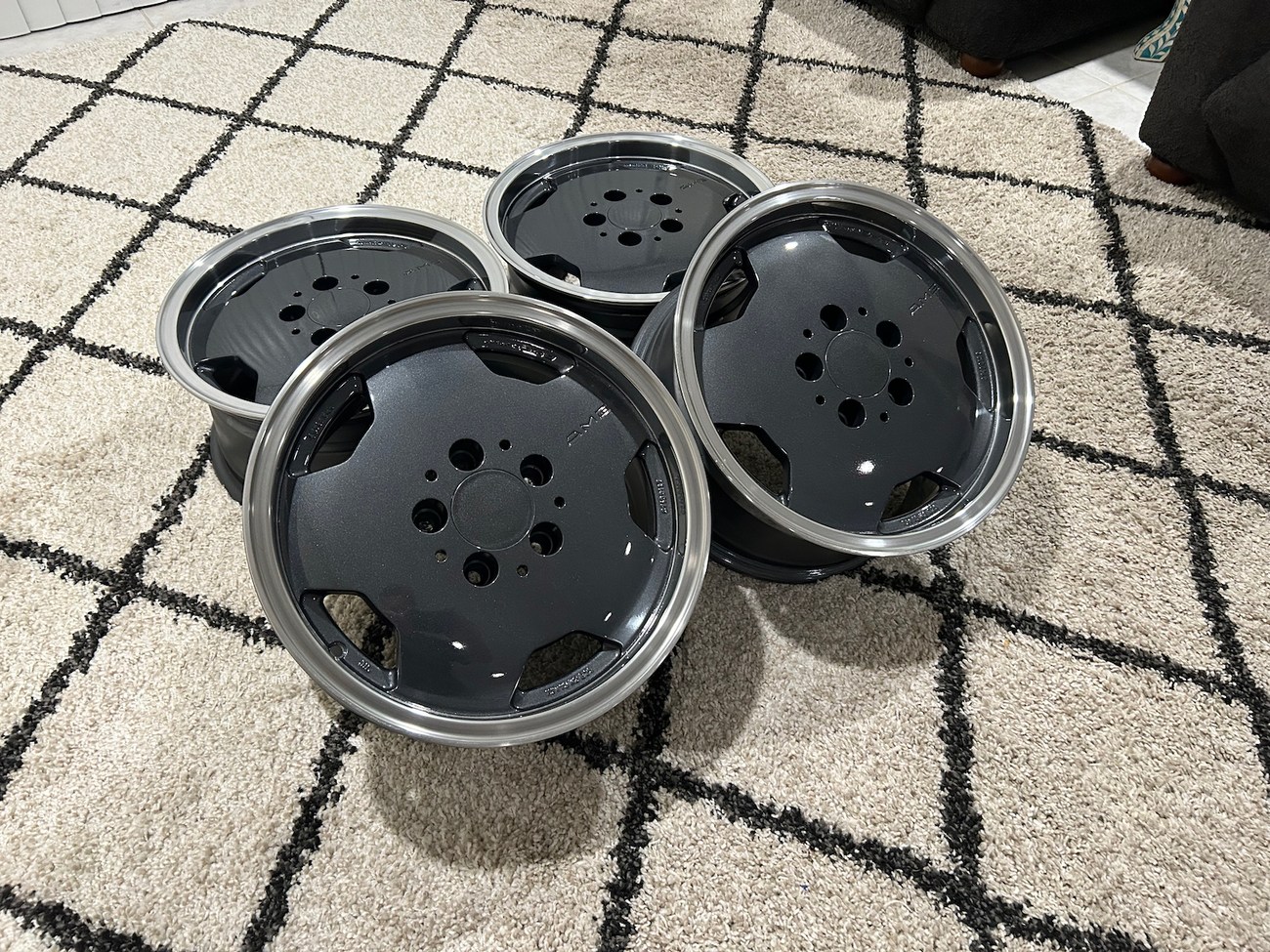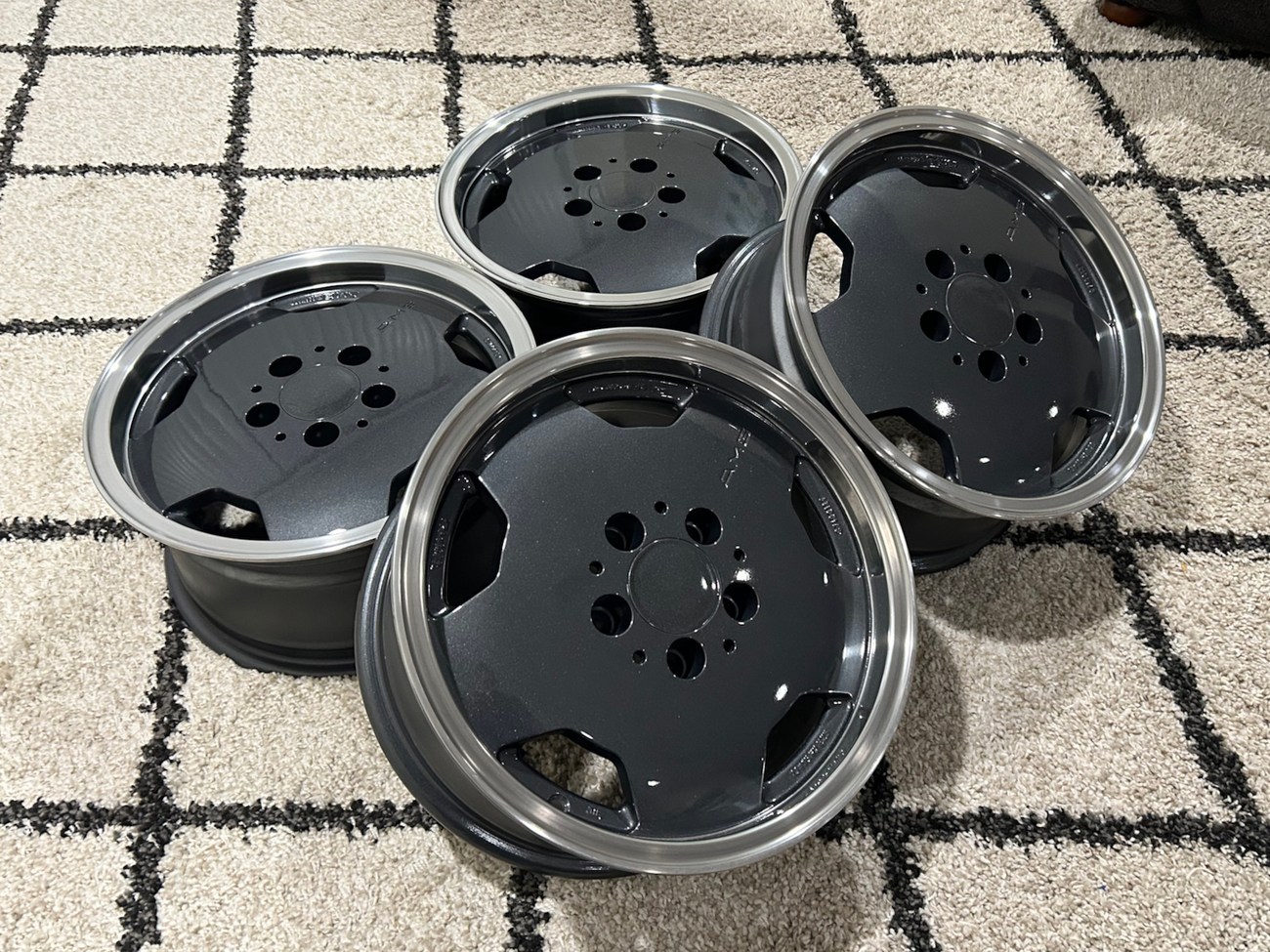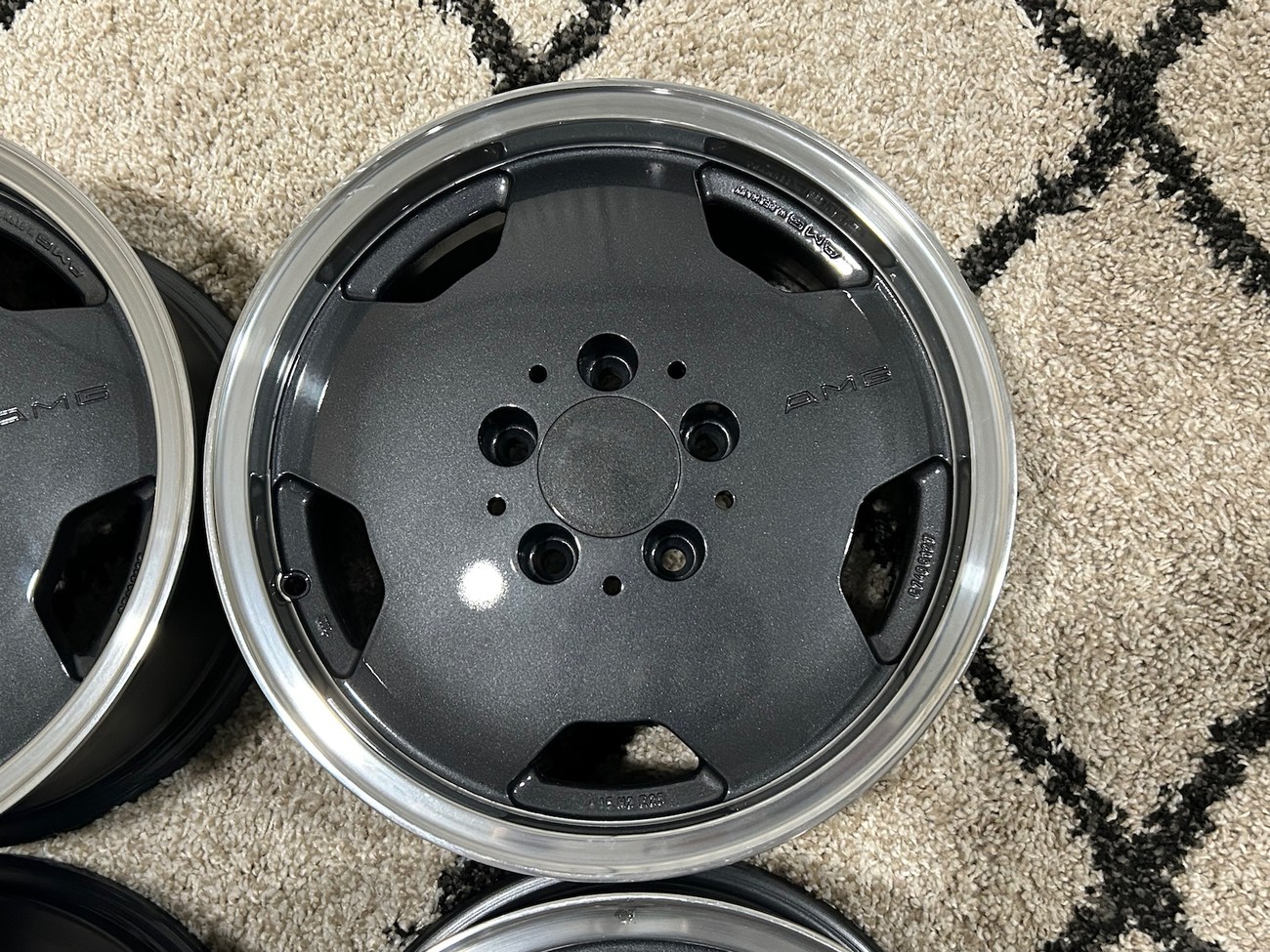 These 5-hole monoblock Aero I wheels were originally fitted to a W201 by AMG but can be fitted to other models as well. The faces are freshly painted in Black Pearl Metallic (199), aka Blue Black Metallic, with polished lips. Up close photos of each face are provided in the gallery and the premerger AMG script can be seen on each with part numbers C7400127.