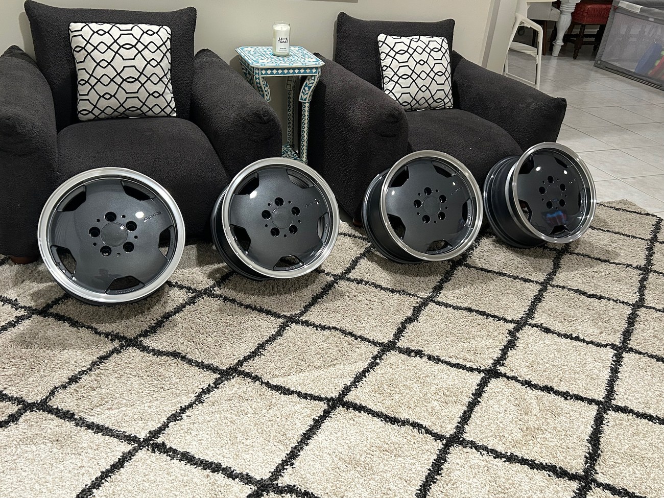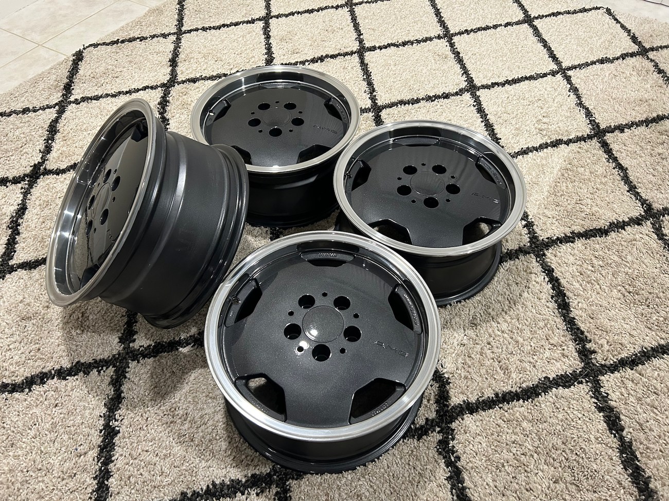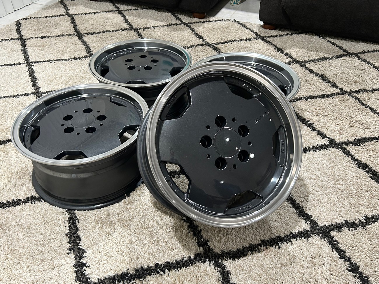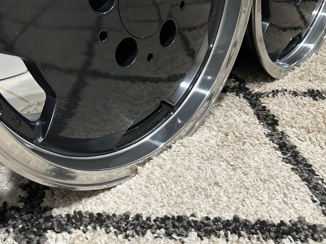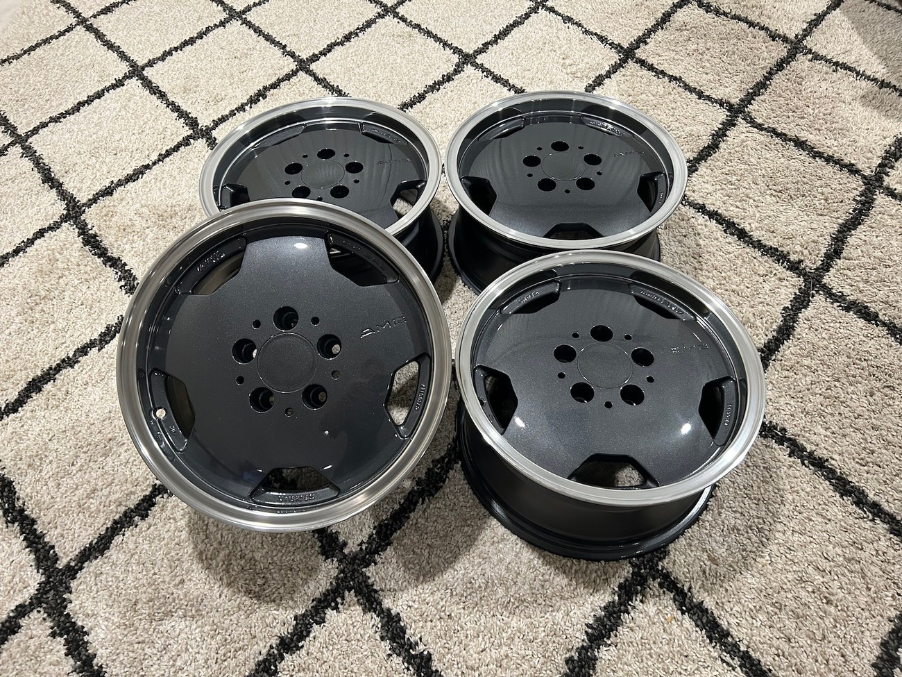 These 5-hole monoblock Aero I wheels were originally fitted to a W201 by AMG but can be fitted to other models as well. The faces are freshly painted in Black Pearl Metallic (199), aka Blue Black Metallic, with polished lips. Up close photos of each face are provided in the gallery and the premerger AMG script can be seen on each with part numbers C7400127.