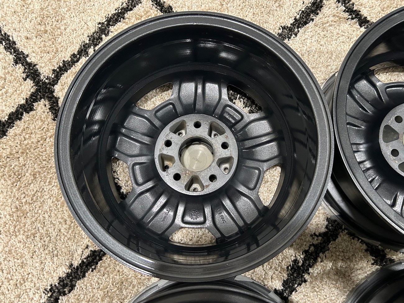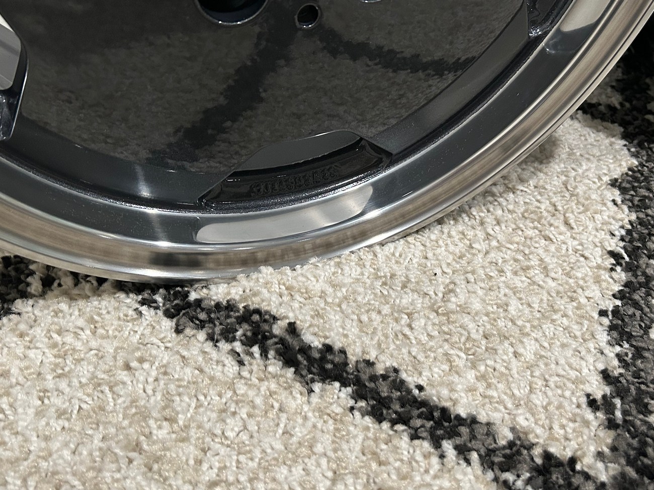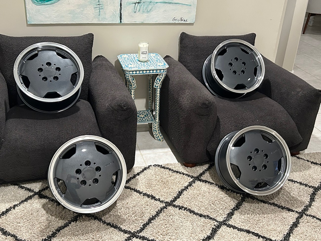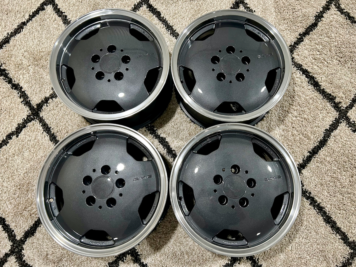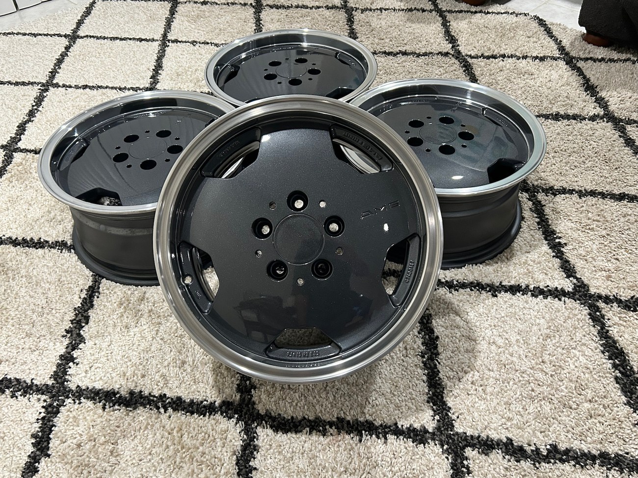 These 5-hole monoblock Aero I wheels were originally fitted to a W201 by AMG but can be fitted to other models as well. The faces are freshly painted in Black Pearl Metallic (199), aka Blue Black Metallic, with polished lips. Up close photos of each face are provided in the gallery and the premerger AMG script can be seen on each with part numbers C7400127.
