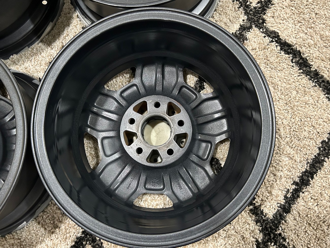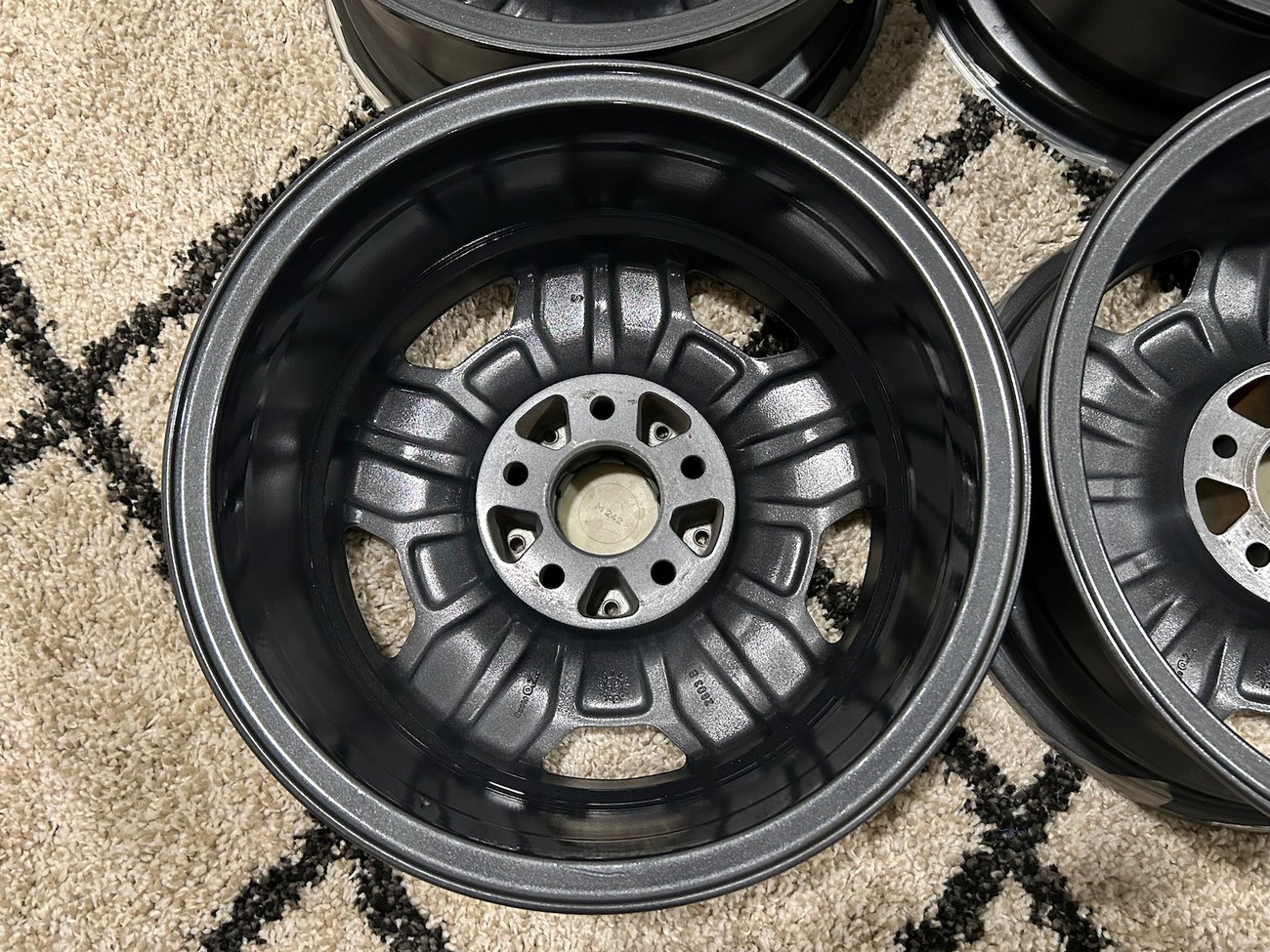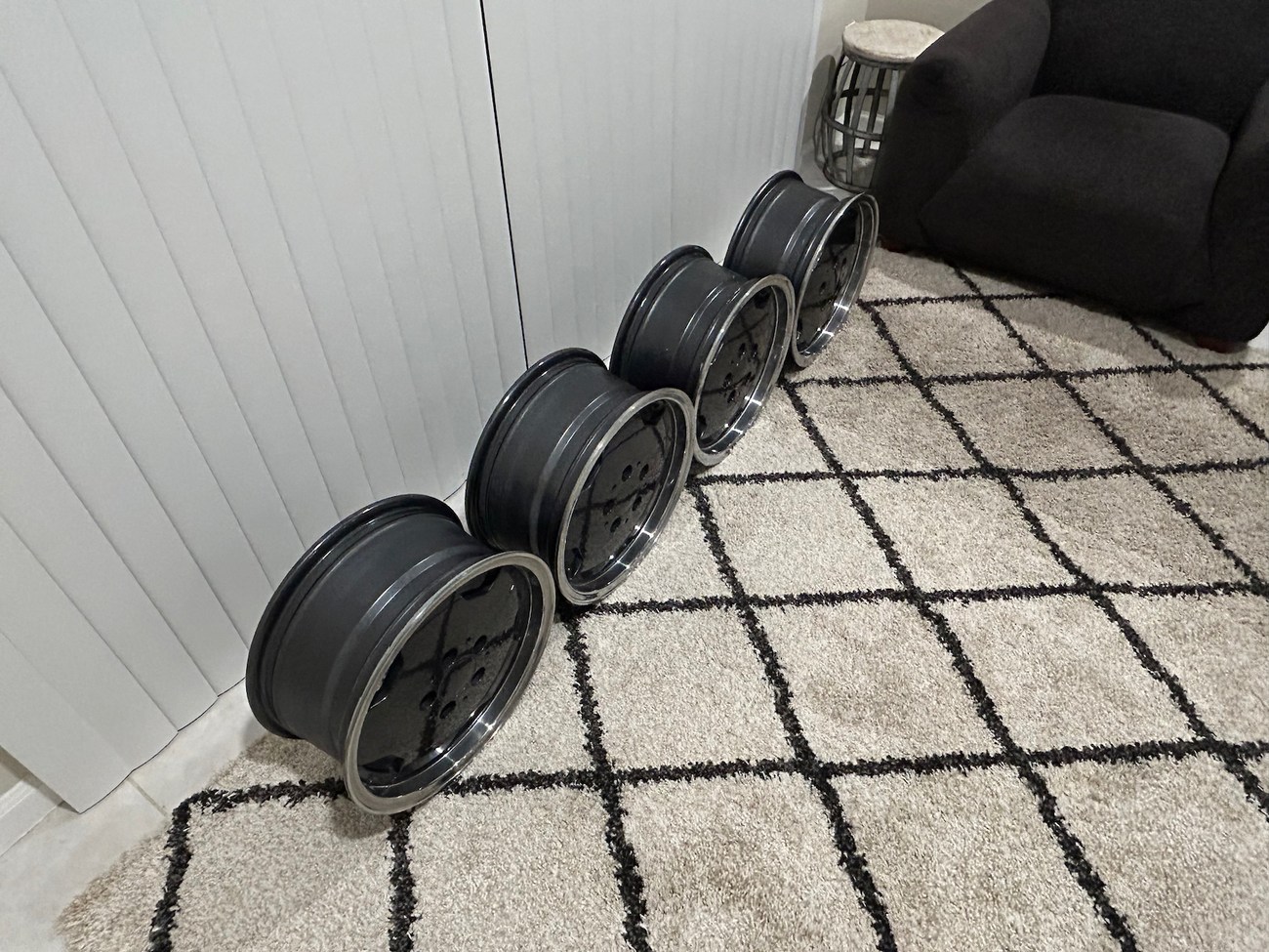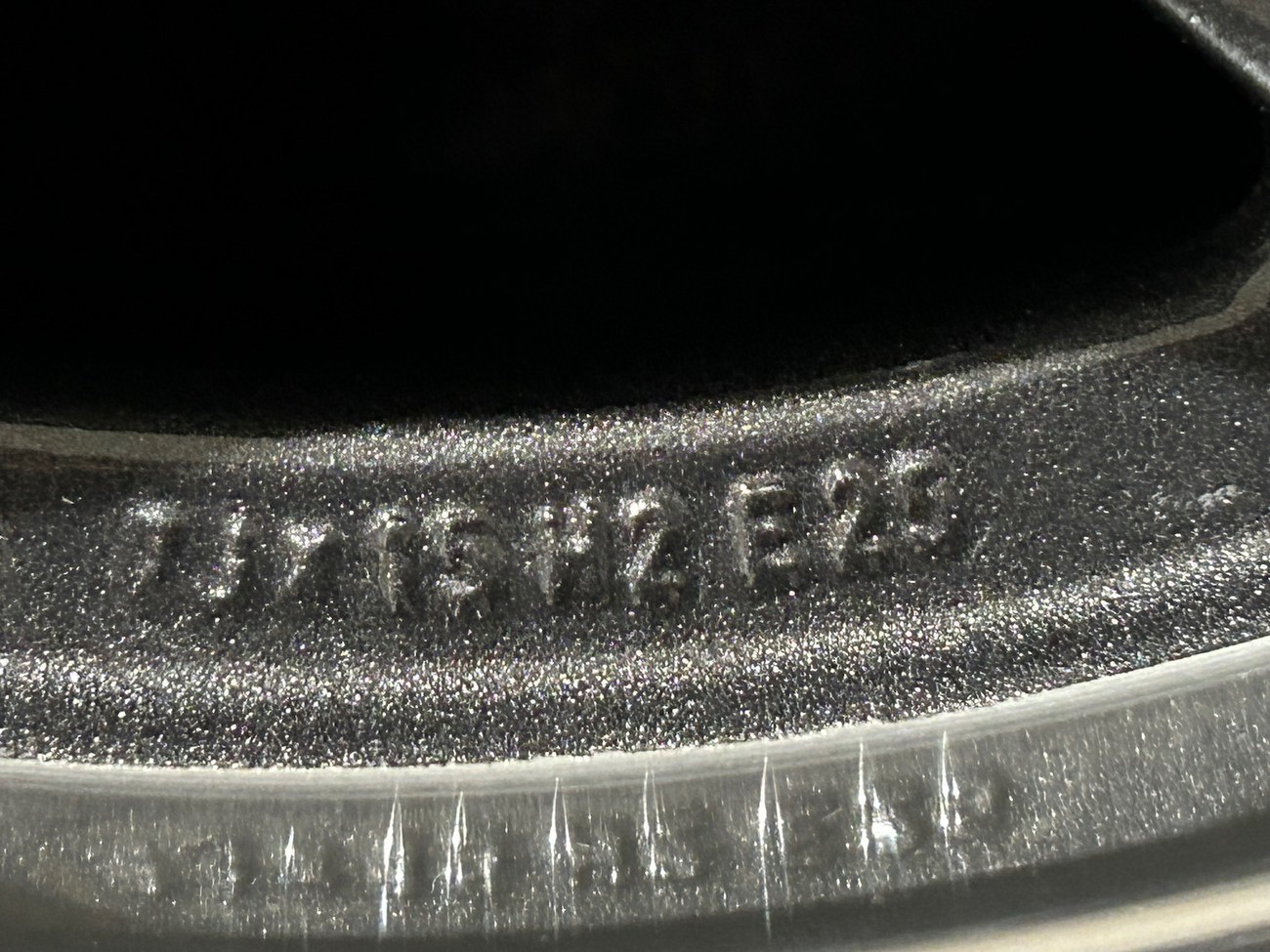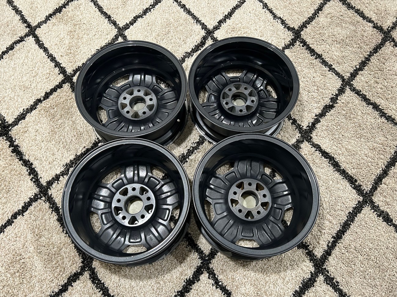 These 5-hole monoblock Aero I wheels were originally fitted to a W201 by AMG but can be fitted to other models as well. The faces are freshly painted in Black Pearl Metallic (199), aka Blue Black Metallic, with polished lips. Up close photos of each face are provided in the gallery and the premerger AMG script can be seen on each with part numbers C7400127.