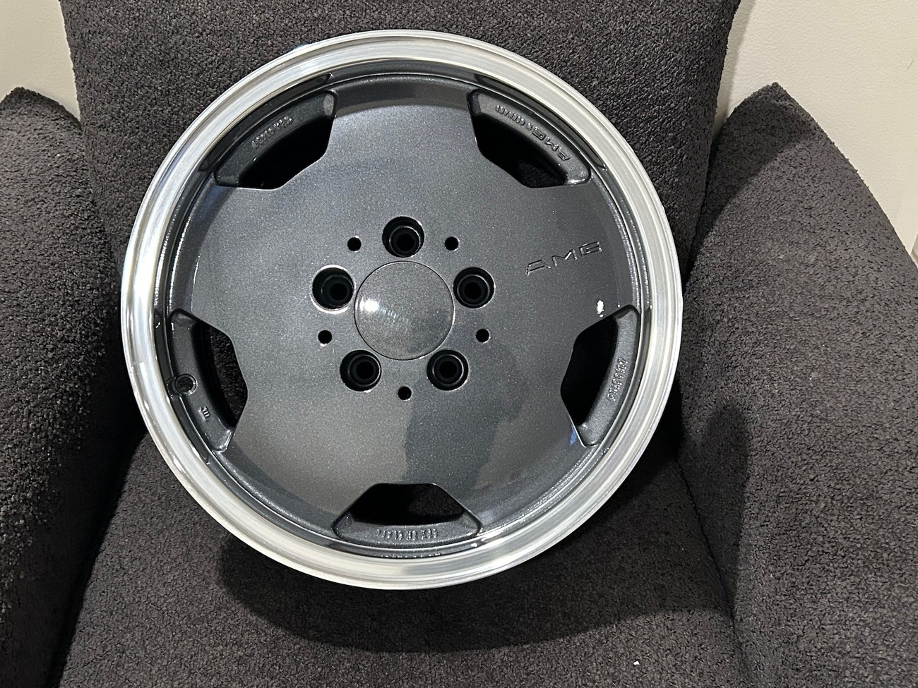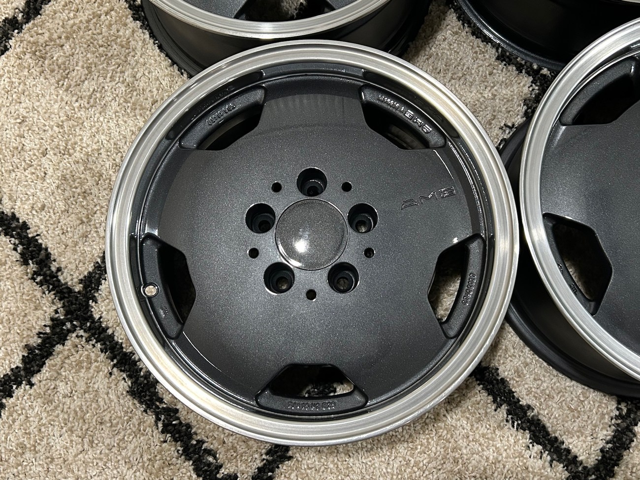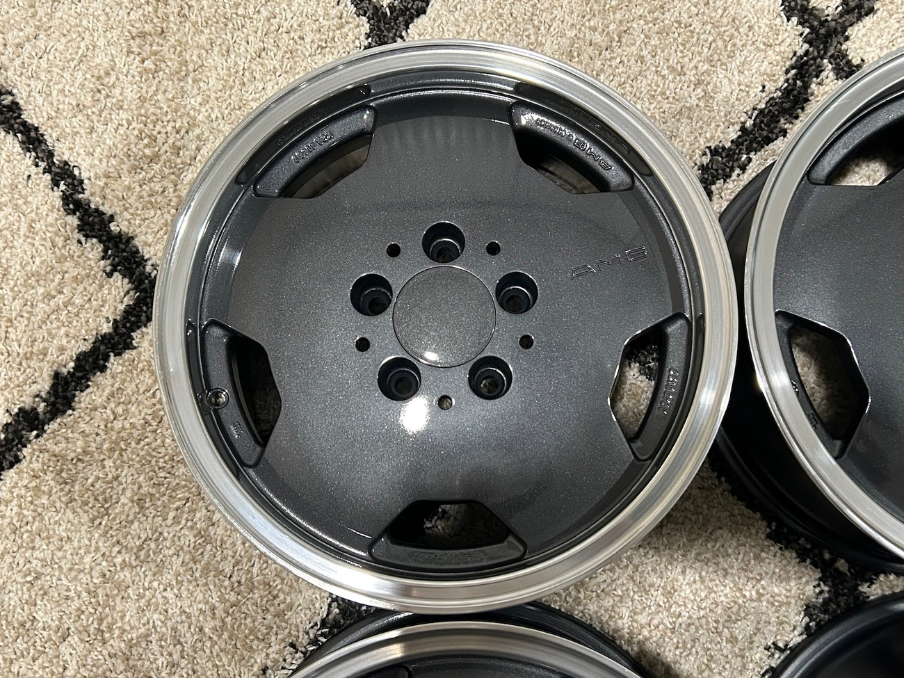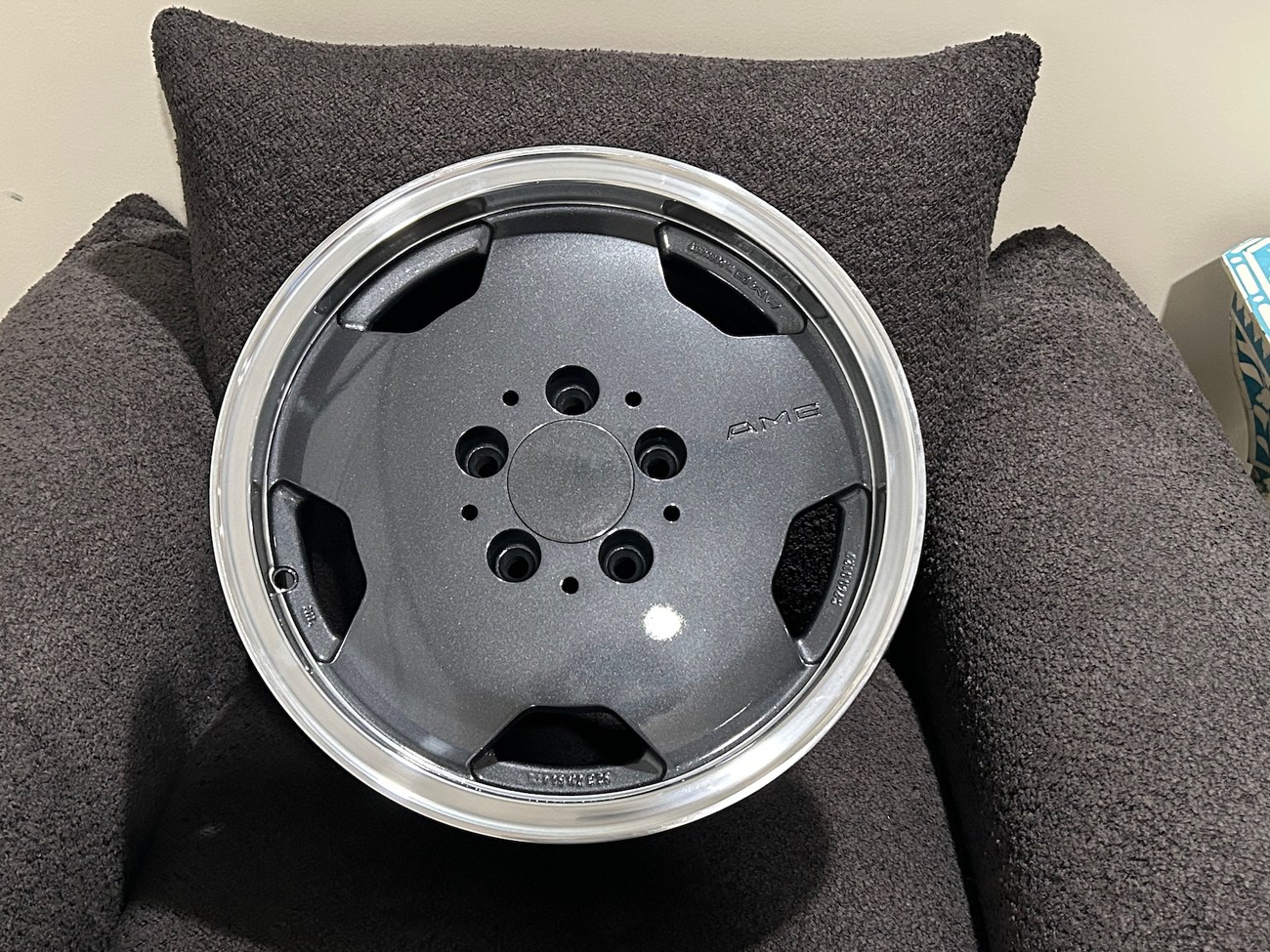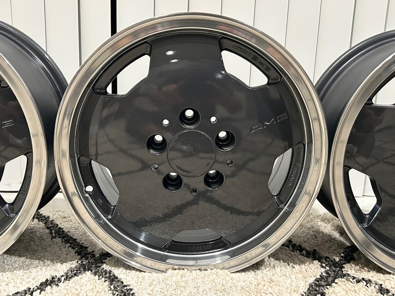 These 15″ AMG Aero I Monoblock wheels measure 7″ in width all around and were manufactured by O.Z. exclusively for AMG in W. Germany for use on Mercedes-Benz AMG vehicles. The faces are finished in Black Pearl Metallic (199), aka Blue Black Metallic, with polished lips and show part number C7400127. Four authentic AMG flat center caps are included in the sale. These are the earlier versions of the Aero I which do not have MB part numbers and feature the desireable premerger AMG script. The wheels have been professionally refinished in preparation for the sale. These AMG wheels are now offered at by the seller in Boca Raton, Florida with worldwide shipping available and quotes available upon request.