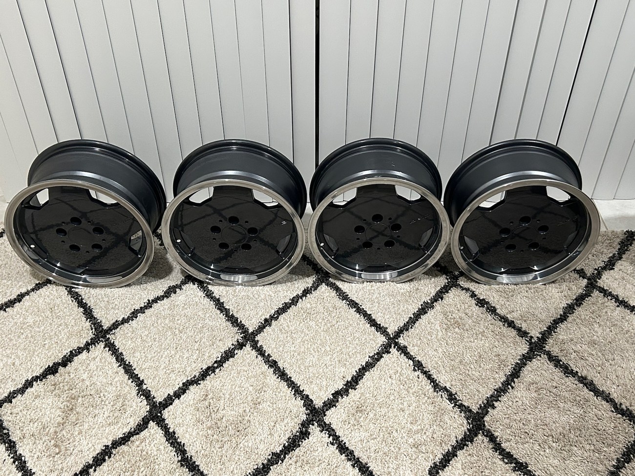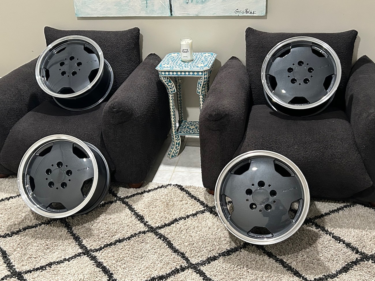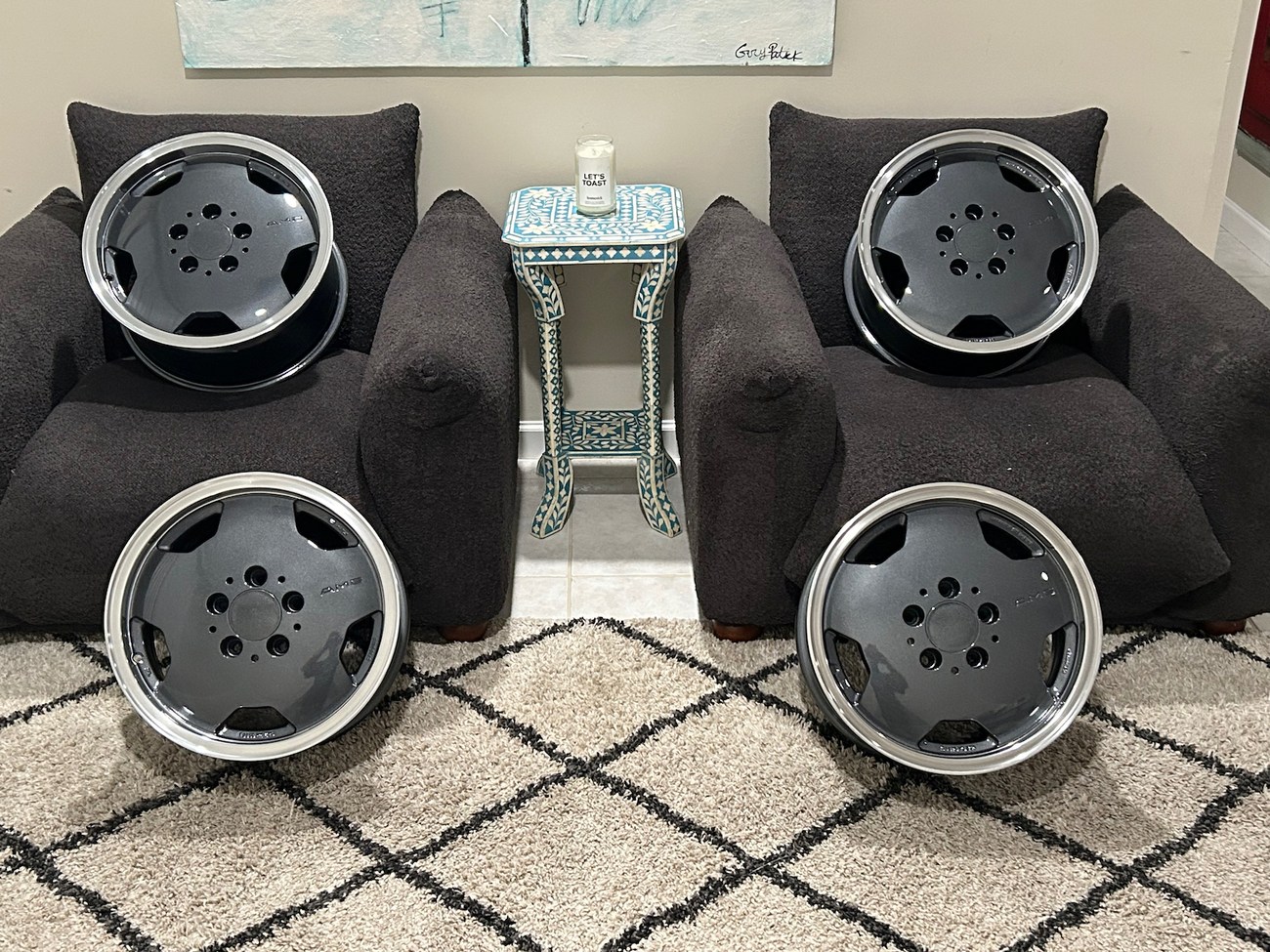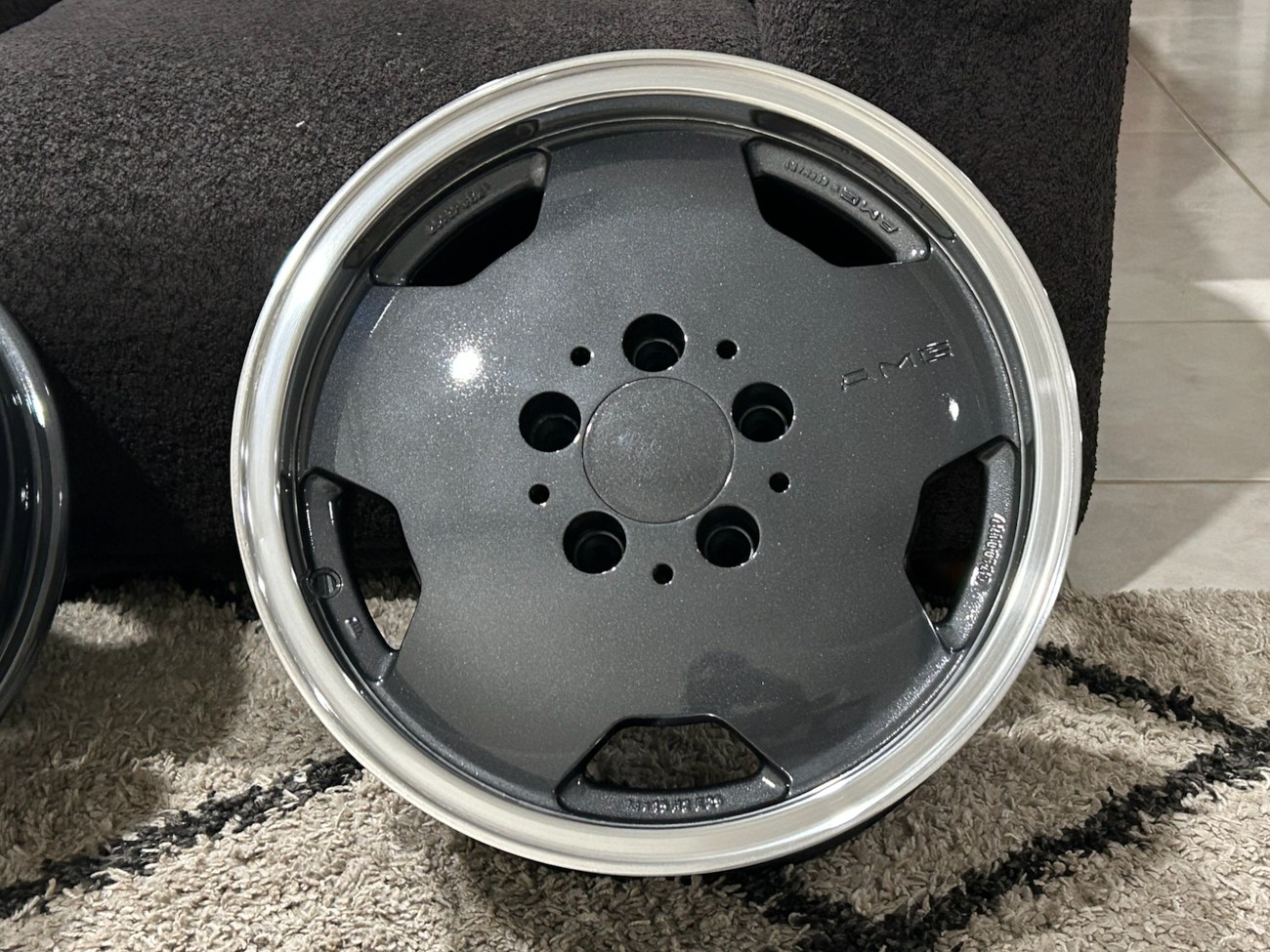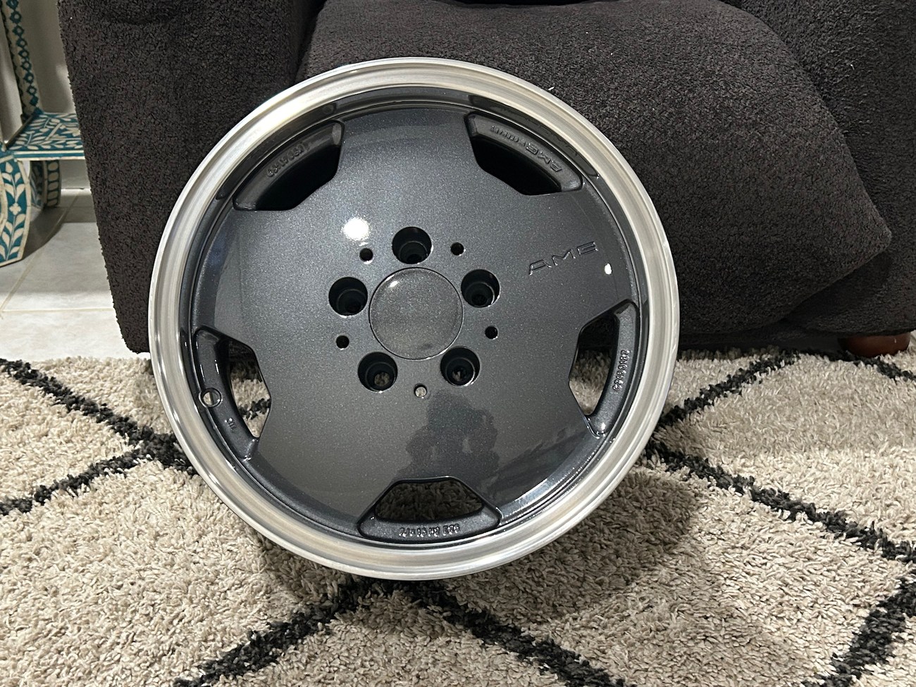 These 15″ AMG Aero I Monoblock wheels measure 7″ in width all around and were manufactured by O.Z. exclusively for AMG in W. Germany for use on Mercedes-Benz AMG vehicles. The faces are finished in Black Pearl Metallic (199), aka Blue Black Metallic, with polished lips and show part number C7400127. Four authentic AMG flat center caps are included in the sale. These are the earlier versions of the Aero I which do not have MB part numbers and feature the desireable premerger AMG script. The wheels have been professionally refinished in preparation for the sale. These AMG wheels are now offered at by the seller in Boca Raton, Florida with worldwide shipping available and quotes available upon request.