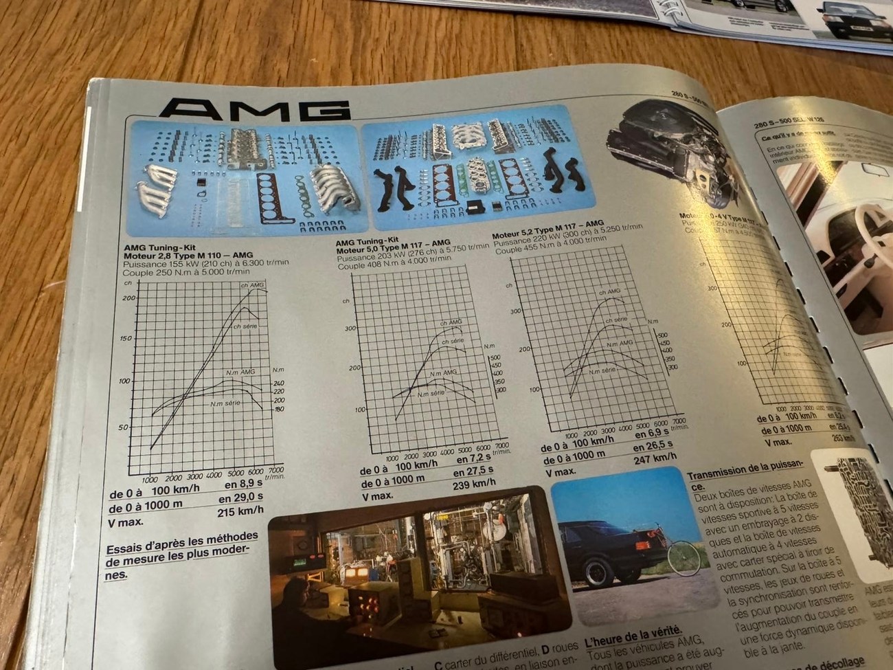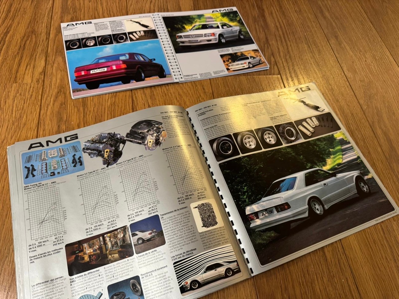 The brochures cover chassis such as the W/C126, W201, W/C124, R107, and W/C/S123 tuned by AMG. The seller has included photos of various pages including dyno results for AMG engine upgrades. These brochures feature accessories sold in period by AMG Germany such as appearance packages and parts, suspension upgrades, wheels, interior upgrades and technology, performance exhausts, and steering wheels. While the technical sheets are printed in German, the brocures are printed in French.