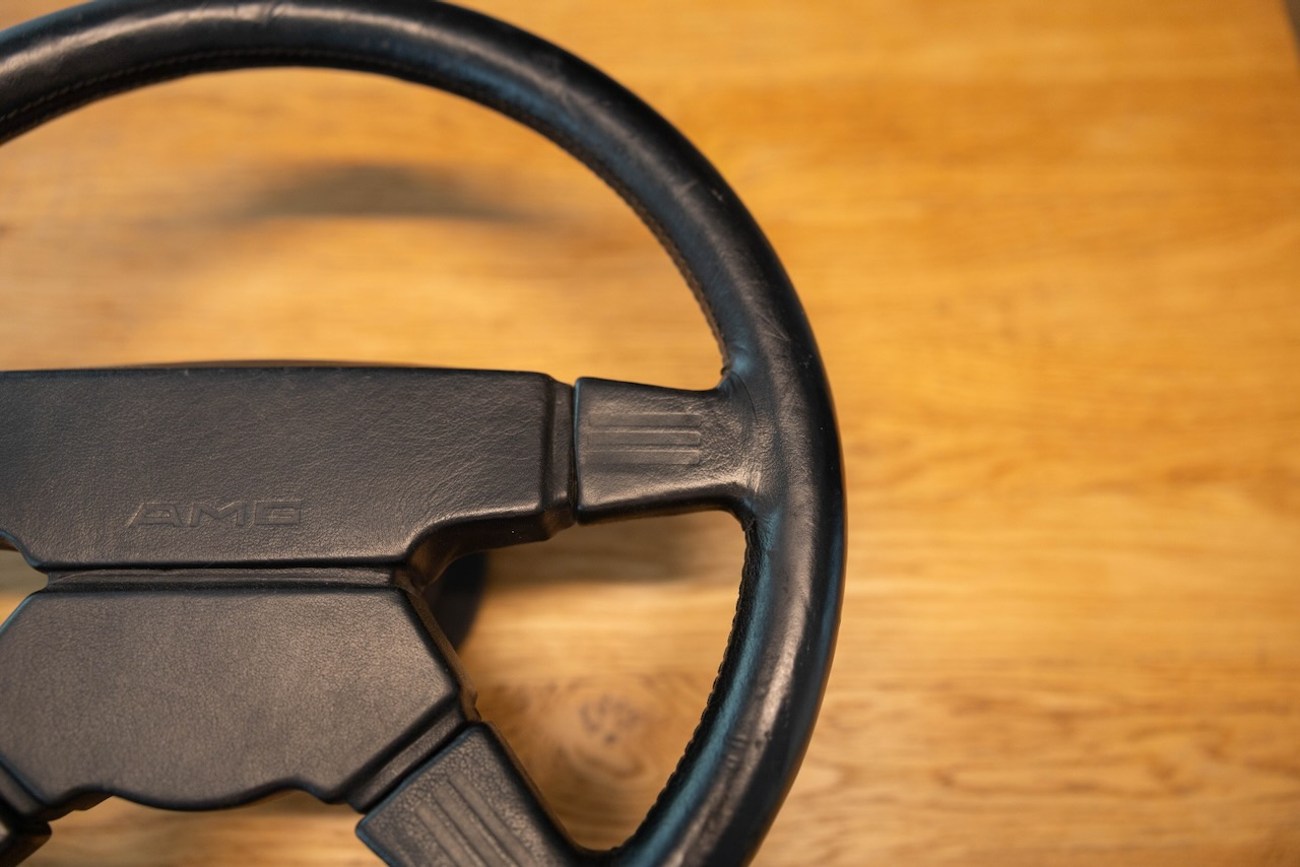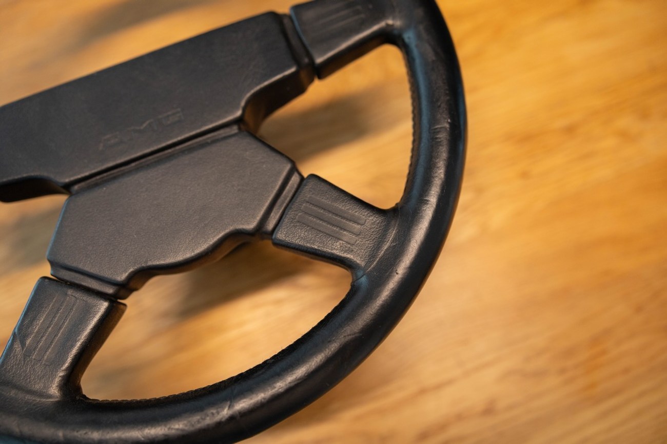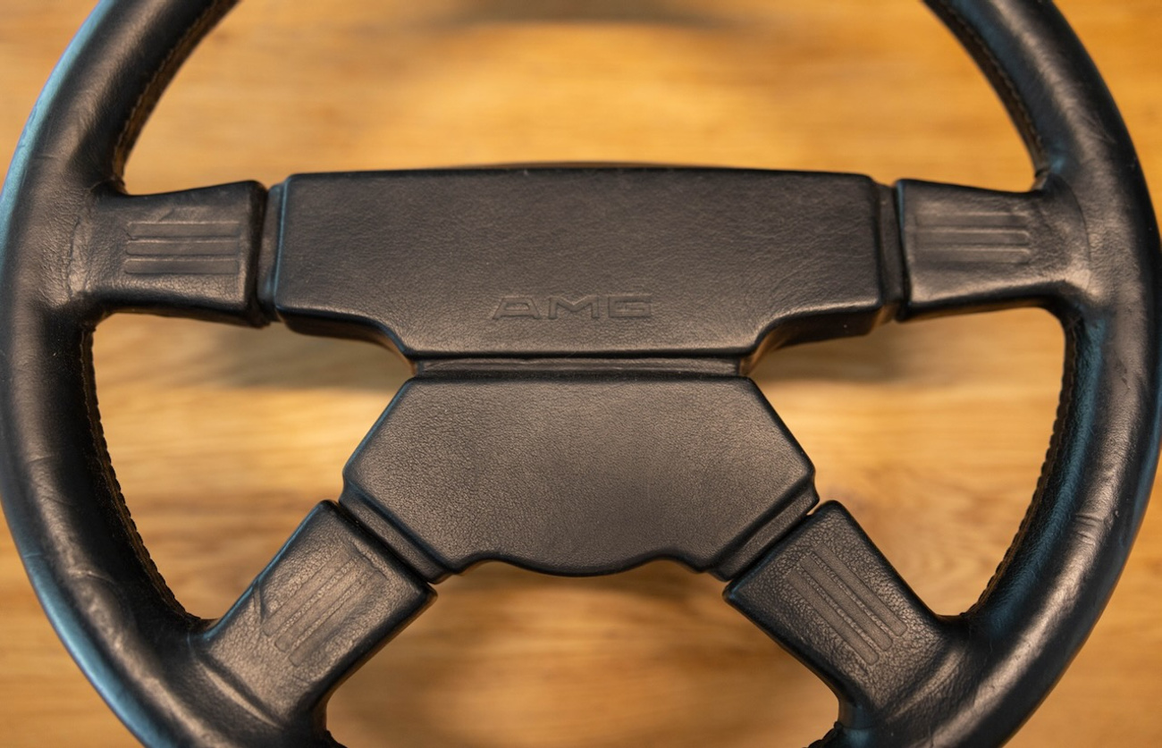 The seller reports the steering wheel and horn pad leather to be all original with the original premerger "AMG" script. Normal wear marks are present with detailed photos provided in the gallery. There are some dents in the leather at the twelve-o-clock potion photographed in the gallery.