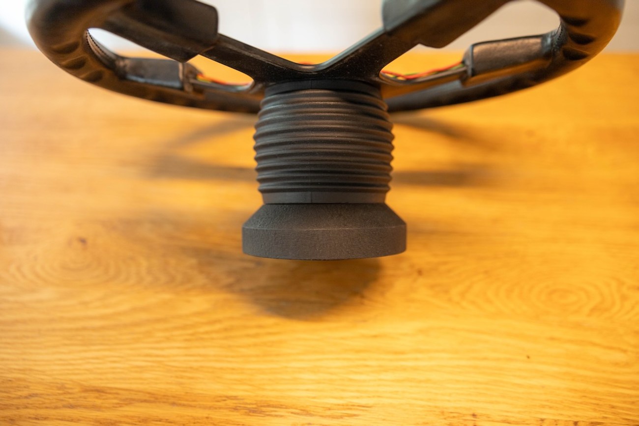 Photos of the back of the steering wheel are provided showing part number KBA 70056. The wiring is still present and holes for an adapter are centered around the opening. This wheel does not include the center 10mm allen bolt to attach to the steering column – though if removing a wheel on an existing car, the OEM bolt can be used to attach this M38 wheel to your car. No adjustments to wiring have to be made to make the horn work. This is a bolt-on application.