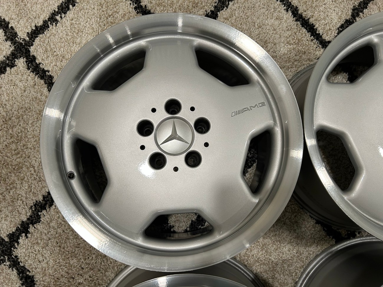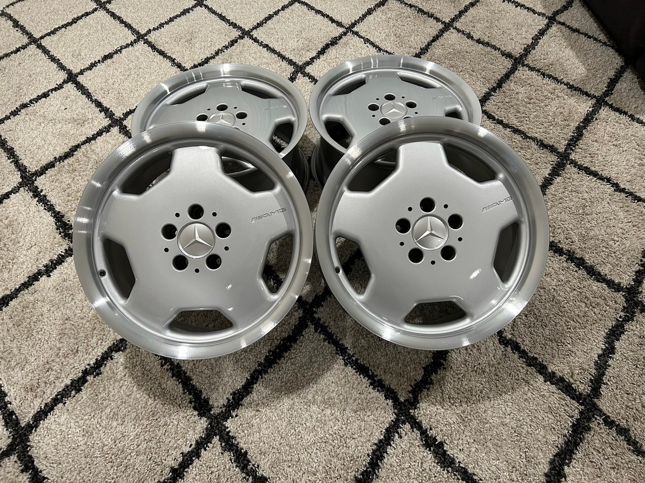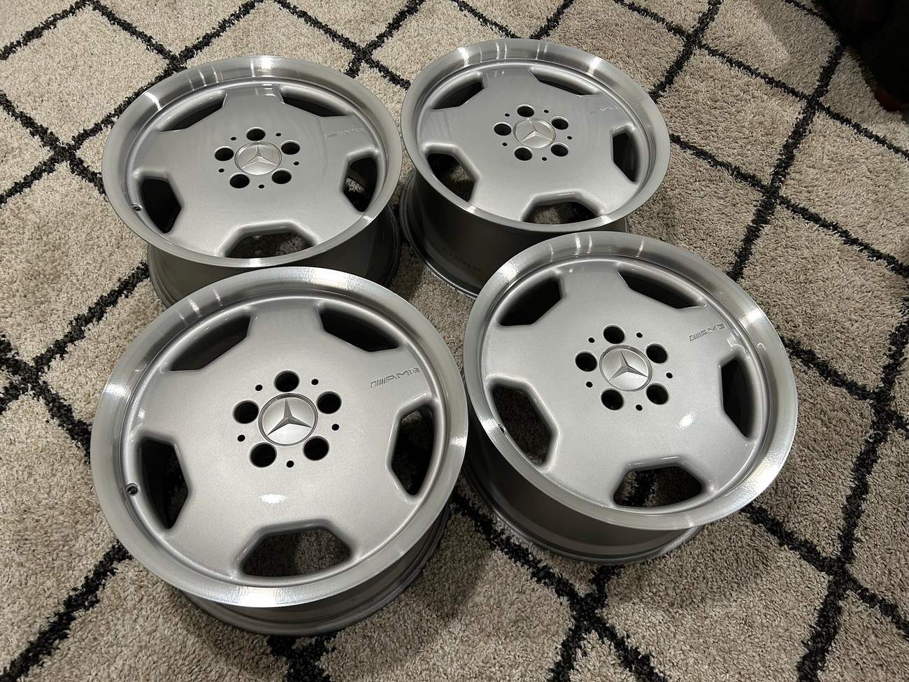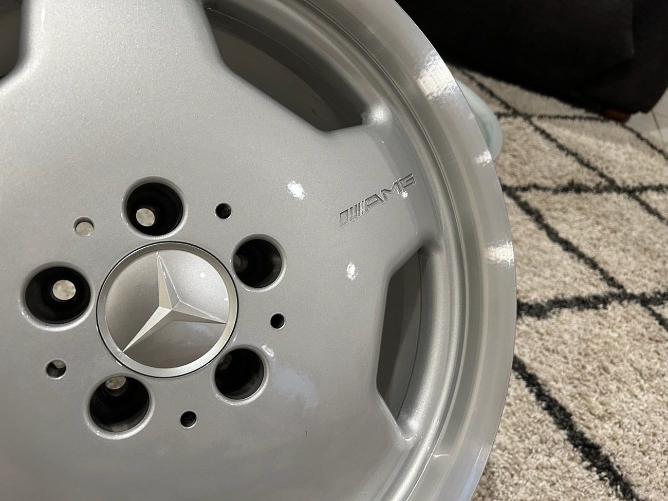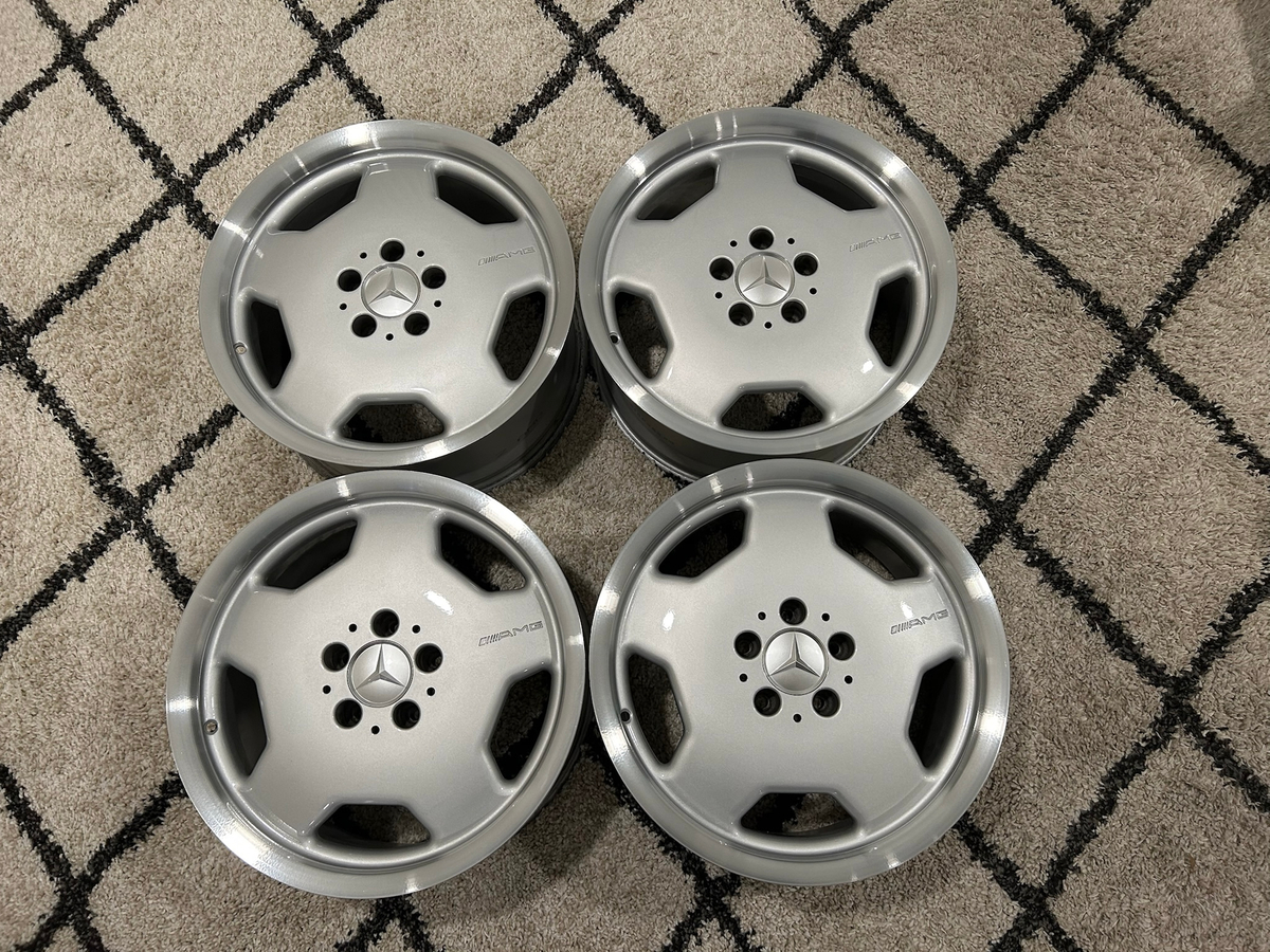 Hi everyone. I am pleased to present these 17” squared Aero II Monoblocks. These wheels are what was used in the rear for the staggered setup on the W202 C43 Amg. This is an interesting setup in terms of fitment because it now becomes the perfect match for several different models. These Monoblocks are a direct fit for the W208, W209, W211, and W124. This set can also go on the W201, W202, W203, W210, R170, and R171. For all the 500E owners out there looking to do a 17” Aero II Monoblock look, this is the best setup for that. The offset of 30 makes the wheels fit perfectly for the wide wheel arch. I am here to answer any questions and happy bidding.