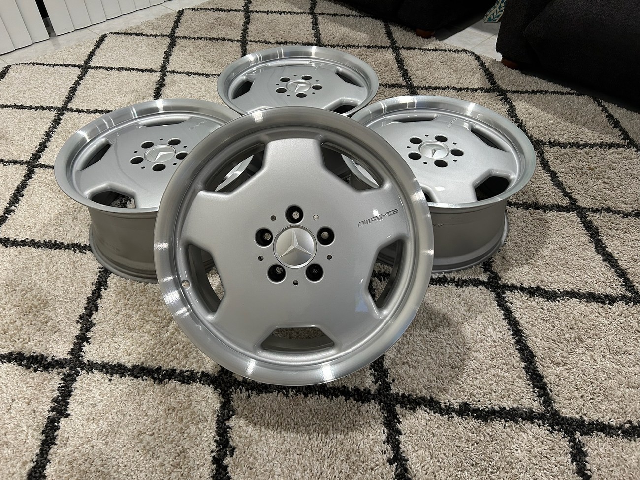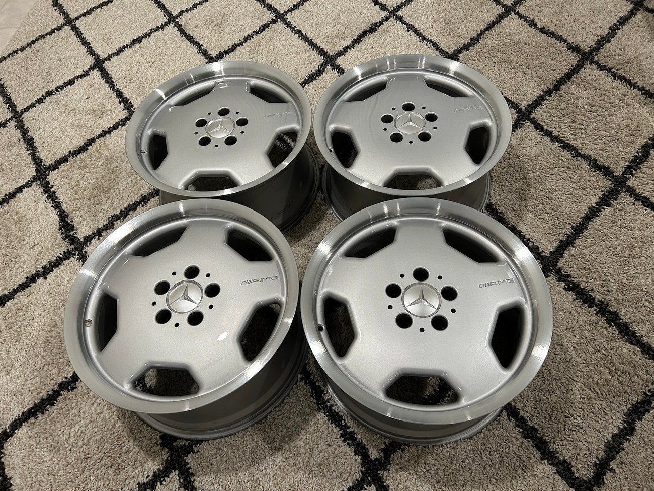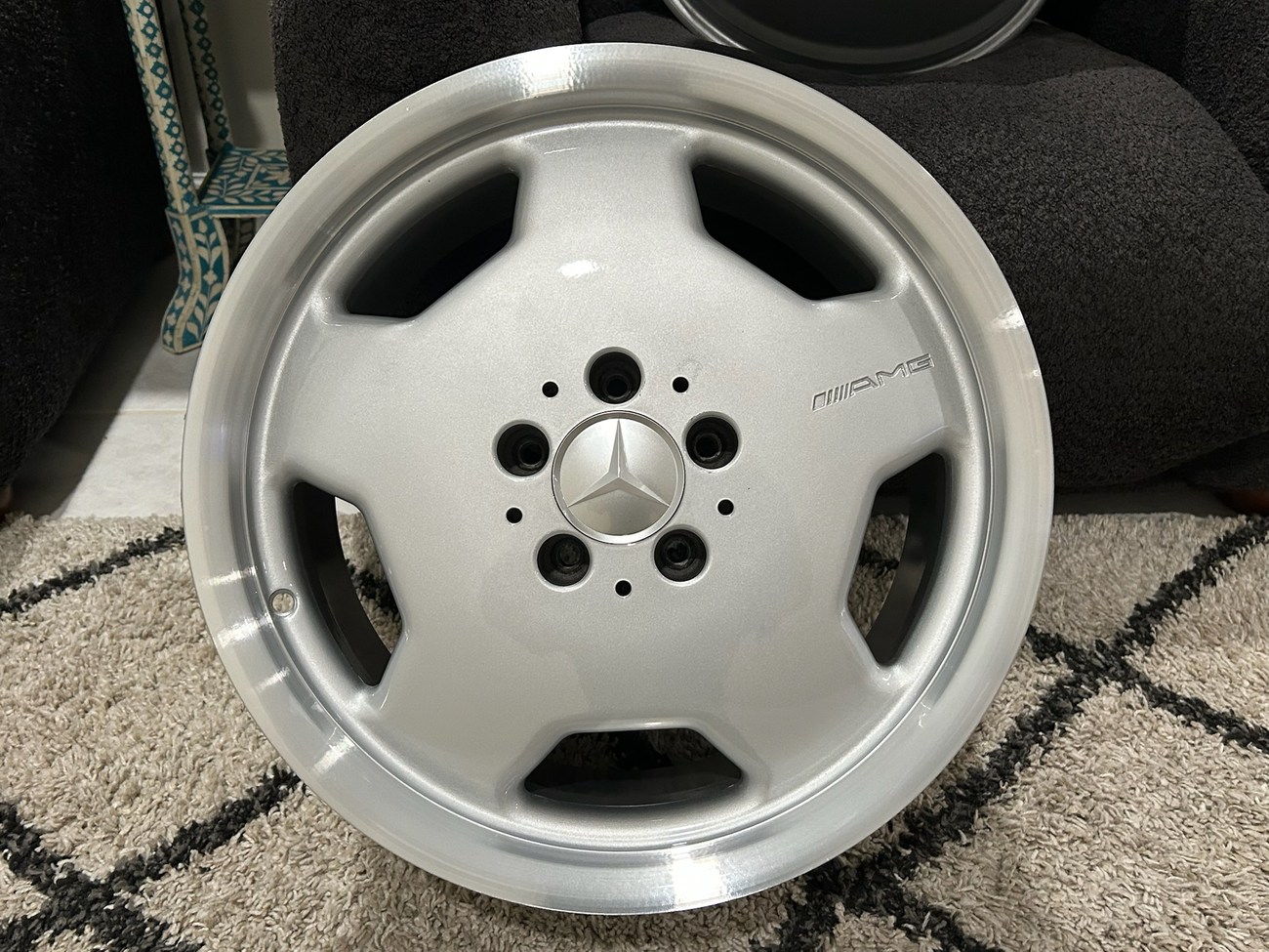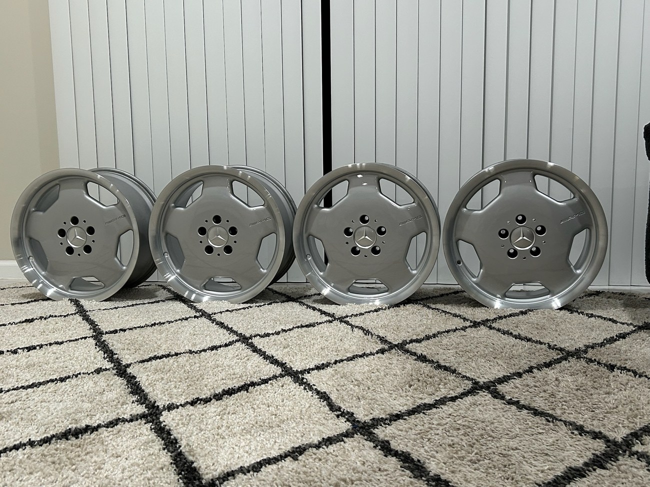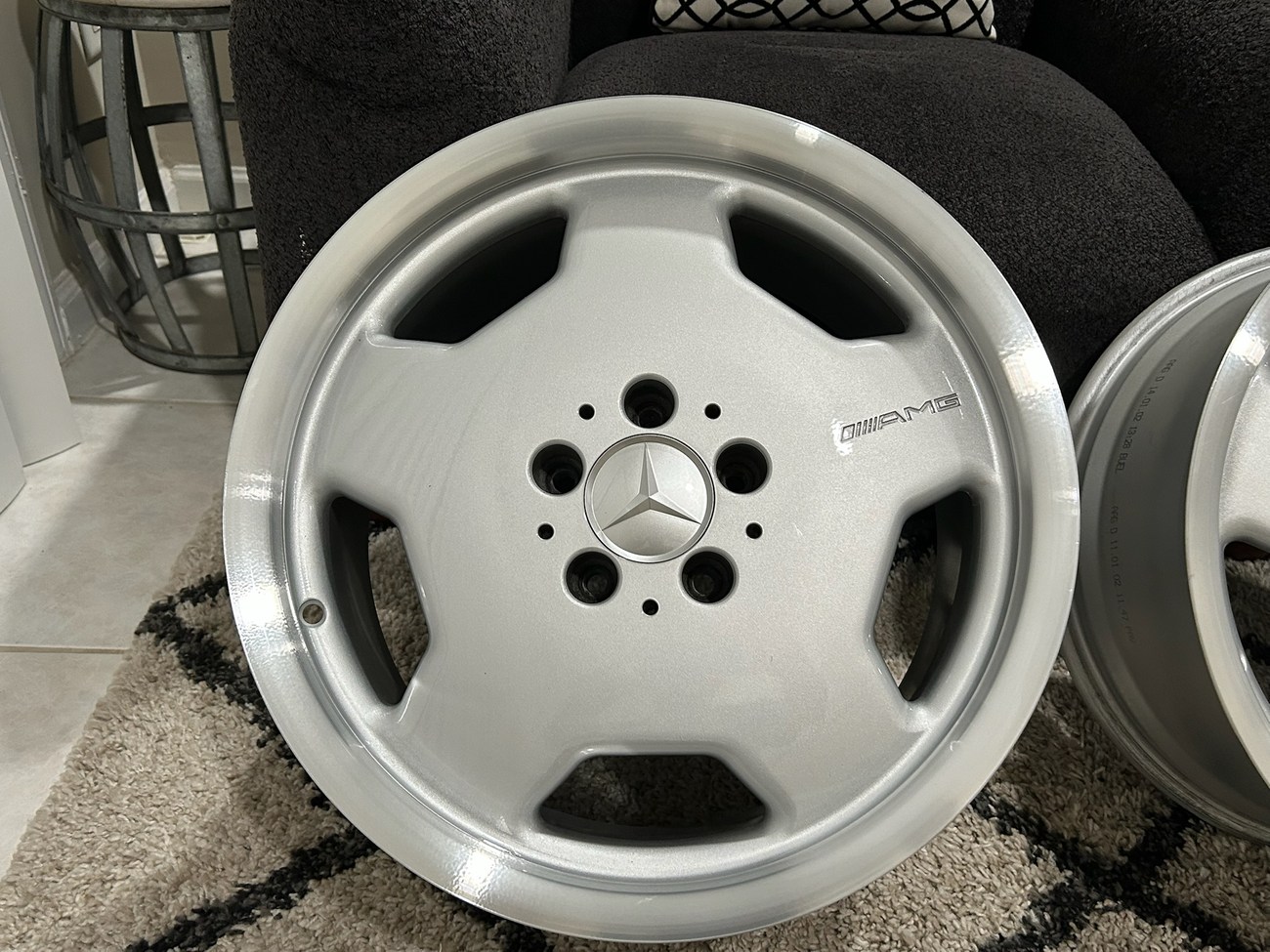 Hi everyone. I am pleased to present these 17” squared Aero II Monoblocks. These wheels are what was used in the rear for the staggered setup on the W202 C43 Amg. This is an interesting setup in terms of fitment because it now becomes the perfect match for several different models. These Monoblocks are a direct fit for the W208, W209, W211, and W124. This set can also go on the W201, W202, W203, W210, R170, and R171. For all the 500E owners out there looking to do a 17” Aero II Monoblock look, this is the best setup for that. The offset of 30 makes the wheels fit perfectly for the wide wheel arch. I am here to answer any questions and happy bidding.