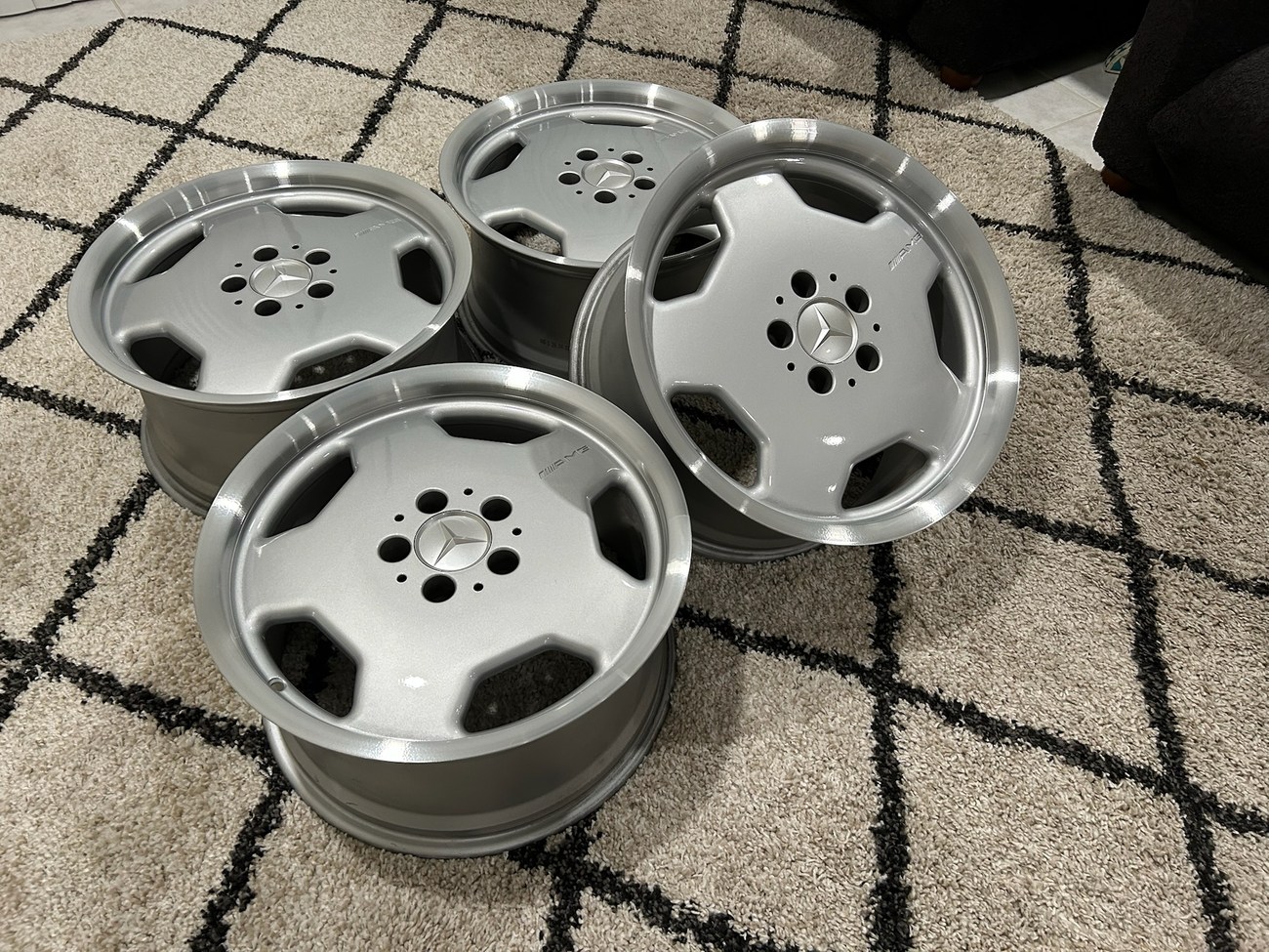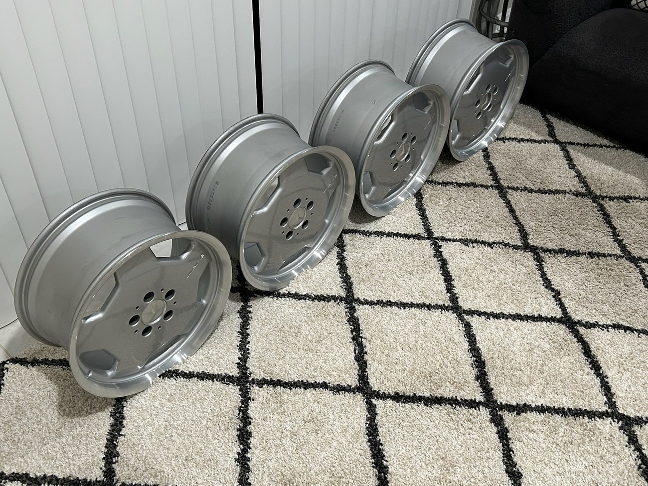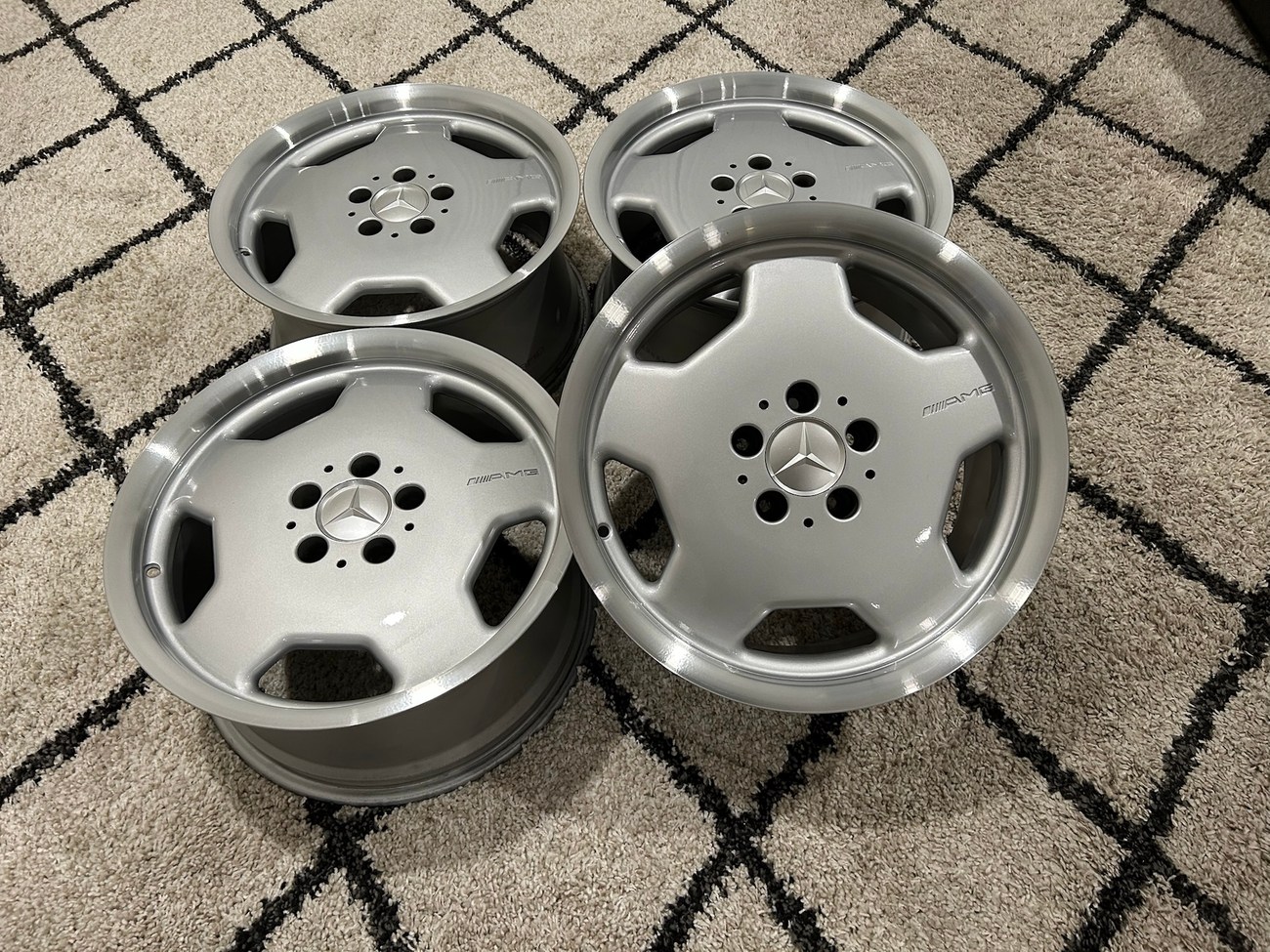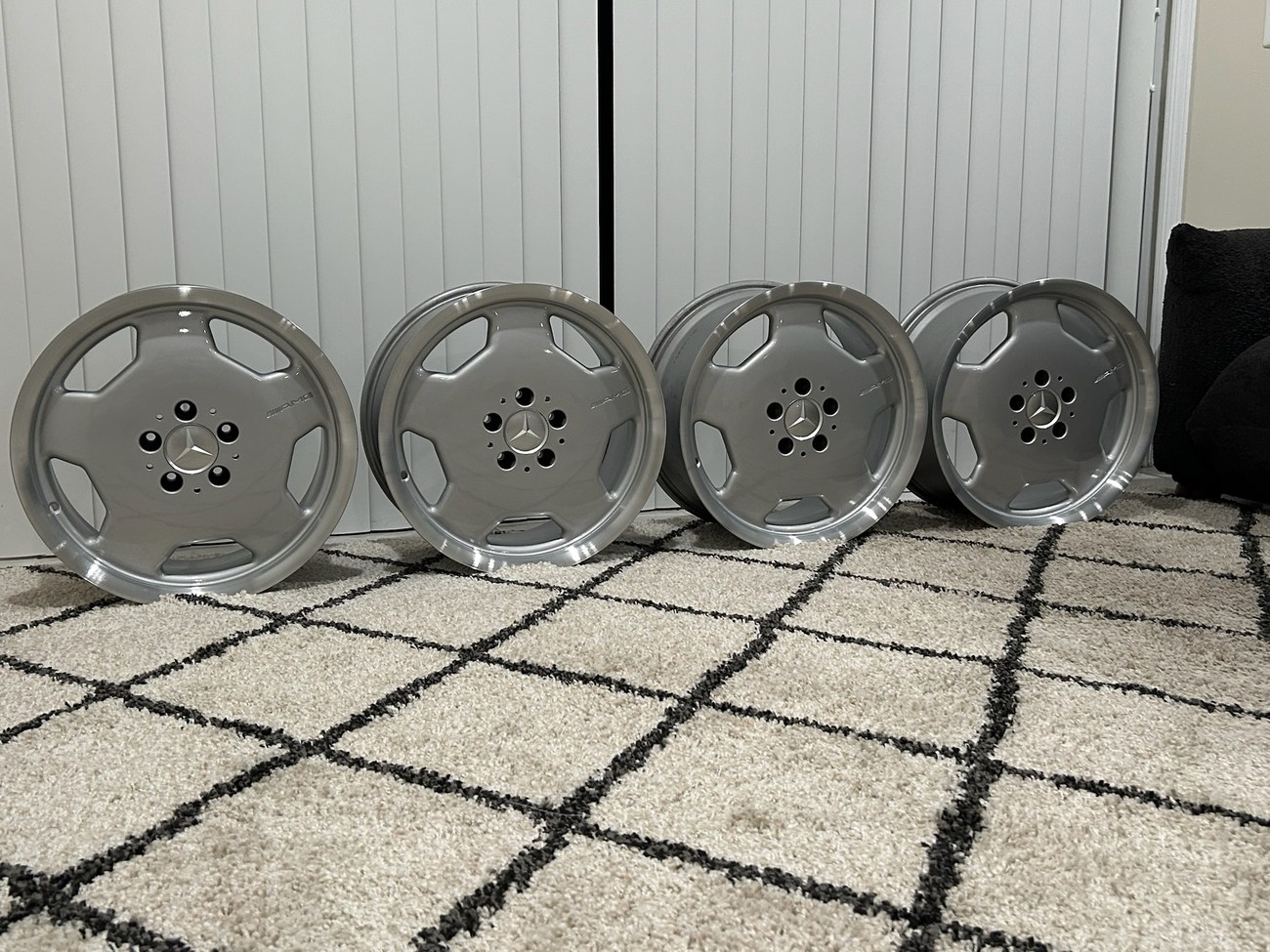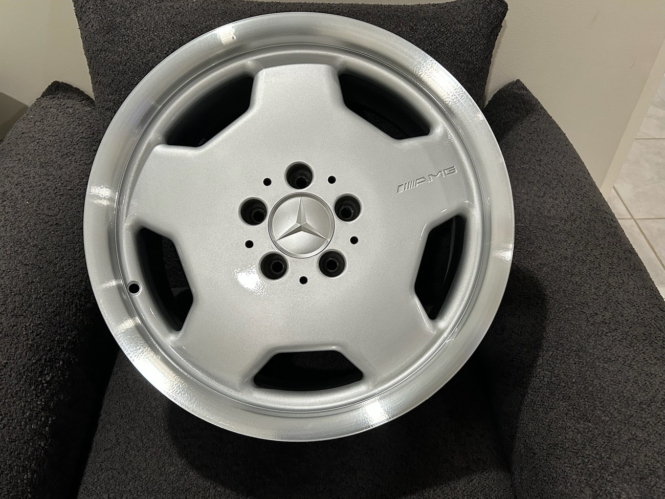 Hi everyone. I am pleased to present these 17” squared Aero II Monoblocks. These wheels are what was used in the rear for the staggered setup on the W202 C43 Amg. This is an interesting setup in terms of fitment because it now becomes the perfect match for several different models. These Monoblocks are a direct fit for the W208, W209, W211, and W124. This set can also go on the W201, W202, W203, W210, R170, and R171. For all the 500E owners out there looking to do a 17” Aero II Monoblock look, this is the best setup for that. The offset of 30 makes the wheels fit perfectly for the wide wheel arch. I am here to answer any questions and happy bidding.