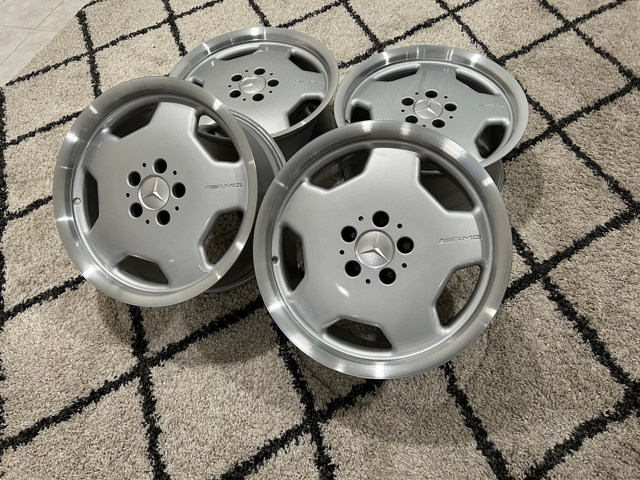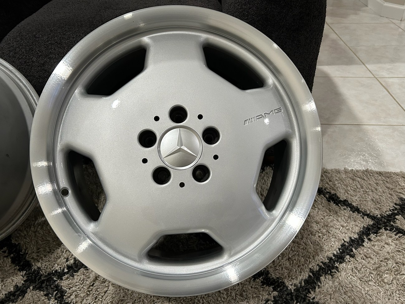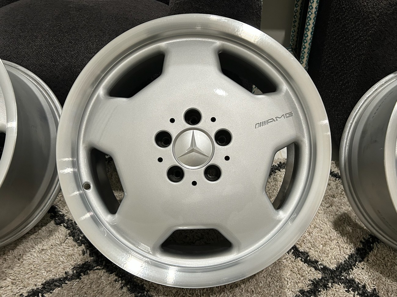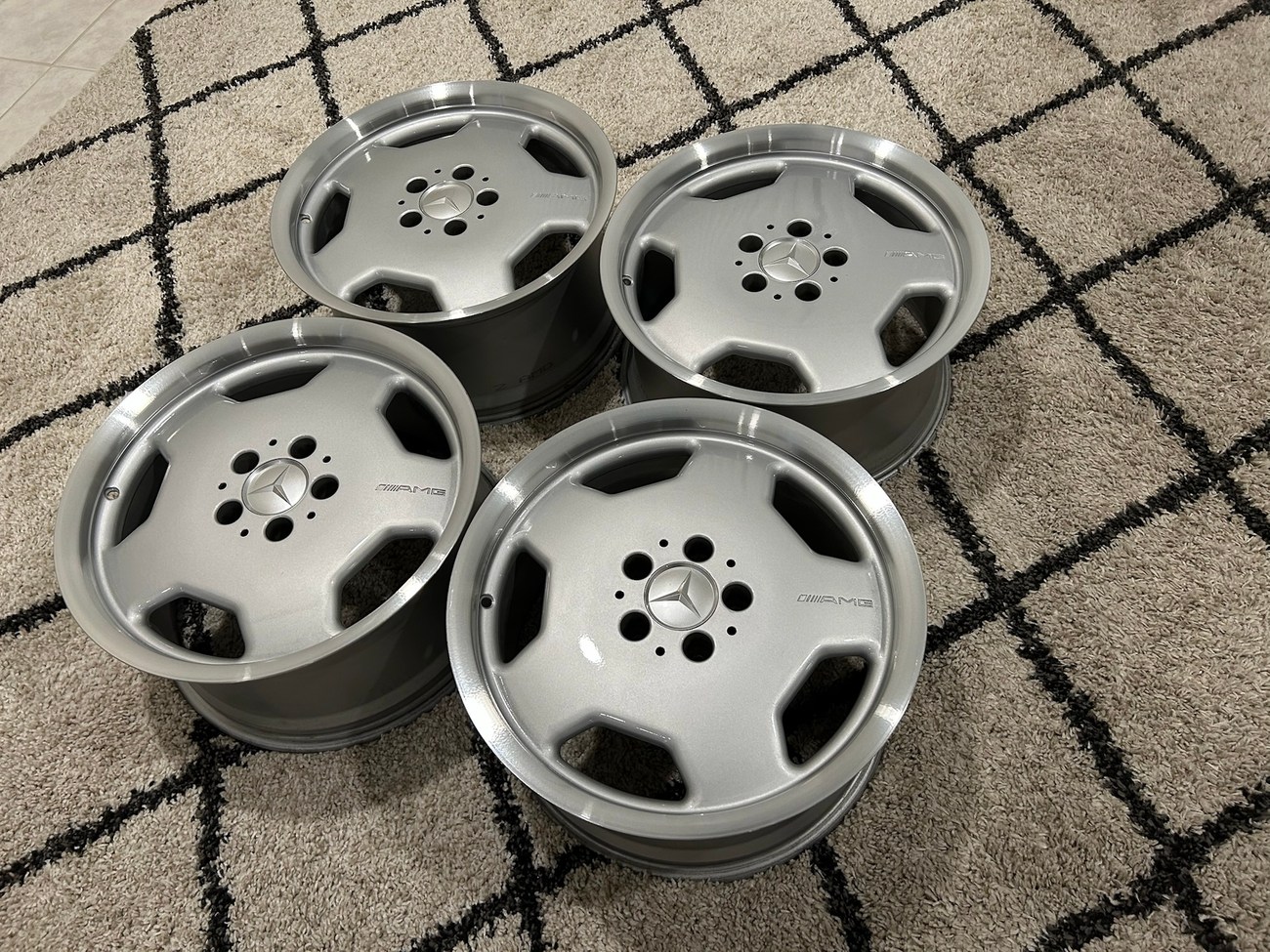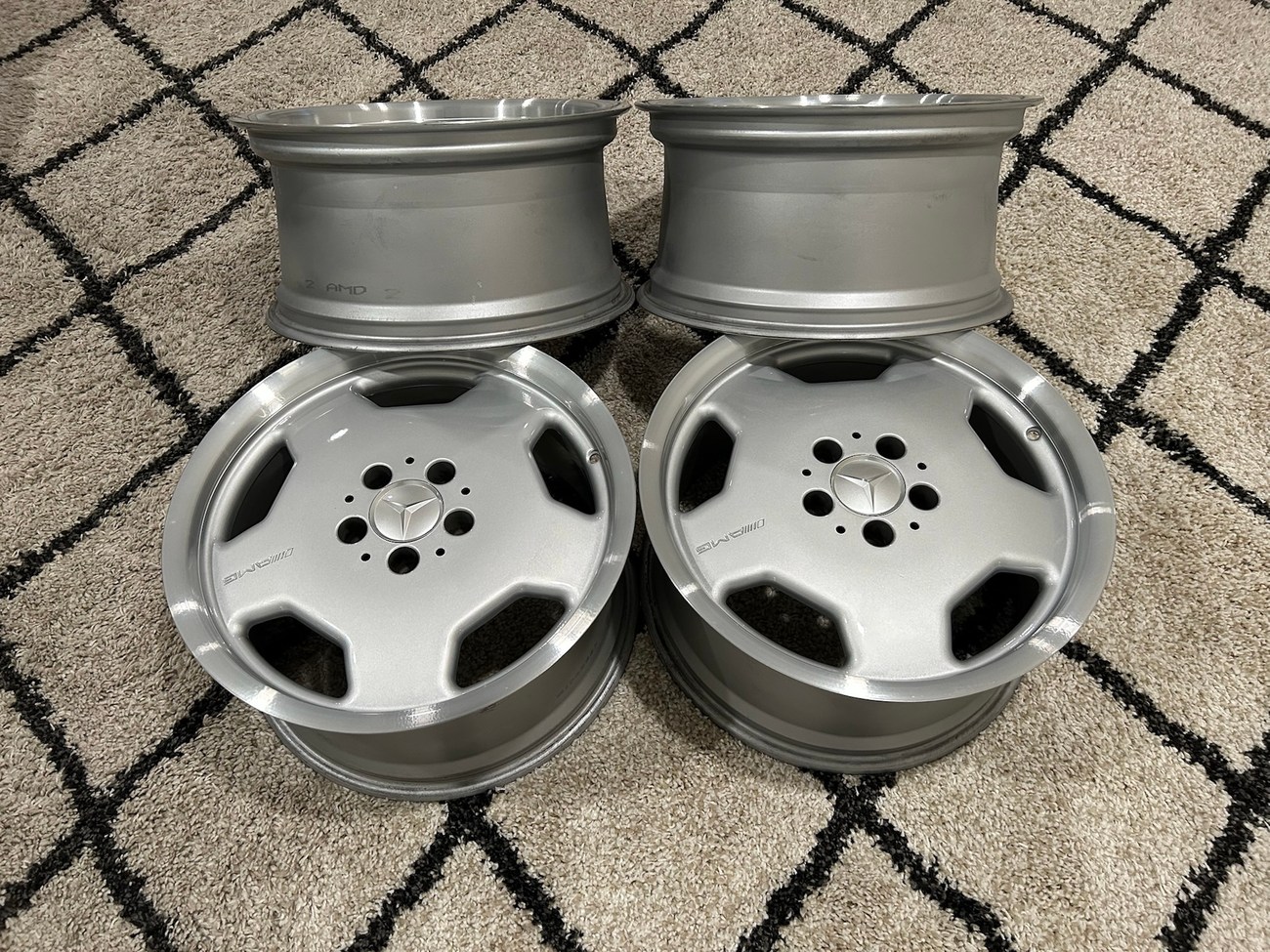 Hi everyone. I am pleased to present these 17” squared Aero II Monoblocks. These wheels are what was used in the rear for the staggered setup on the W202 C43 Amg. This is an interesting setup in terms of fitment because it now becomes the perfect match for several different models. These Monoblocks are a direct fit for the W208, W209, W211, and W124. This set can also go on the W201, W202, W203, W210, R170, and R171. For all the 500E owners out there looking to do a 17” Aero II Monoblock look, this is the best setup for that. The offset of 30 makes the wheels fit perfectly for the wide wheel arch. I am here to answer any questions and happy bidding.