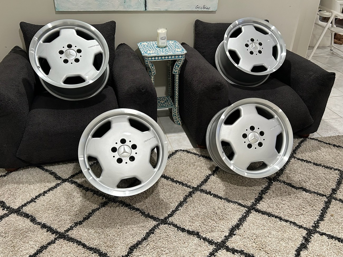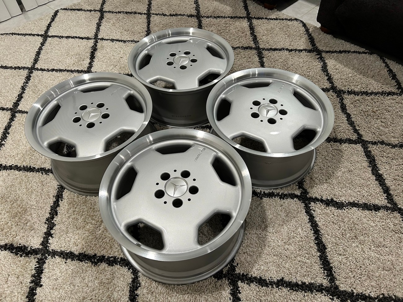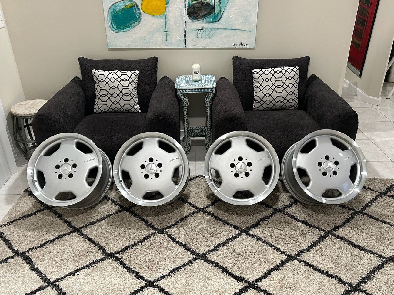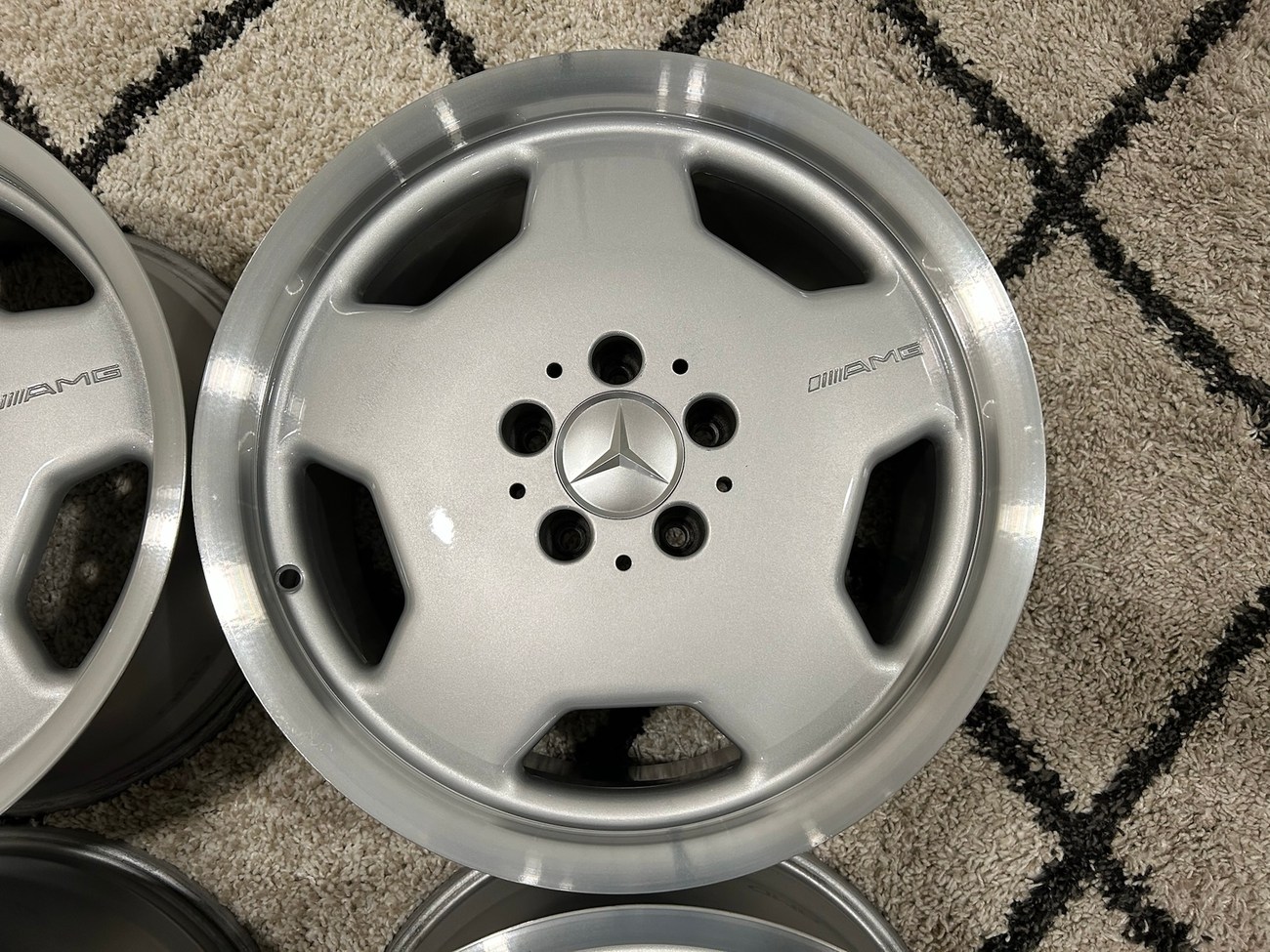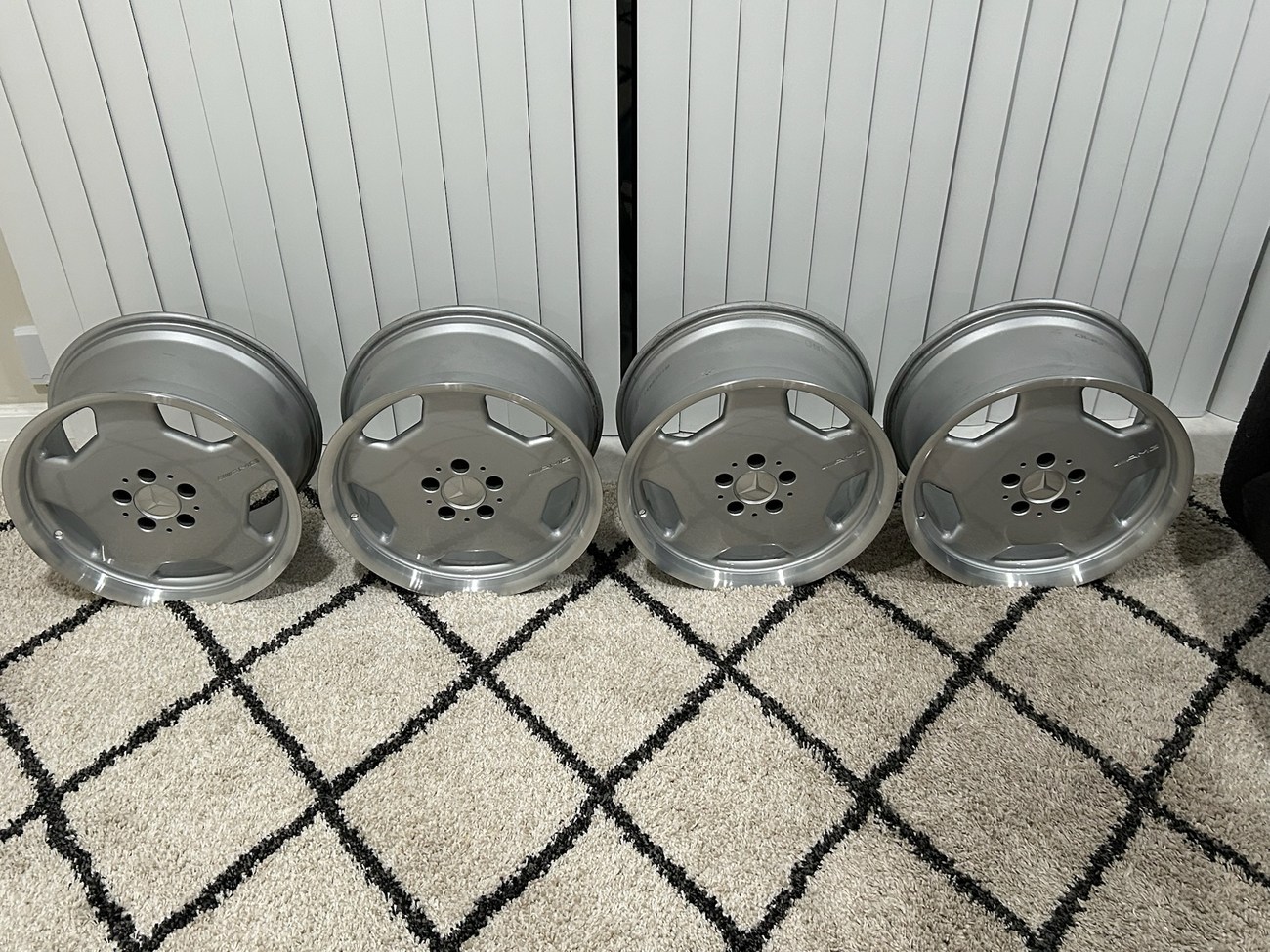 Hi everyone. I am pleased to present these 17” squared Aero II Monoblocks. These wheels are what was used in the rear for the staggered setup on the W202 C43 Amg. This is an interesting setup in terms of fitment because it now becomes the perfect match for several different models. These Monoblocks are a direct fit for the W208, W209, W211, and W124. This set can also go on the W201, W202, W203, W210, R170, and R171. For all the 500E owners out there looking to do a 17” Aero II Monoblock look, this is the best setup for that. The offset of 30 makes the wheels fit perfectly for the wide wheel arch. I am here to answer any questions and happy bidding.