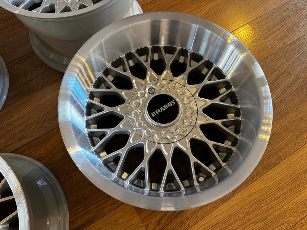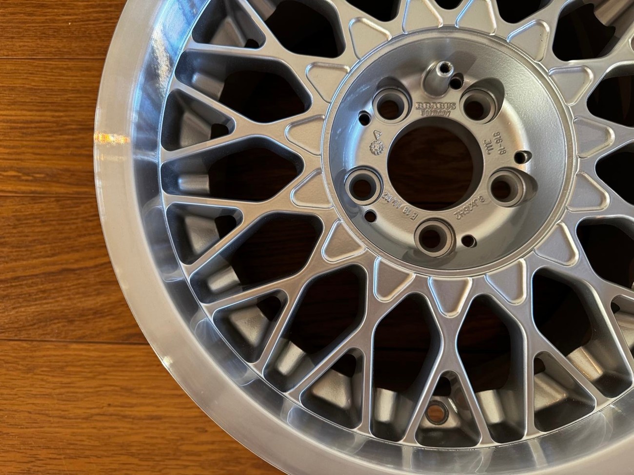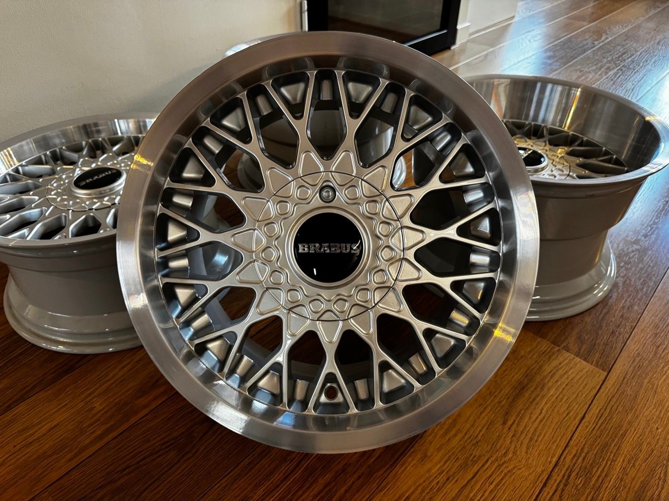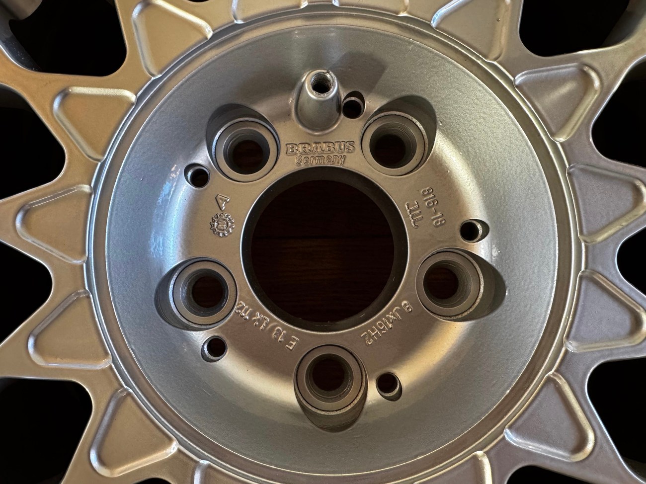 These authentic BRABUS wheels were offered as an optional upgrade on various classic Mercedes-Benz models including the W126 and C126. The faces and center caps are finished in silver with a machined lips. Up close photos of each face are provided in the gallery and no major imperfections are noted.