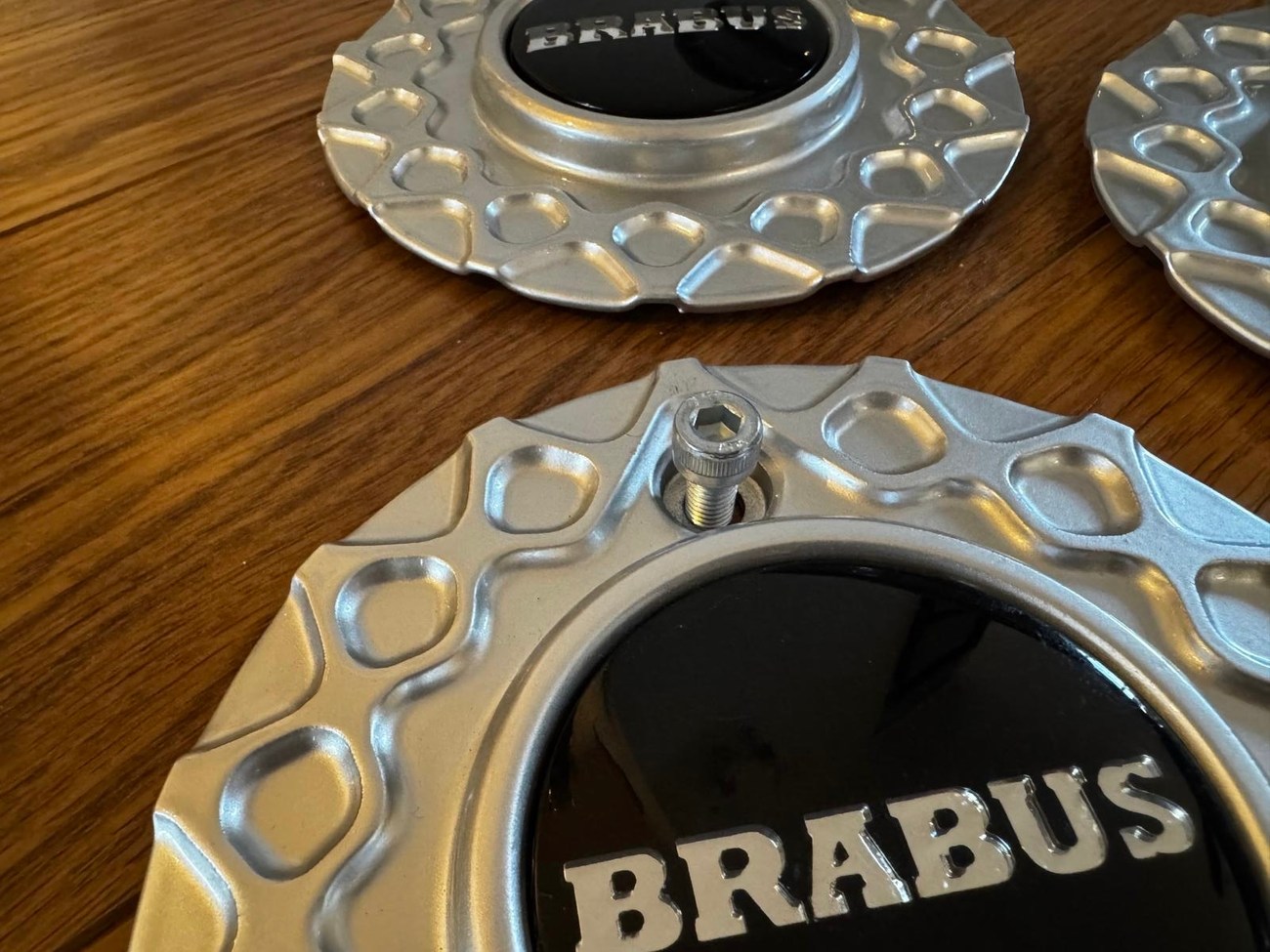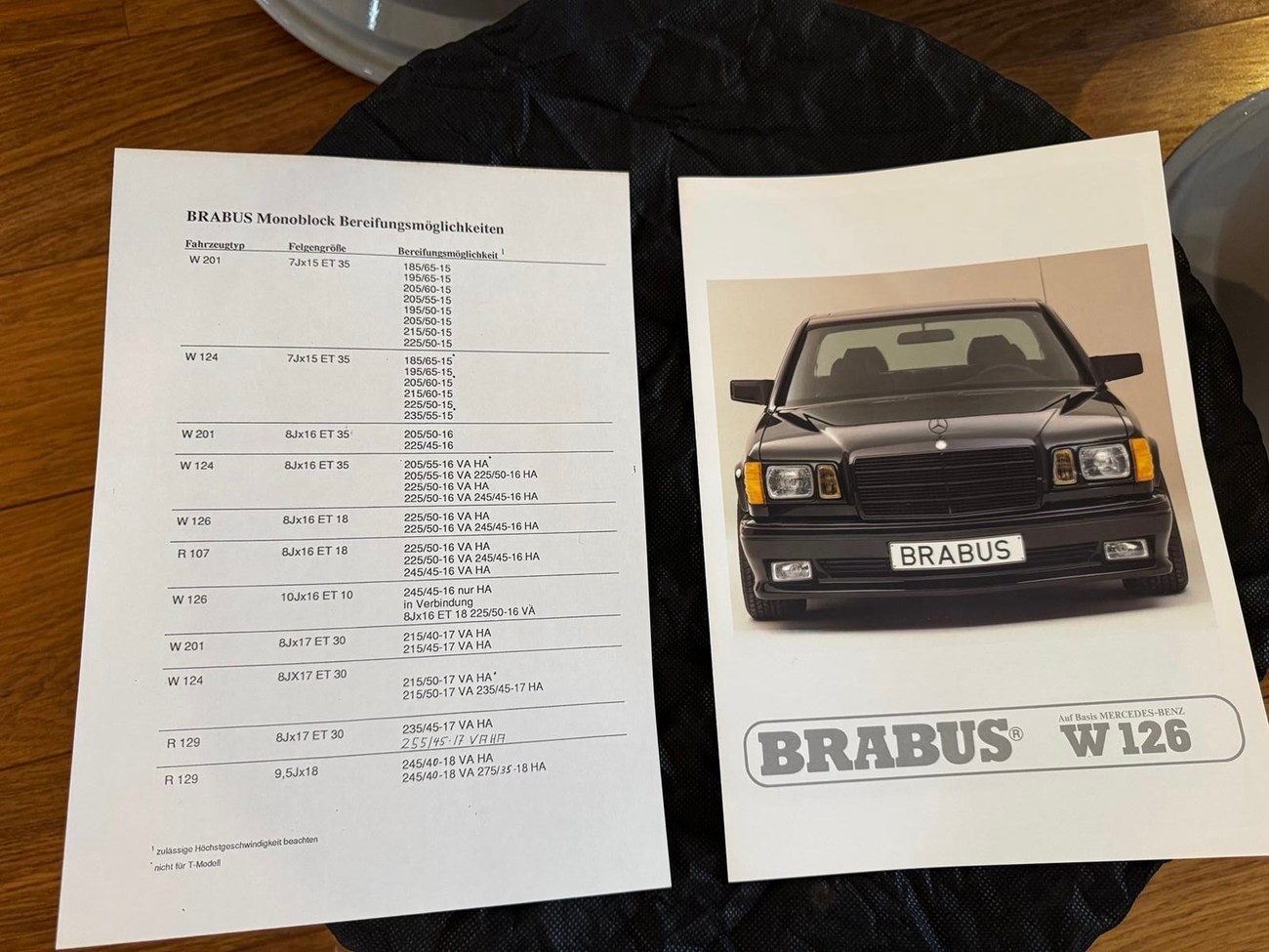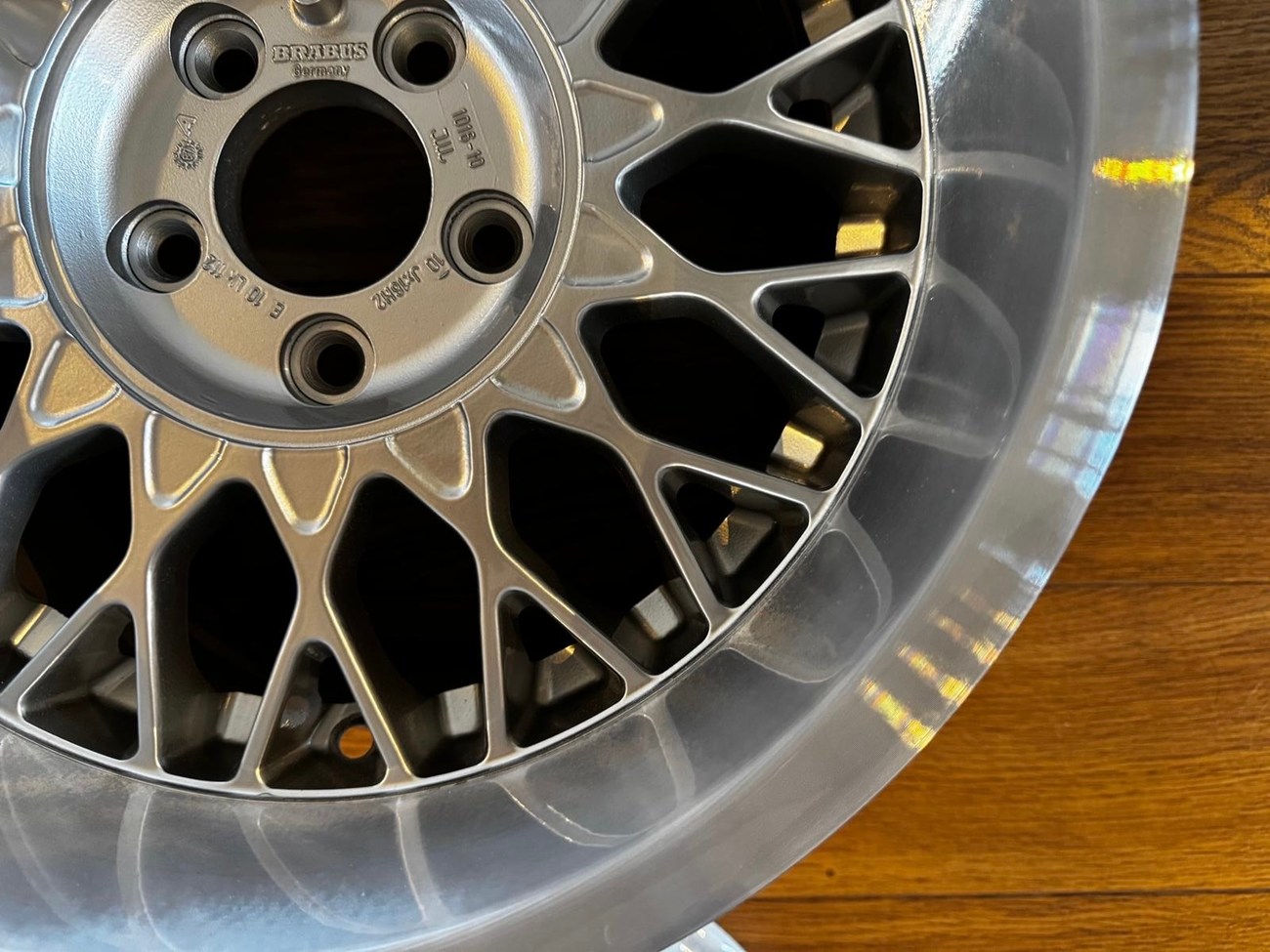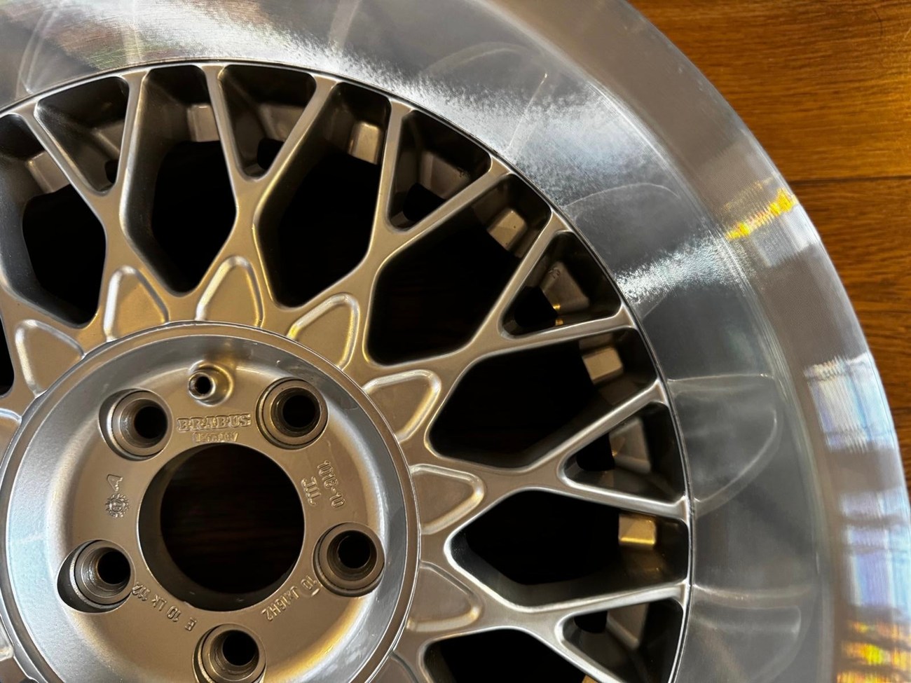 These authentic BRABUS wheels were offered as an optional upgrade on various classic Mercedes-Benz models including the W126 and C126. The faces and center caps are finished in silver with a machined lips. Up close photos of each face are provided in the gallery and no major imperfections are noted.