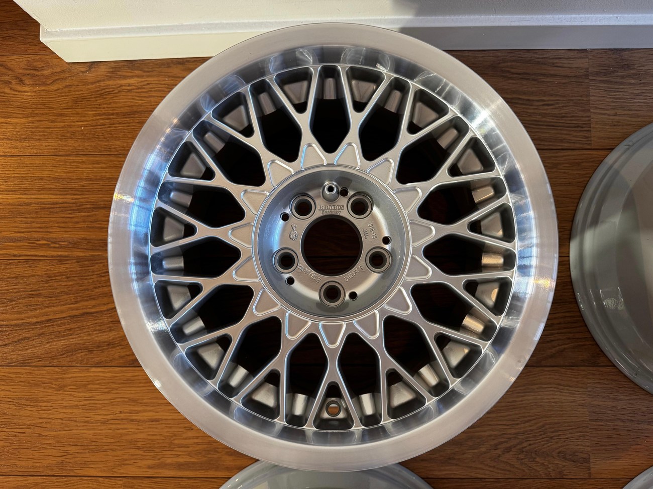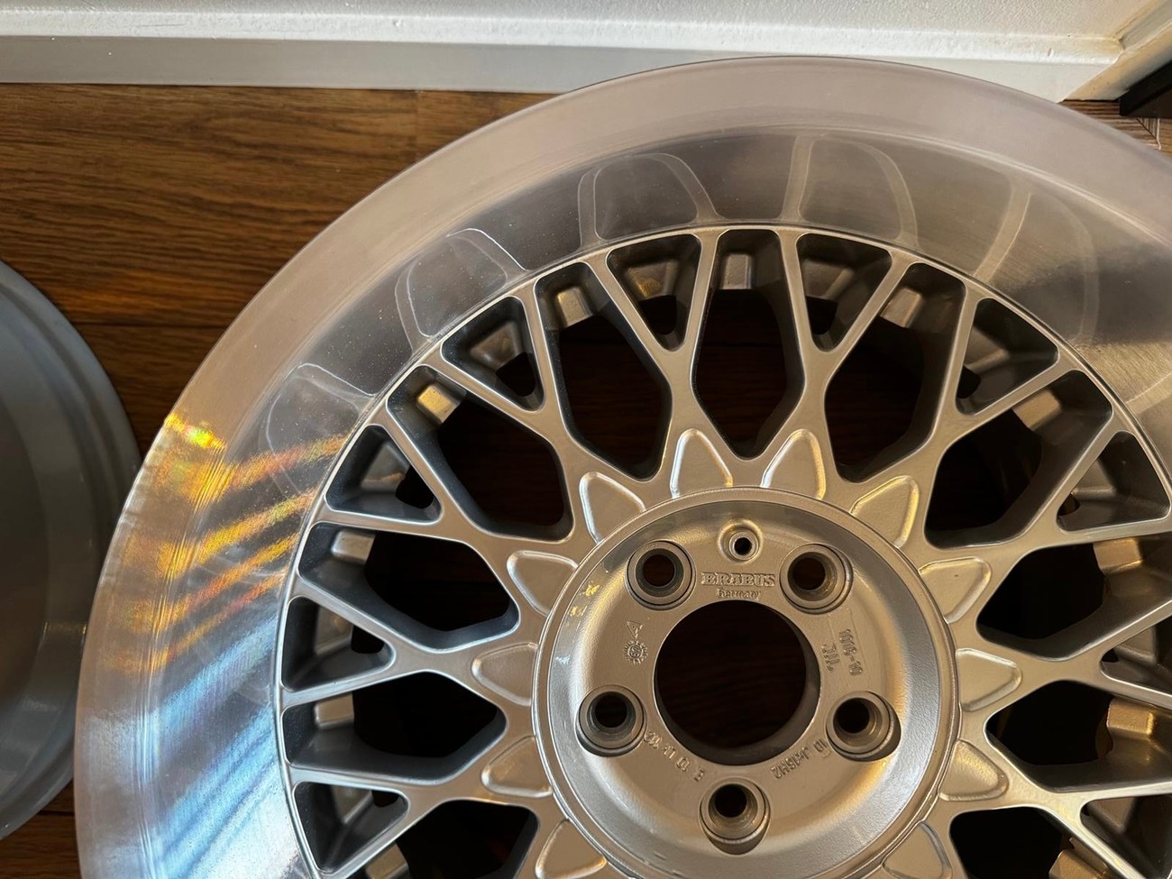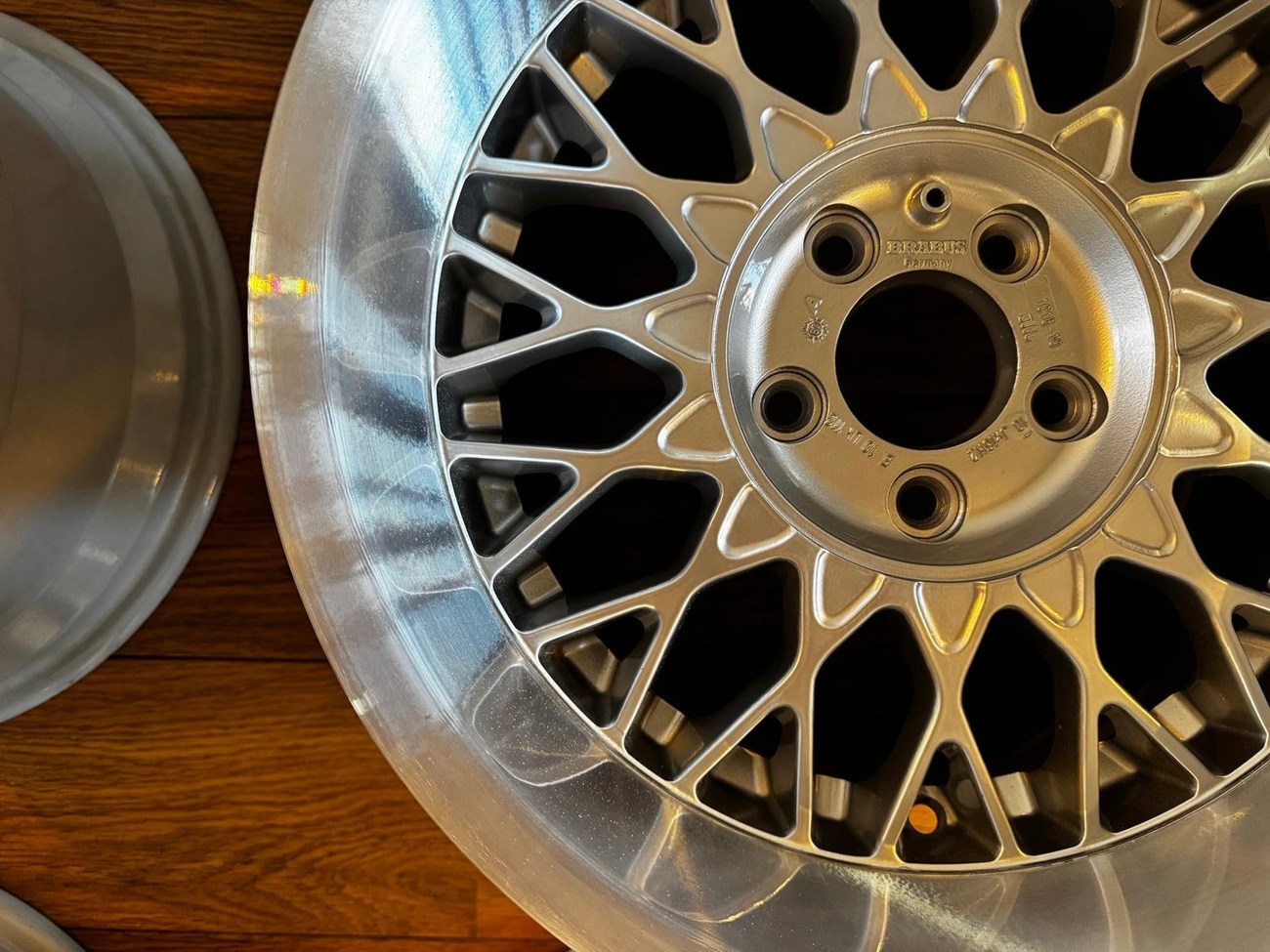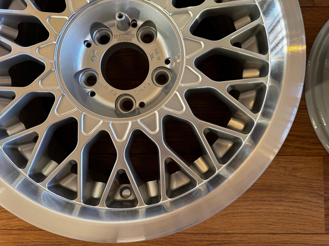 These authentic BRABUS wheels were offered as an optional upgrade on various classic Mercedes-Benz models including the W126 and C126. The faces and center caps are finished in silver with a machined lips. Up close photos of each face are provided in the gallery and no major imperfections are noted.