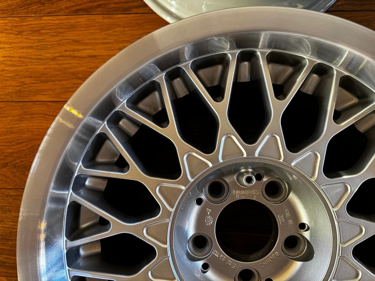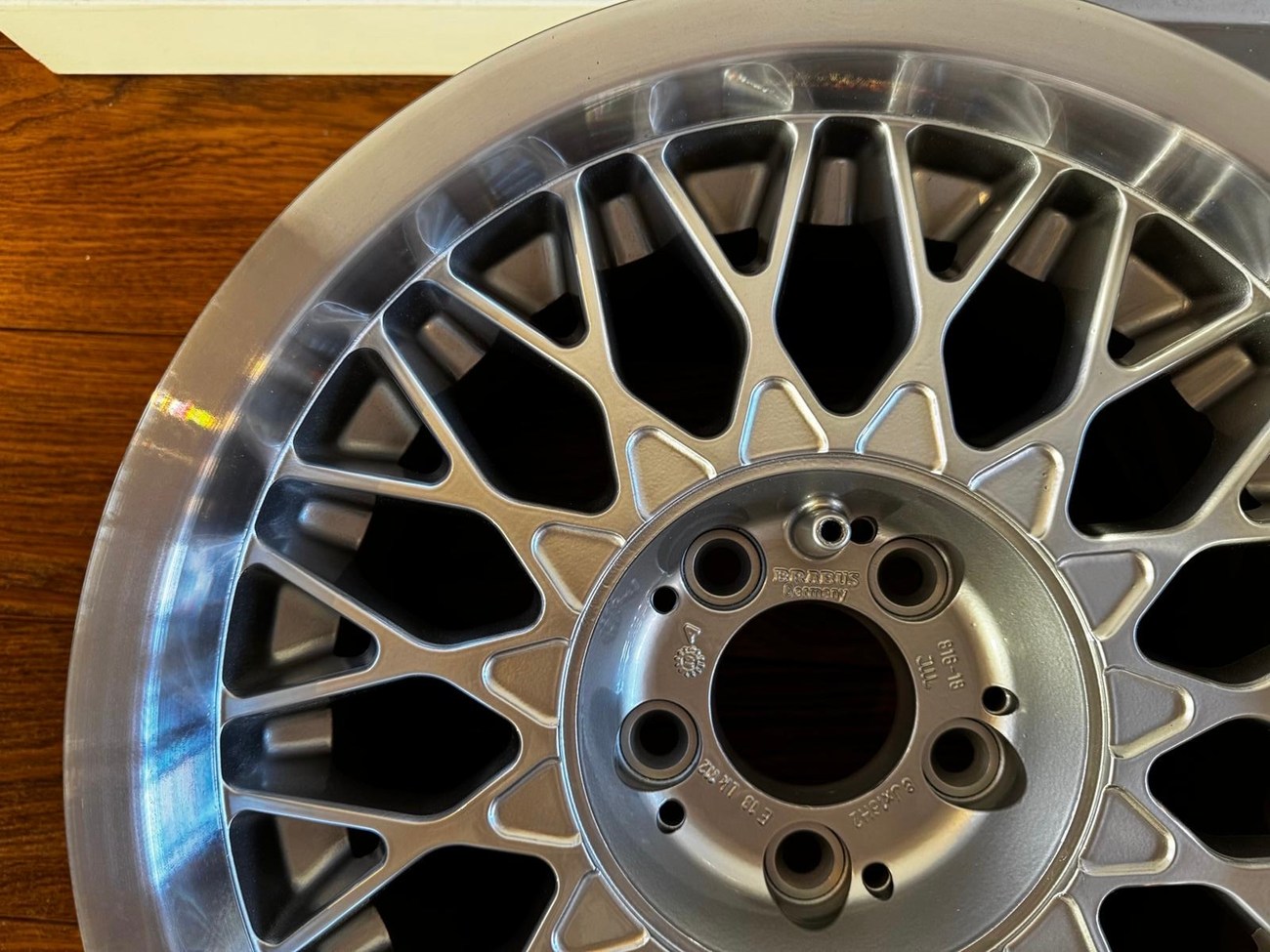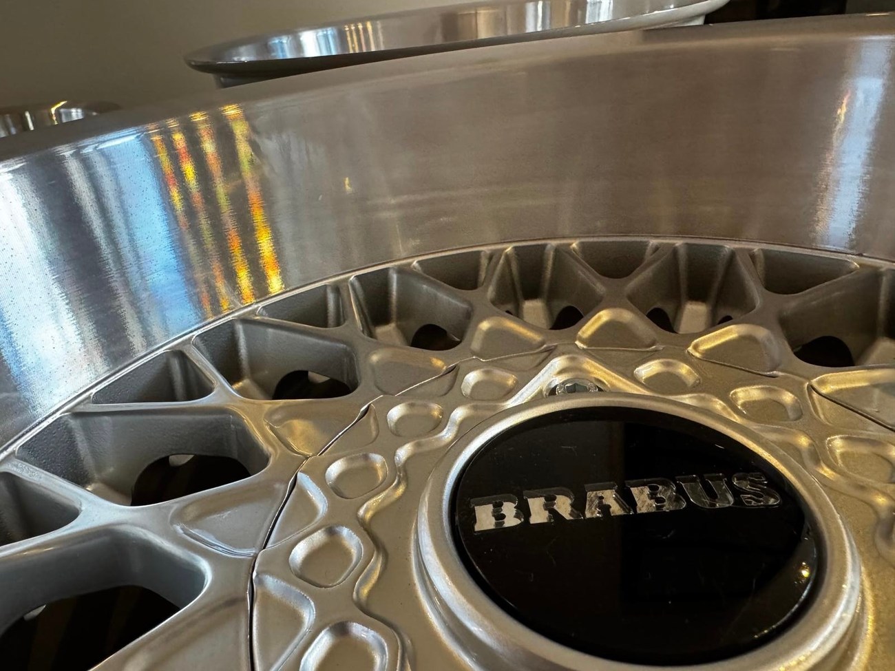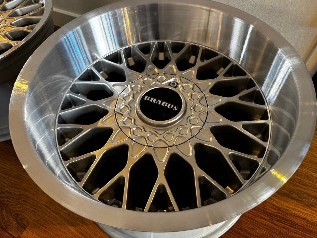 These staggered 16″ BRABUS Monoblock I mesh wheels measure 8″ wide up front and 10" wide in the rear and were manufactured in Germany for use on BRABUS modified Mercedes-Benz vehicles. The faces are finished in silver and a machined lip. Dimensions, offsets, and other manufacturer casting marks are present on each wheel. The wheels have been professionally refinished and the original BRABUS center caps are included. These rare BRABUS wheels are now offered by the seller in Amsterdam, Netherlands.