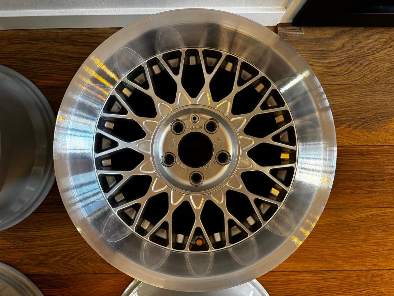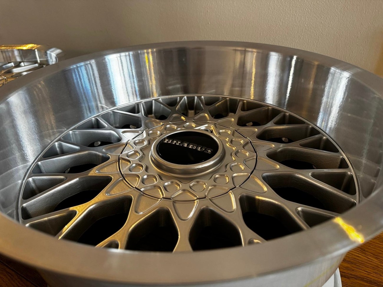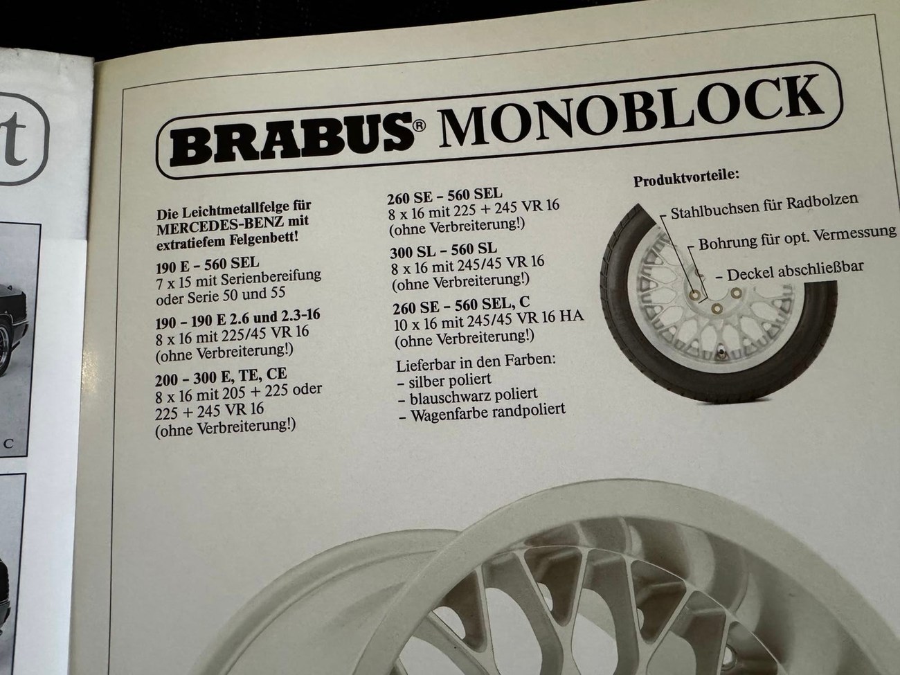 These staggered 16″ BRABUS Monoblock I mesh wheels measure 8″ wide up front and 10" wide in the rear and were manufactured in Germany for use on BRABUS modified Mercedes-Benz vehicles. The faces are finished in silver and a machined lip. Dimensions, offsets, and other manufacturer casting marks are present on each wheel. The wheels have been professionally refinished and the original BRABUS center caps are included. These rare BRABUS wheels are now offered by the seller in Amsterdam, Netherlands.
