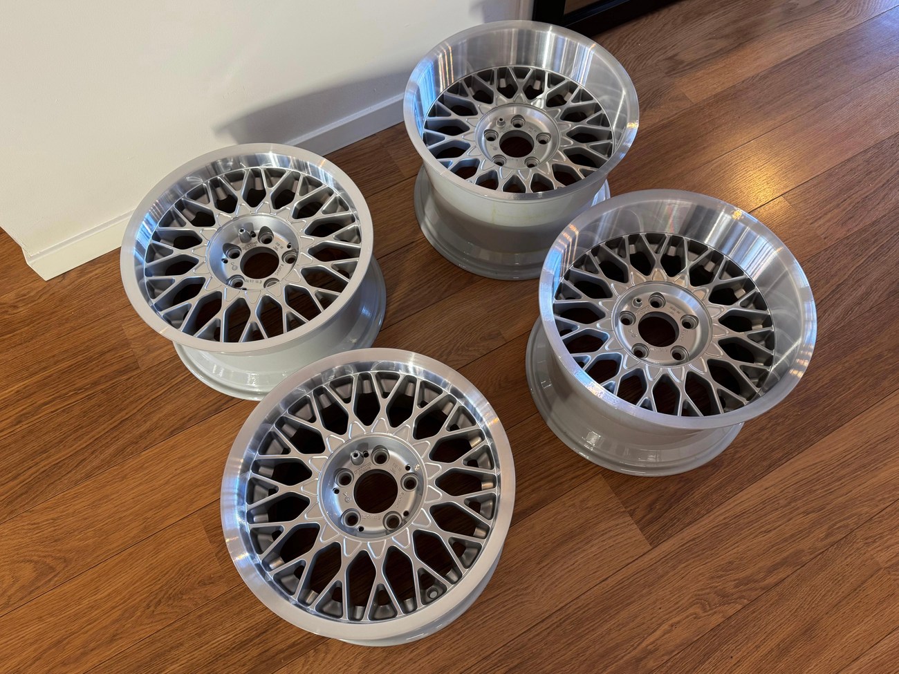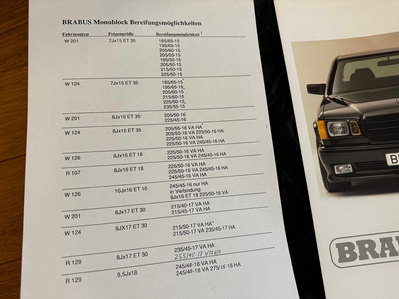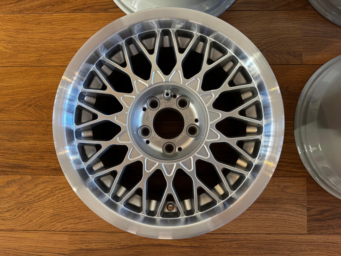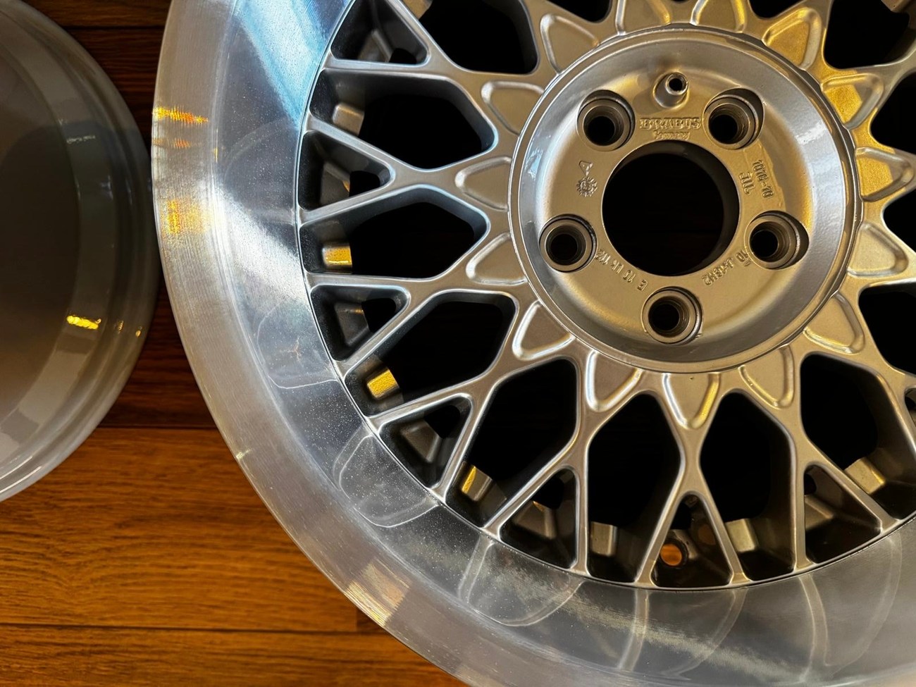 These staggered 16″ BRABUS Monoblock I mesh wheels measure 8″ wide up front and 10" wide in the rear and were manufactured in Germany for use on BRABUS modified Mercedes-Benz vehicles. The faces are finished in silver and a machined lip. Dimensions, offsets, and other manufacturer casting marks are present on each wheel. The wheels have been professionally refinished and the original BRABUS center caps are included. These rare BRABUS wheels are now offered by the seller in Amsterdam, Netherlands.