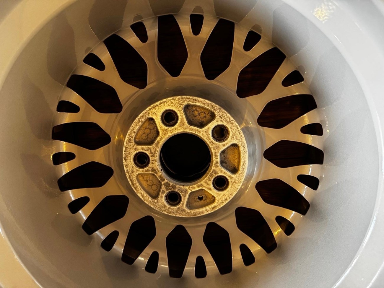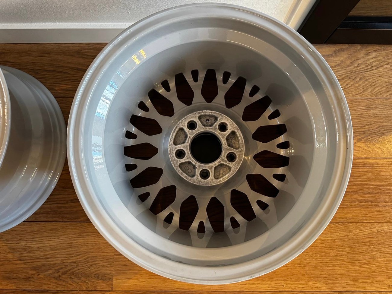 This set is particularly rare with the 10" rear set. The front wheels measures 8" wide with an offset of +18 while the rear pair measure 10" wide with a +11 offset. and feature a 5x112mm bolt pattern. Pictures of the wheels with the center caps are shown both on and off.