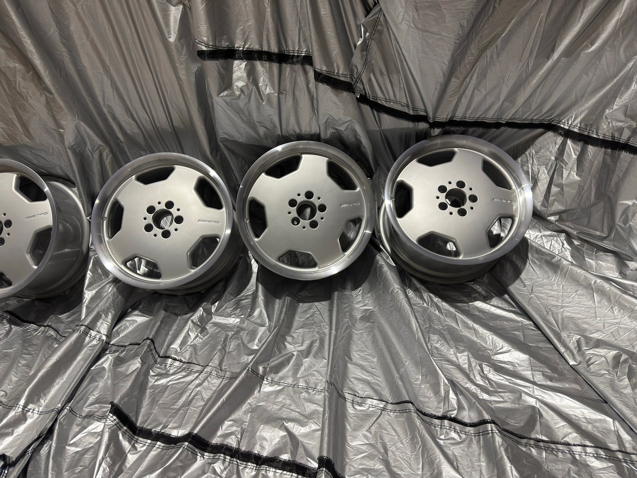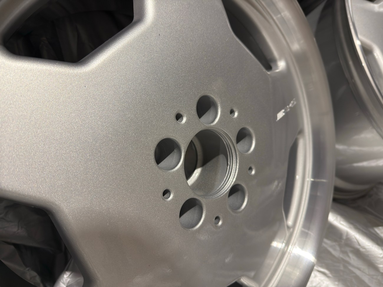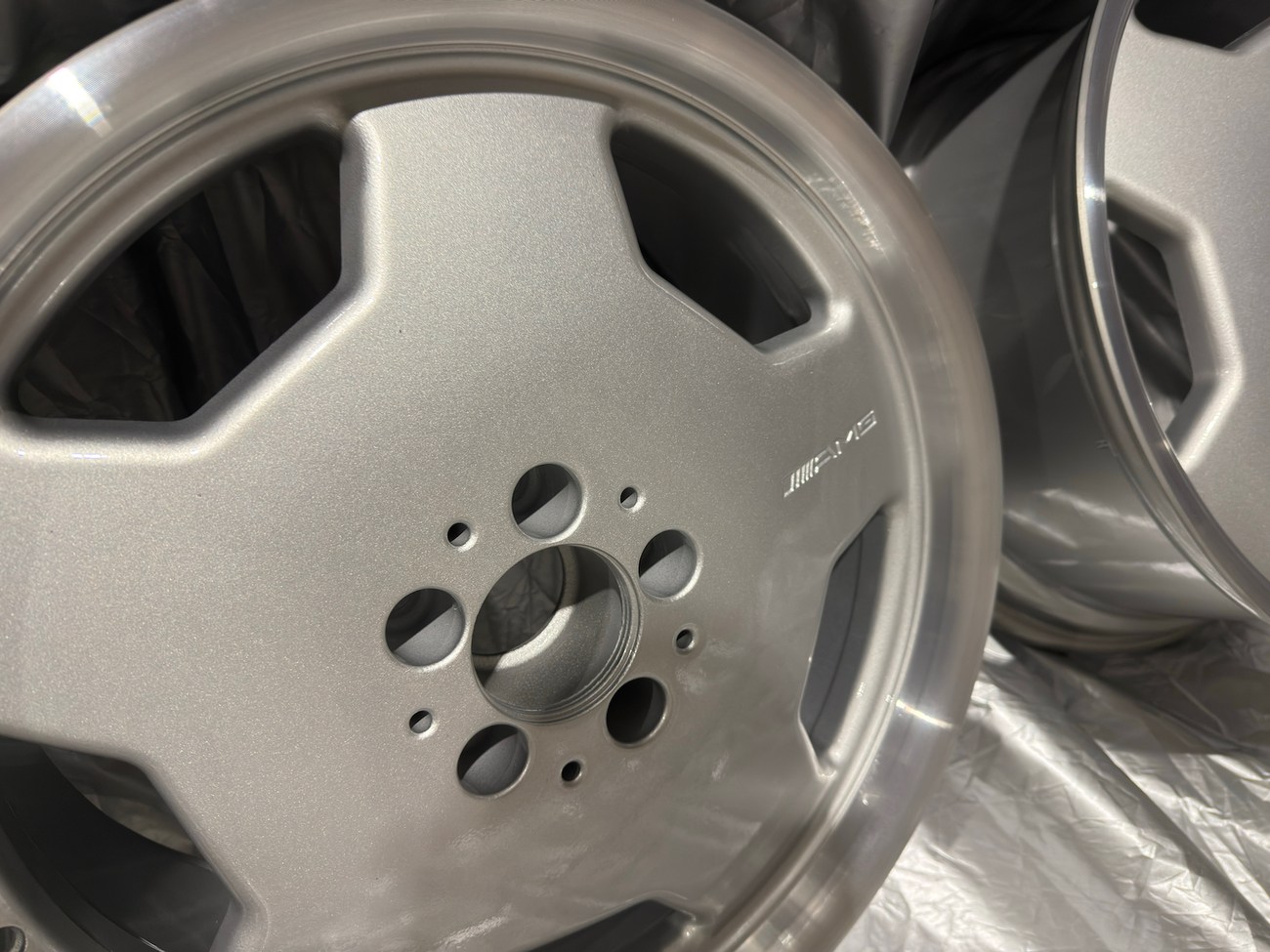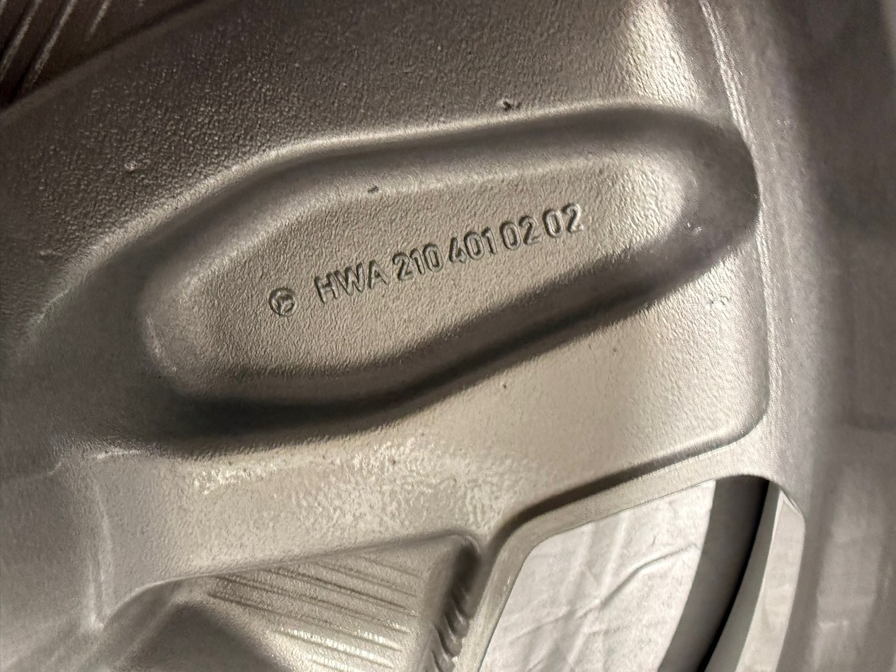 These staggered 18″ AMG Aero II Monoblock wheels measure 8″ wide in the front and 9" wide in the rear, and were manufactured by Mercedes-Benz for use on W210 and R129 Mercedes-Benz AMG vehicles. The faces are finished in silver with polished lips and show AMG HWA stamped part numbers on the back. Dimensions, offsets, and other manufacturer casting marks are present on each wheel. Each wheel has been professionally refinished in preparation for the sale. These AMG monoblock wheels are now offered by the seller at No Reserve in Santo Domingo, Dominican Republic with worldwide shipping options available.