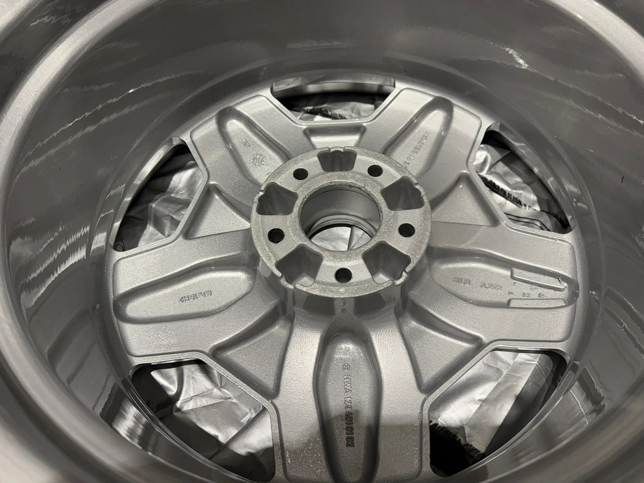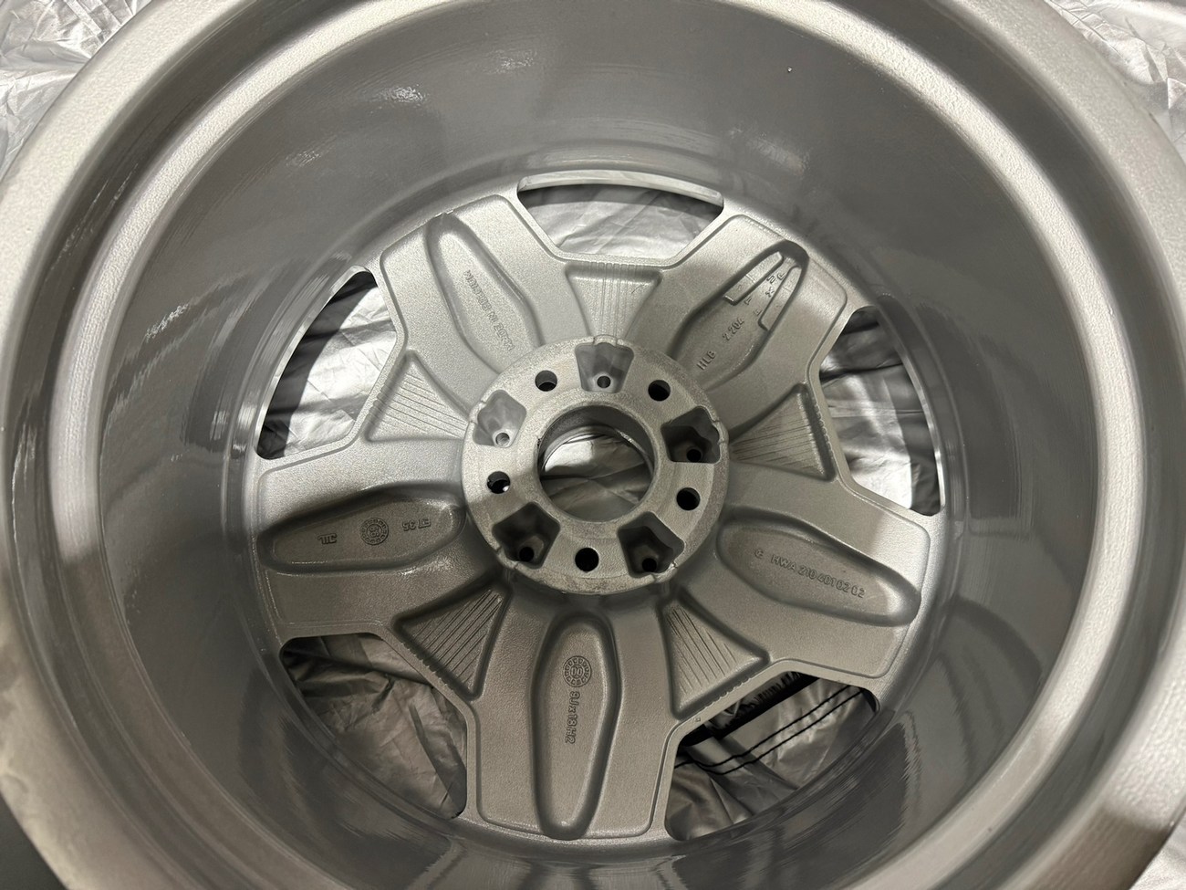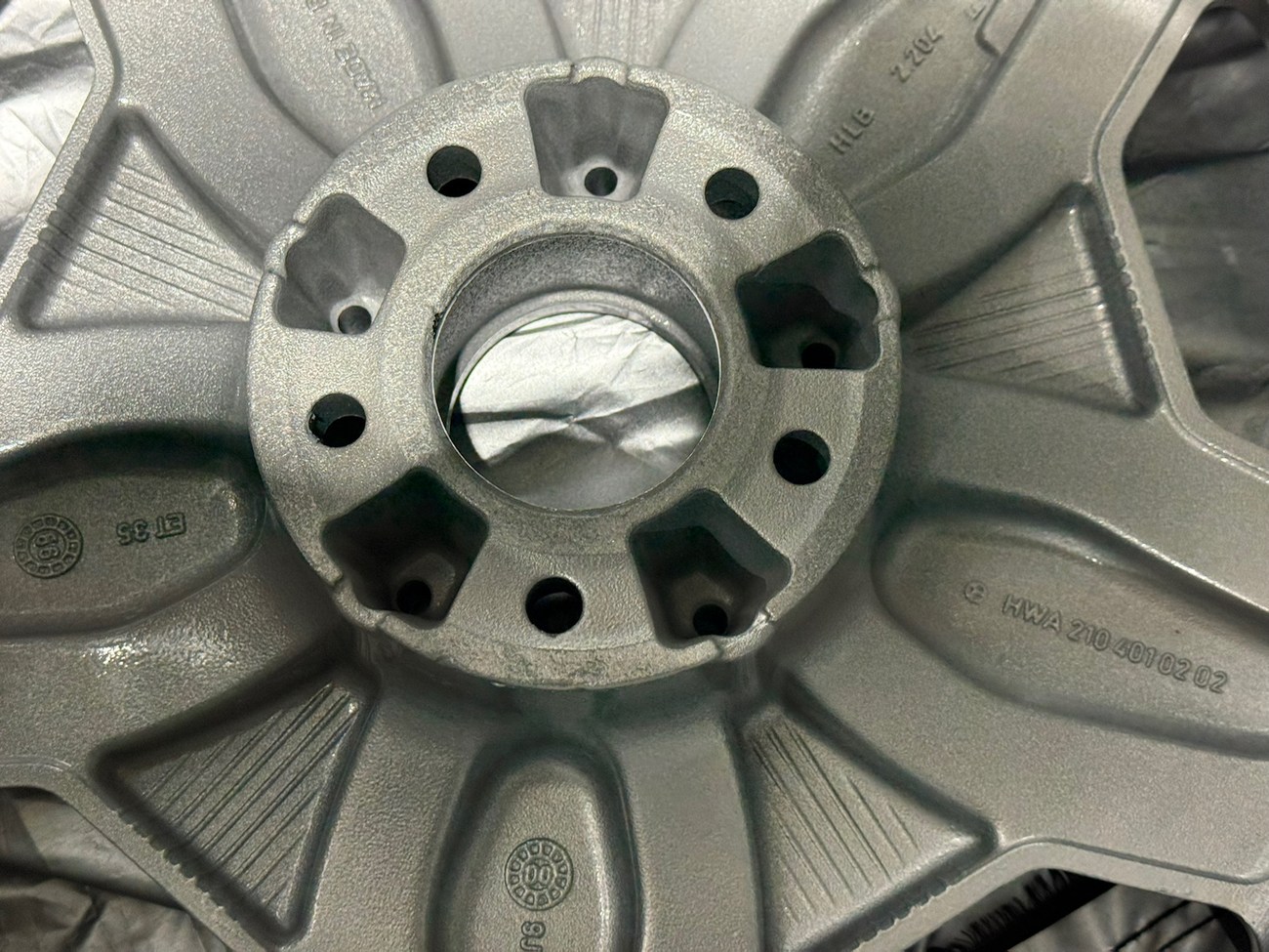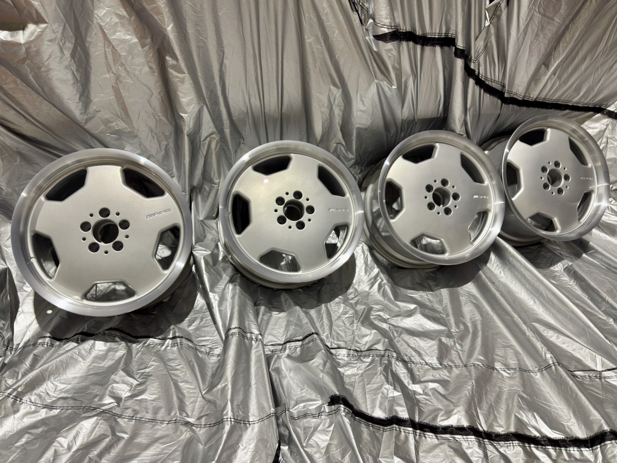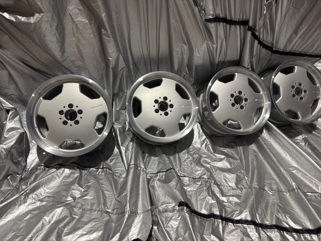These staggered 18″ AMG Aero II Monoblock wheels measure 8″ wide in the front and 9" wide in the rear, and were manufactured by Mercedes-Benz for use on W210 and R129 Mercedes-Benz AMG vehicles. The faces are finished in silver with polished lips and show AMG HWA stamped part numbers on the back. Dimensions, offsets, and other manufacturer casting marks are present on each wheel. Each wheel has been professionally refinished in preparation for the sale. These AMG monoblock wheels are now offered by the seller at No Reserve in Santo Domingo, Dominican Republic with worldwide shipping options available.