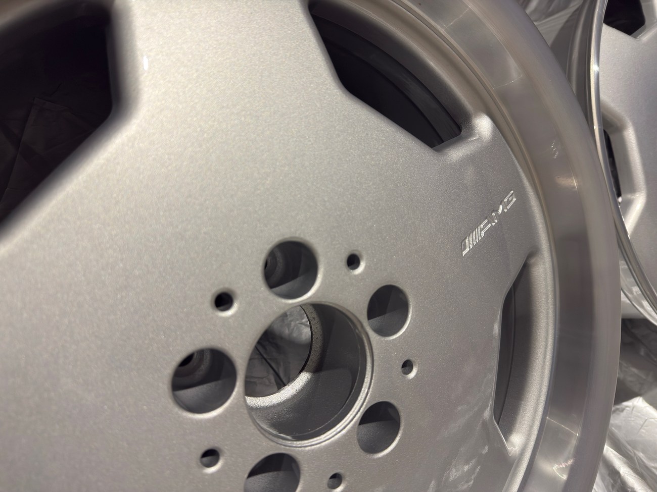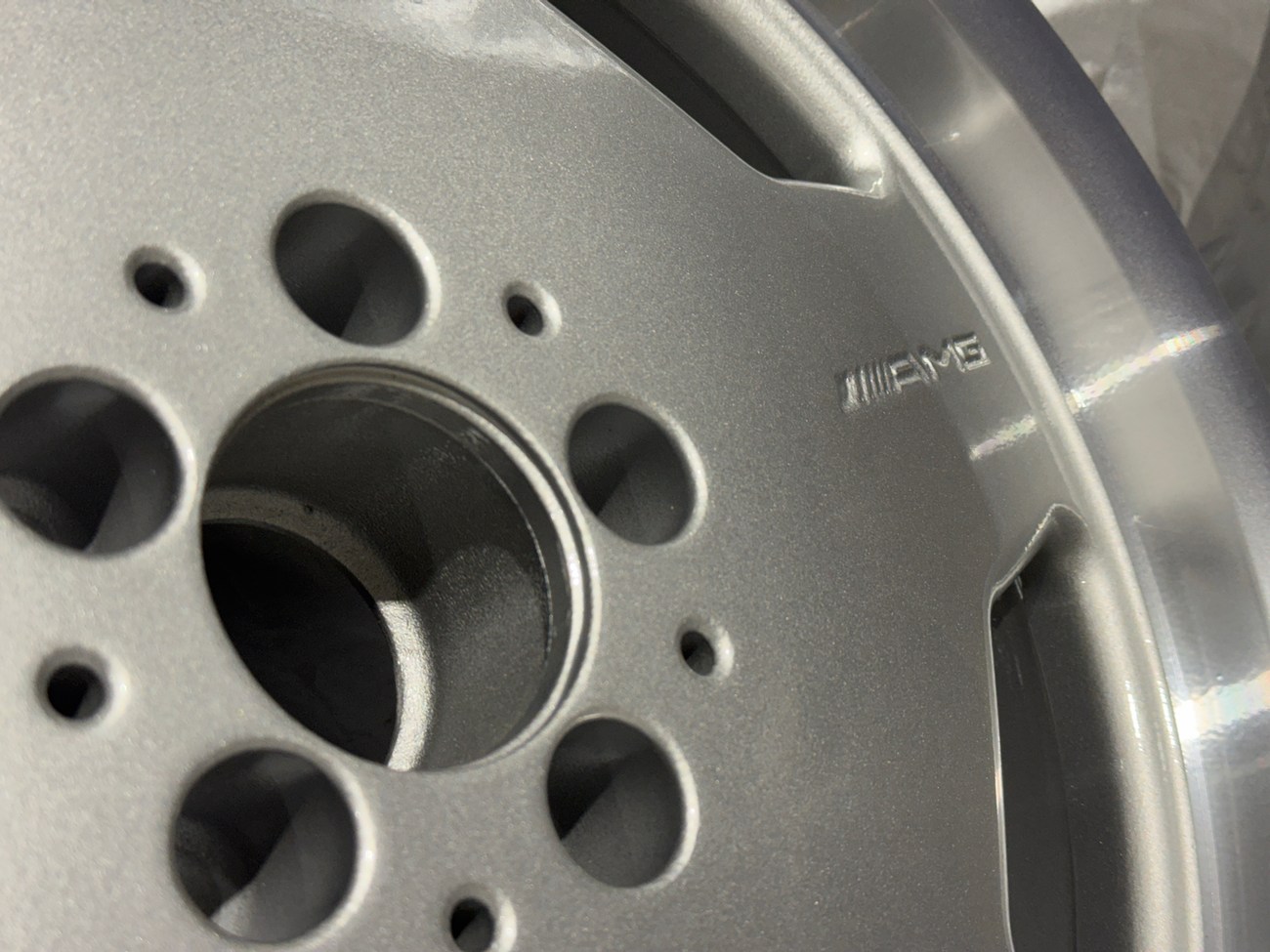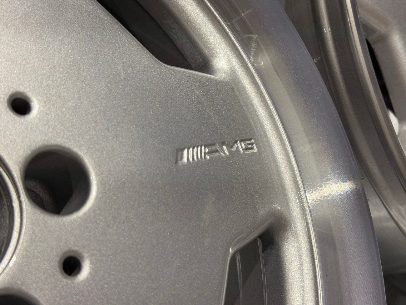 These 5-hole monoblock Aero II wheels have been professionally refinished and show in excellent condition. The wheels feature silver painted faces with polished lips. Up close photos of each face are provided in the gallery showing AMG engraved on the fronts.