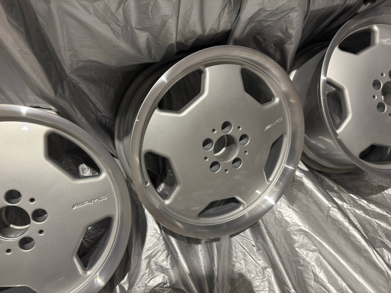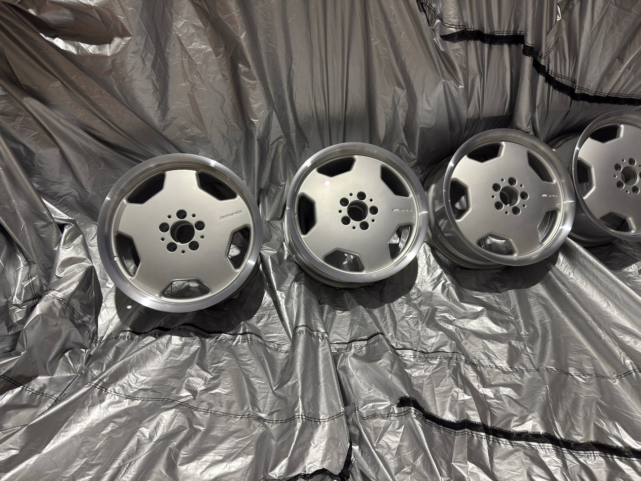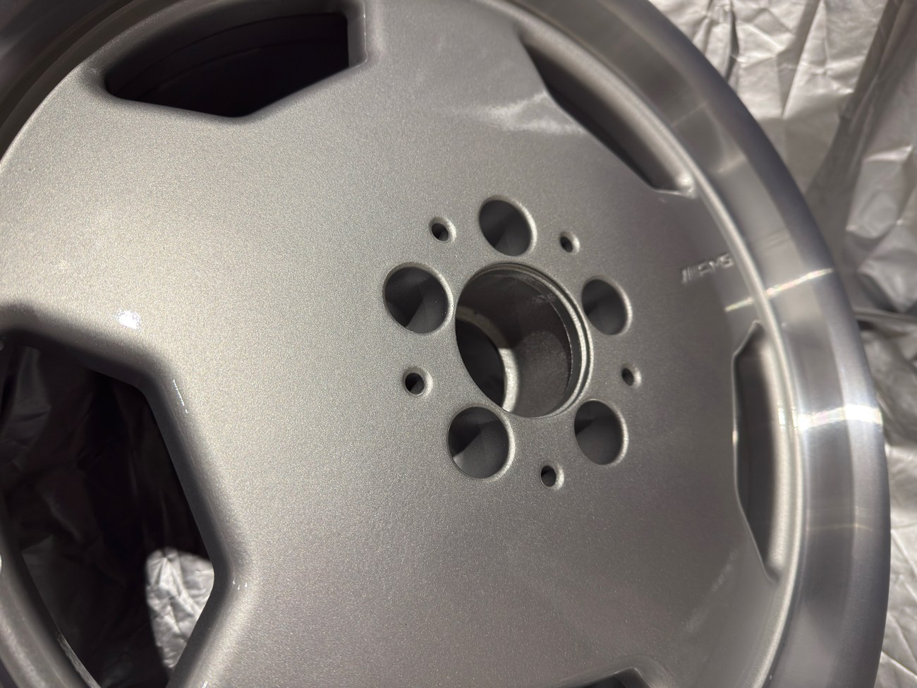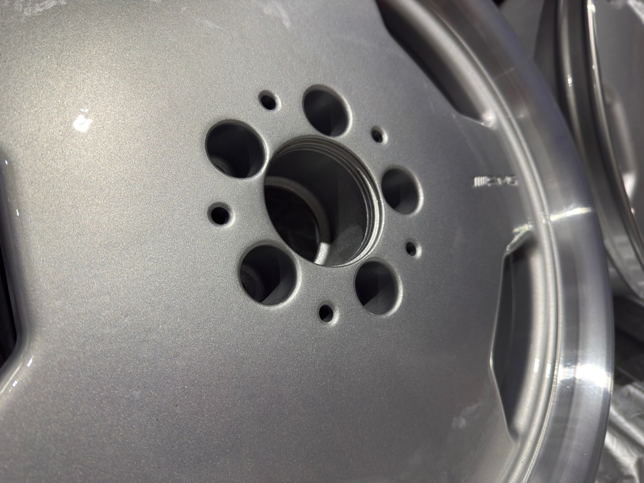 These 5-hole monoblock Aero II wheels have been professionally refinished and show in excellent condition. The wheels feature silver painted faces with polished lips. Up close photos of each face are provided in the gallery showing AMG engraved on the fronts.